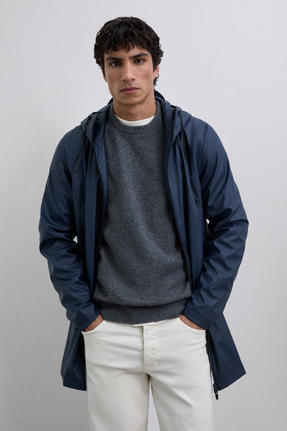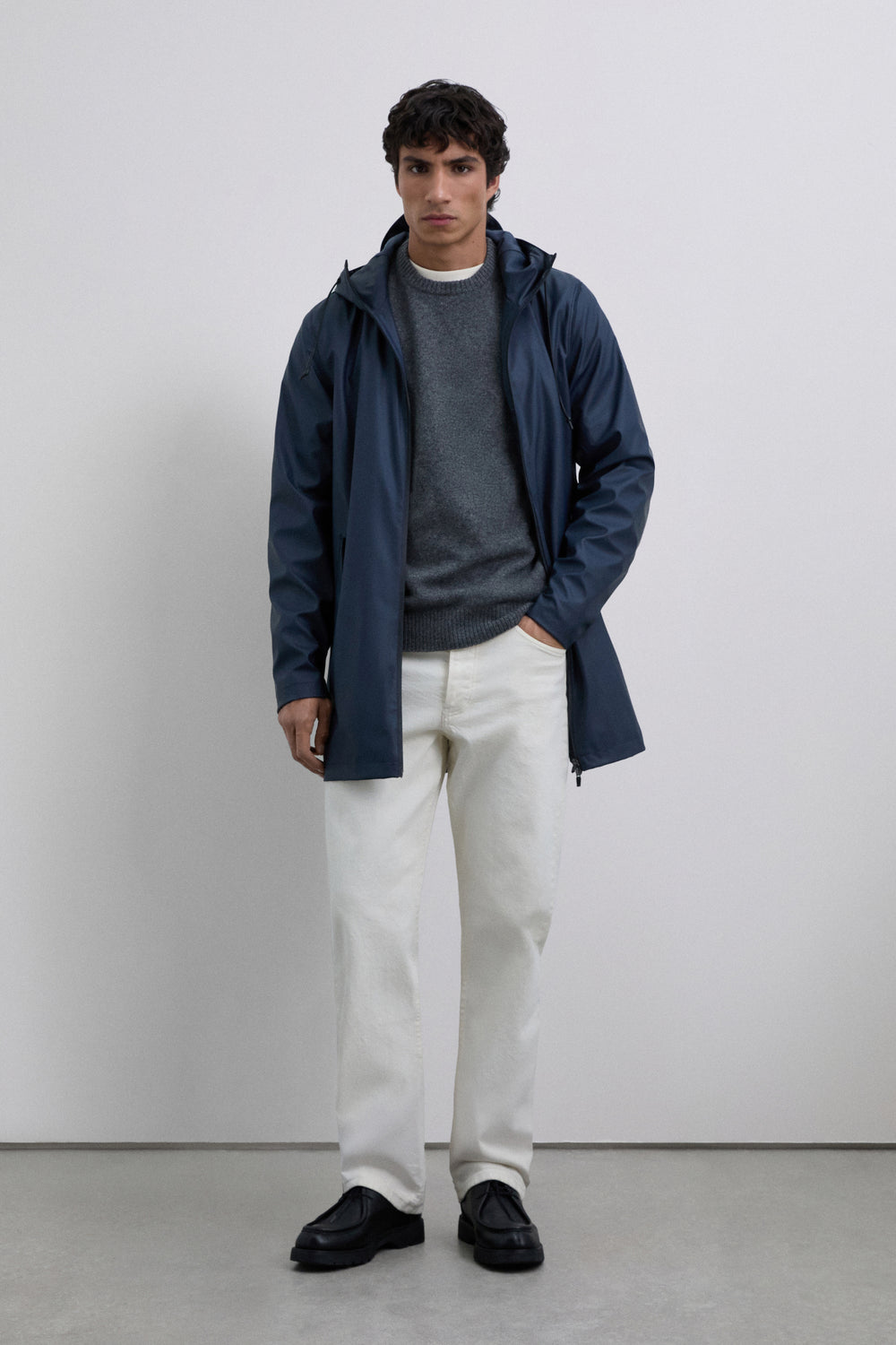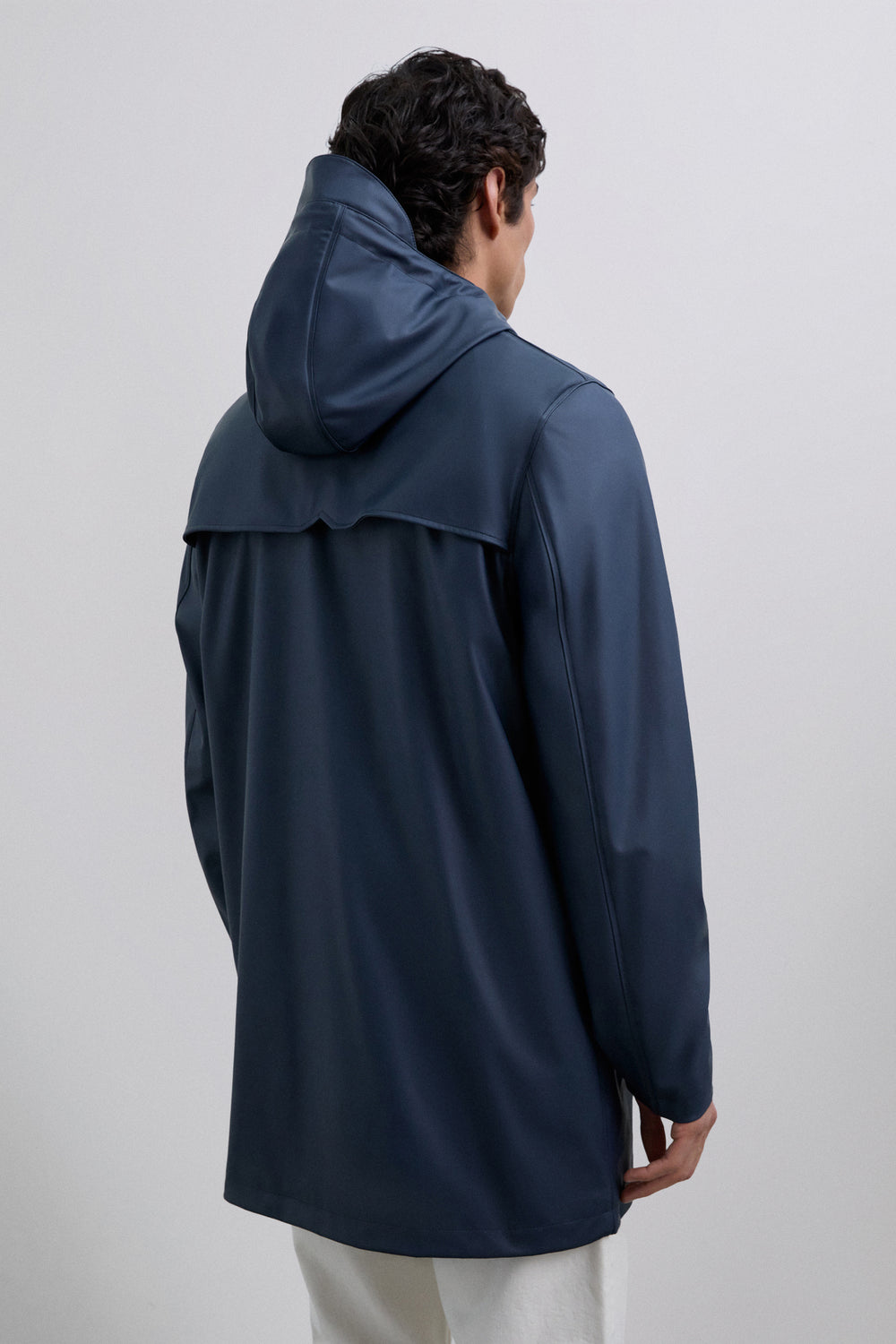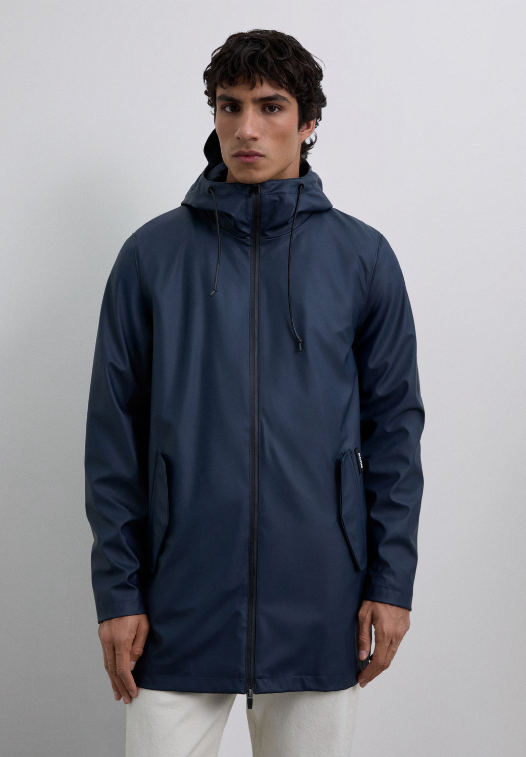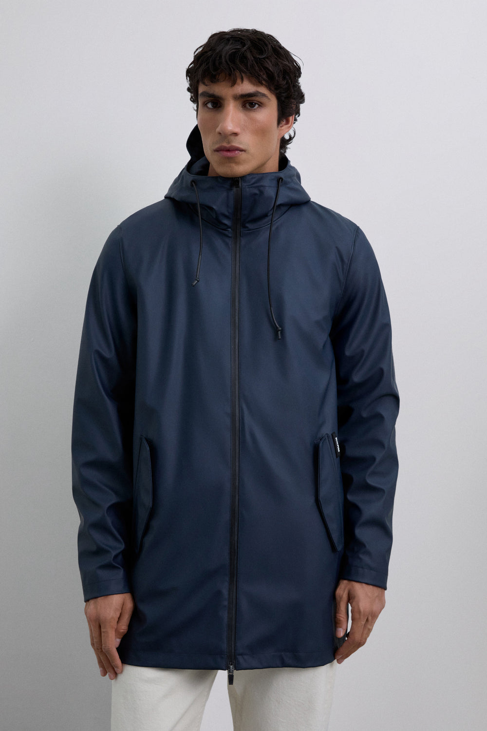 Chaqueta impermeable. Cuello con capucha ajustable con cordón. Cierre con cremallera de doble carro termosellada. Manga larga. Bolsillos laterales con tapeta y snap. Detalle logo engomado a contraste en frontal inferior y calavera a tono en manga.