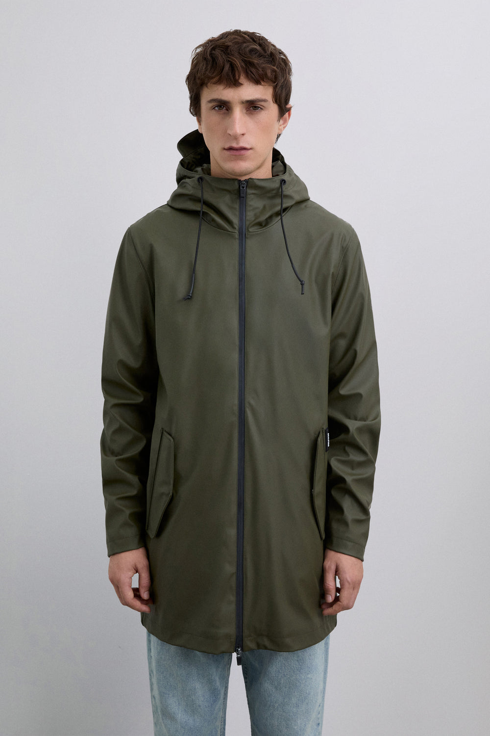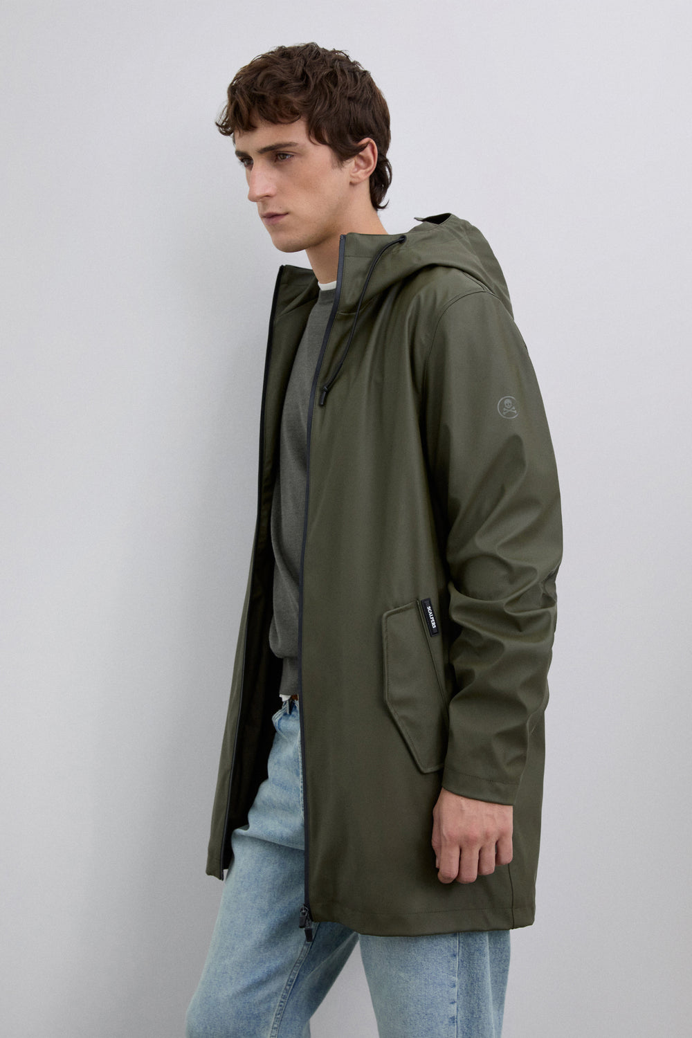 Chaqueta impermeable. Cuello con capucha ajustable con cordón. Cierre con cremallera de doble carro termosellada. Manga larga. Bolsillos laterales con tapeta y snap. Detalle logo engomado a contraste en frontal inferior y calavera a tono en manga.