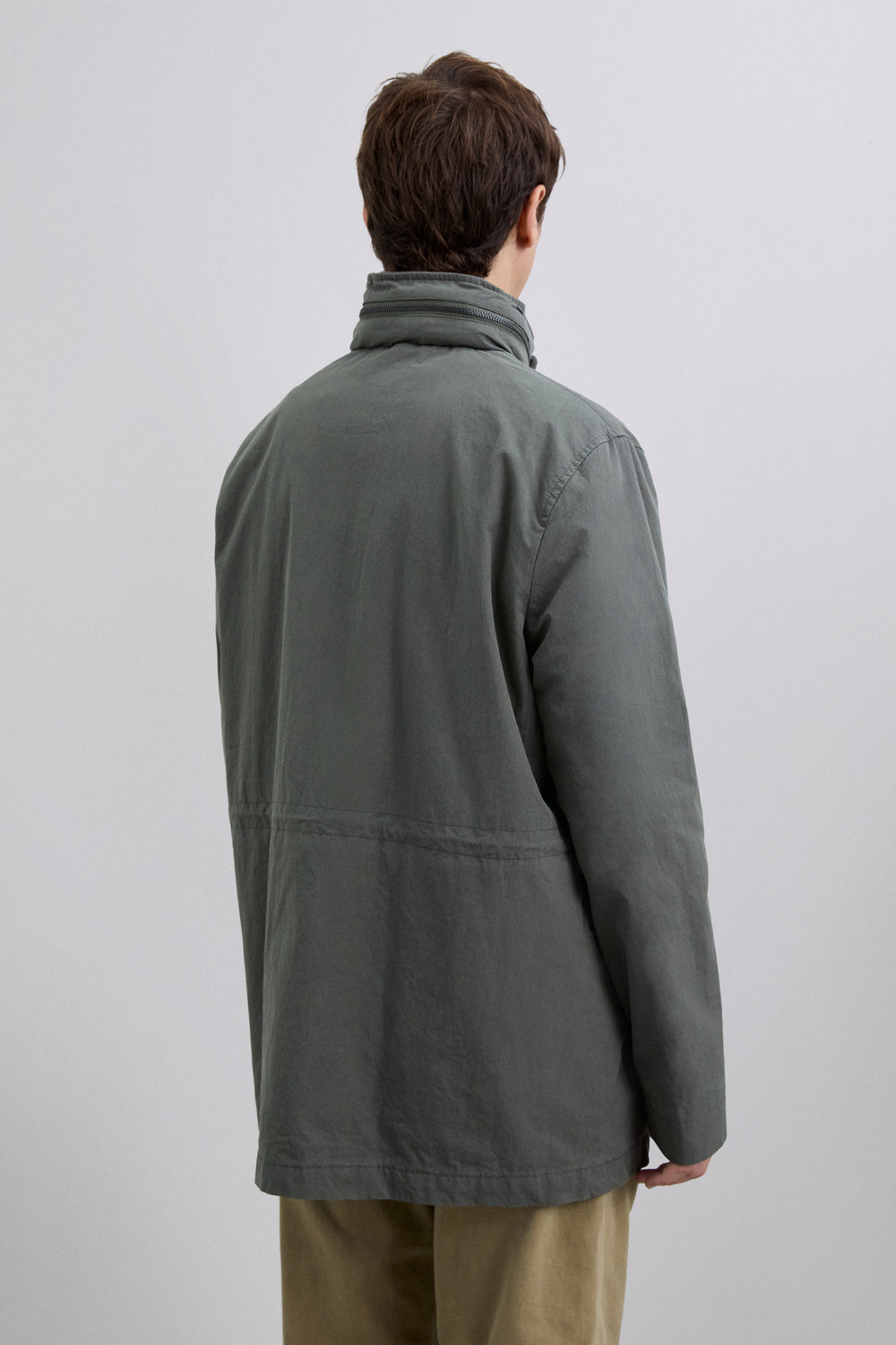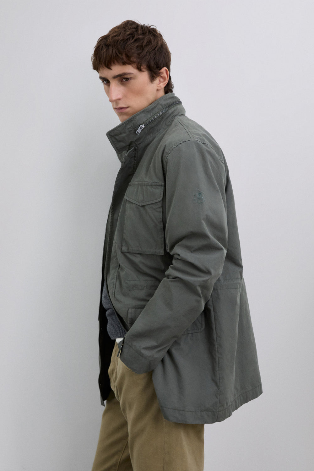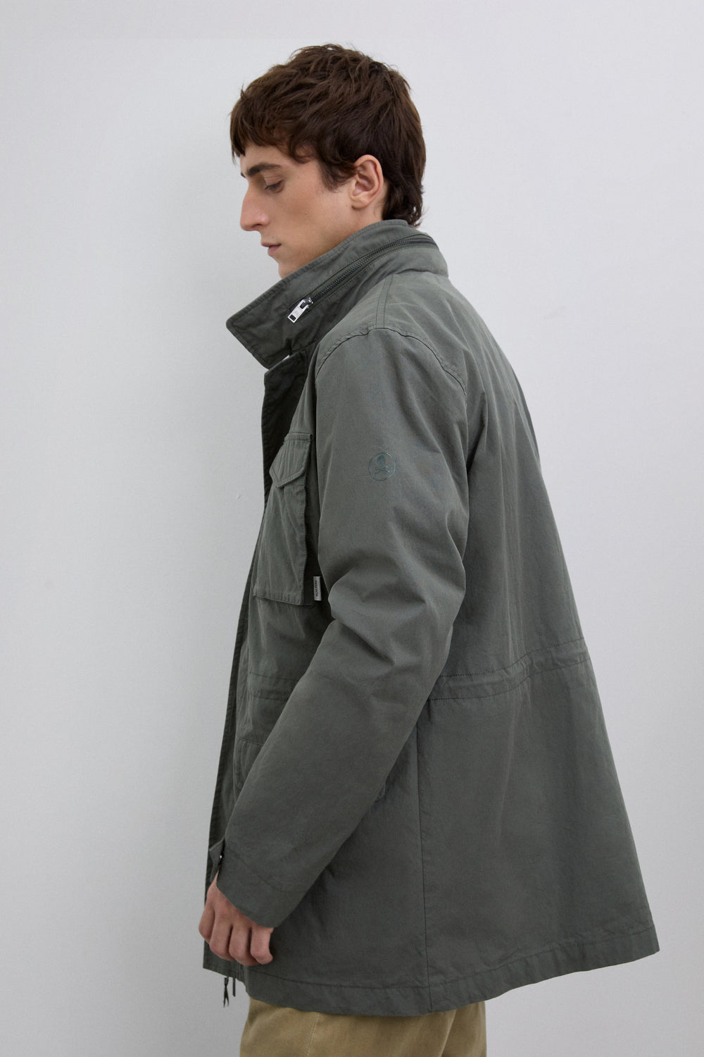 Parka estilo militar confeccionada en algodón BCI. Cuatro bolsillos frontales. Detalle de cierre en el cuello. Ajustador interior con cordón. Cierre delantero con cremallera. Capucha oculta en cuello. Detalle de etiqueta con logo.
