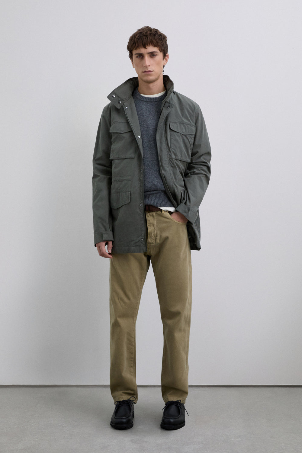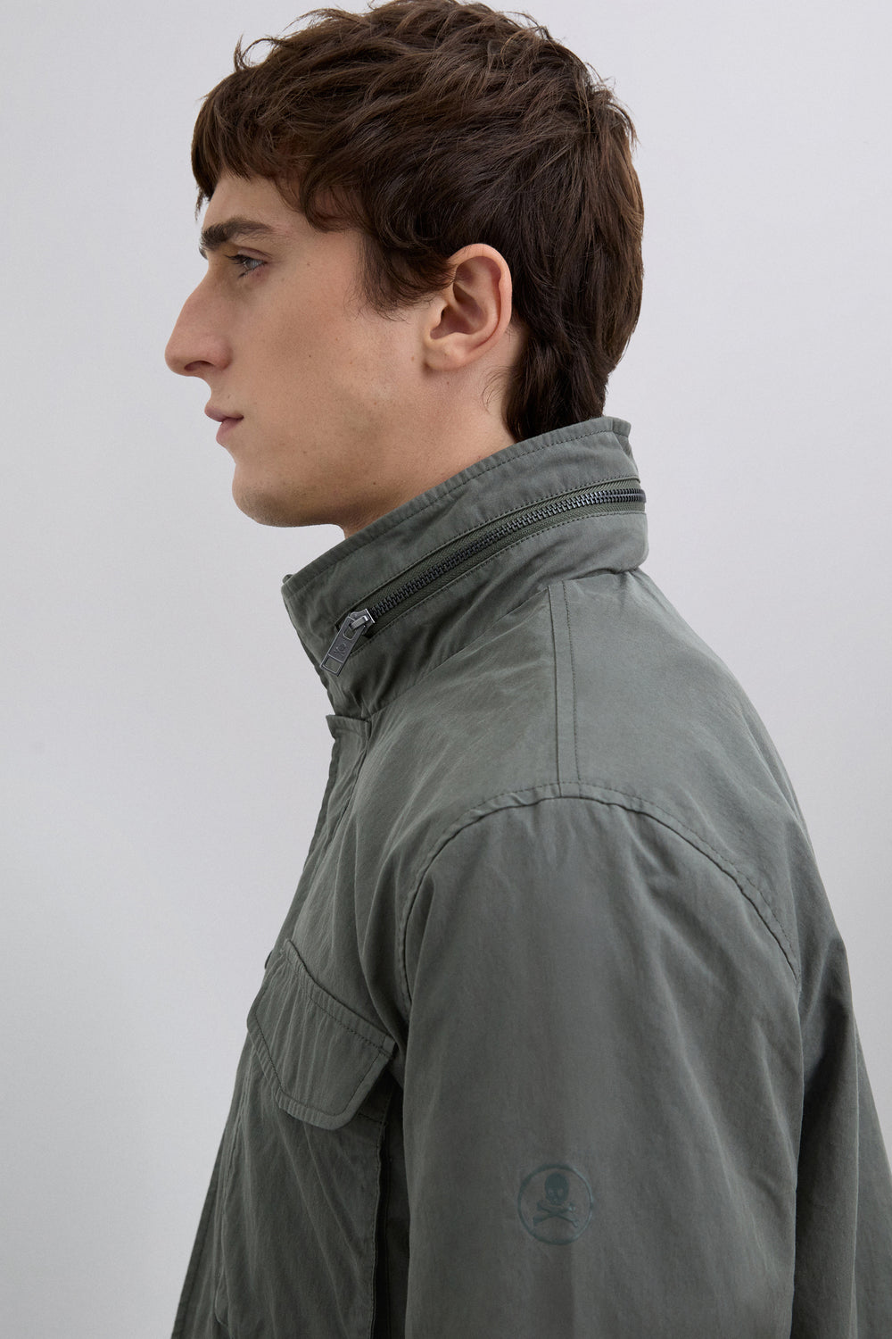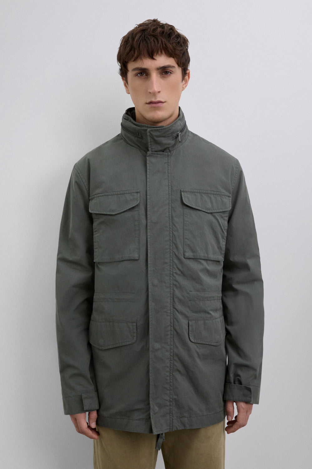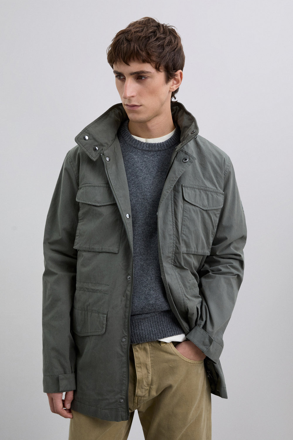 Parka estilo militar confeccionada en algodón BCI. Cuatro bolsillos frontales. Detalle de cierre en el cuello. Ajustador interior con cordón. Cierre delantero con cremallera. Capucha oculta en cuello. Detalle de etiqueta con logo.