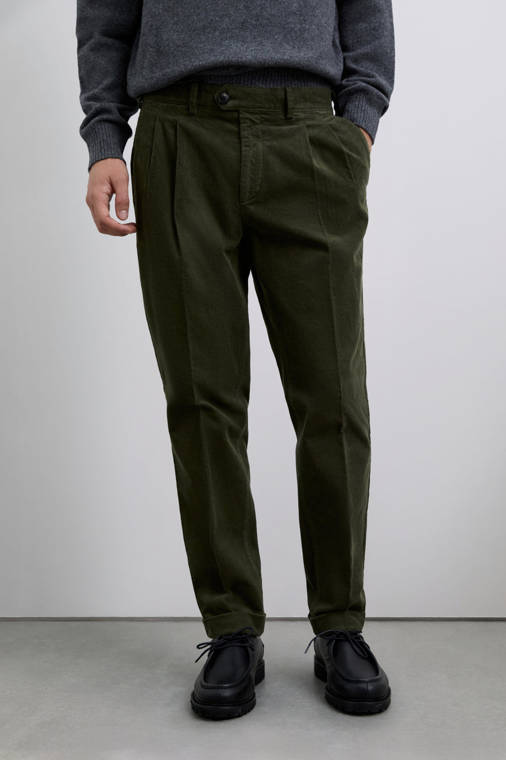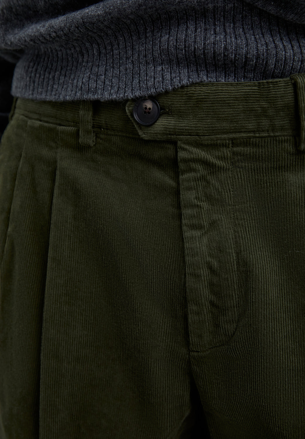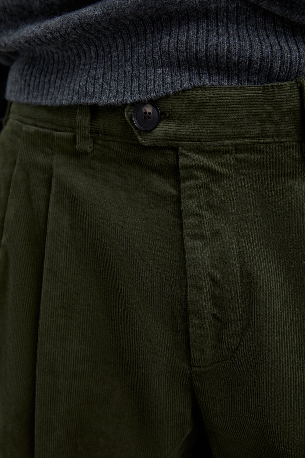 Pantalón chino de pana confeccionado en algodón. Corte loose fit con pinzas. Cierre con cremallera oculta y botón prolongado en cintura. Bolsillos laterales y traseros.