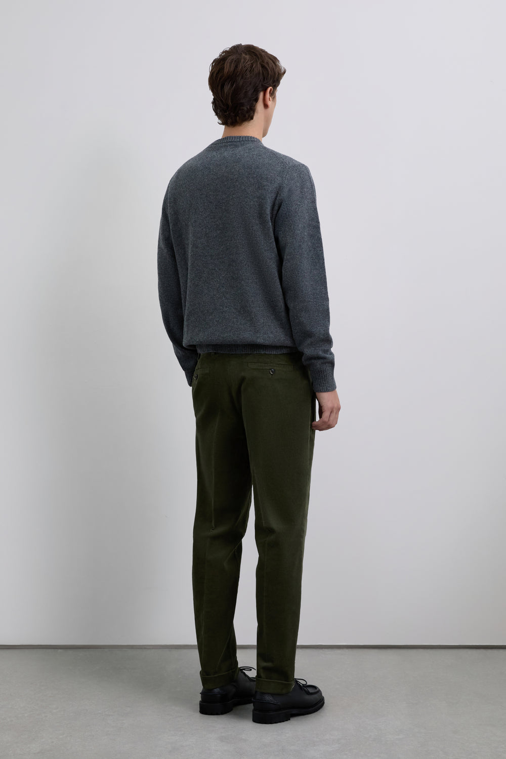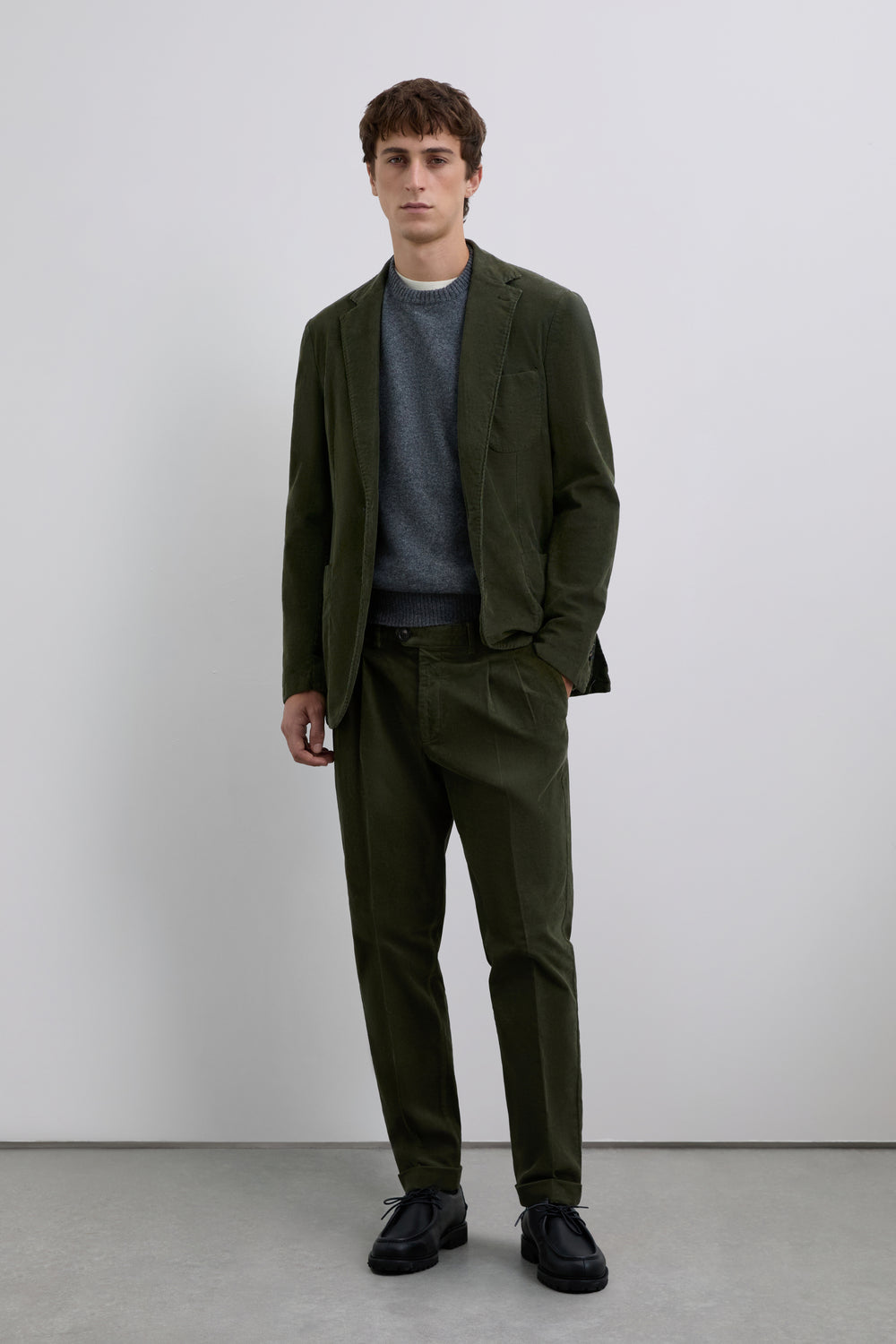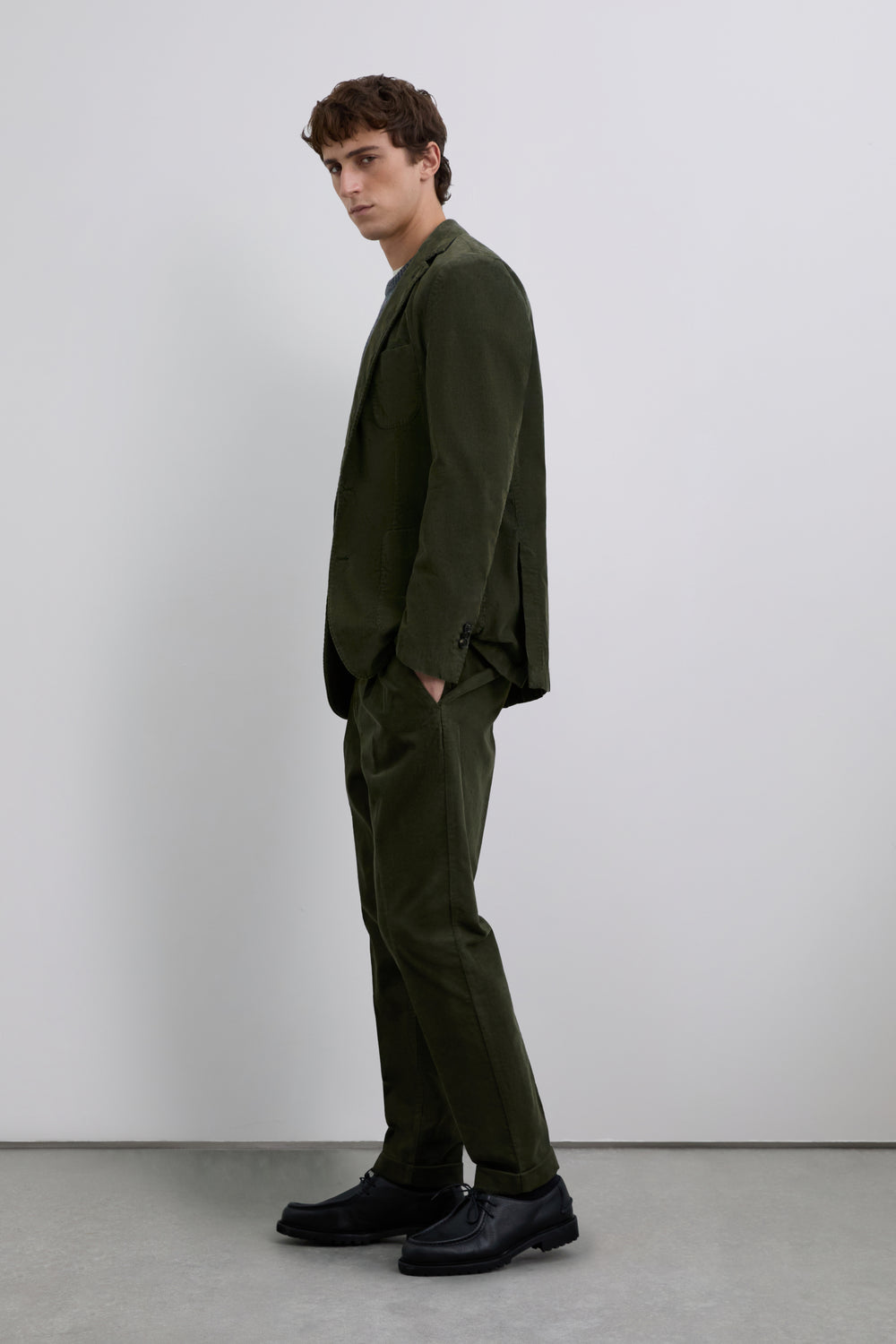 Pantalón chino de pana confeccionado en algodón. Corte loose fit con pinzas. Cierre con cremallera oculta y botón prolongado en cintura. Bolsillos laterales y traseros.