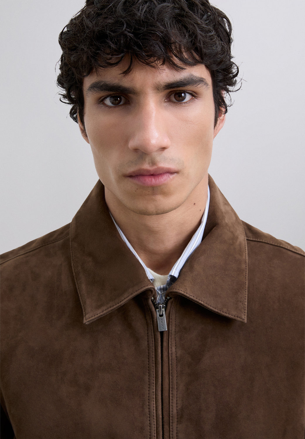 Cazadora confeccionada en 100% ante caprino. Cierre delantero con doble cremallera. Bajo y puños acanalados. Dos bolsillos en frontal con cierre por solapa.