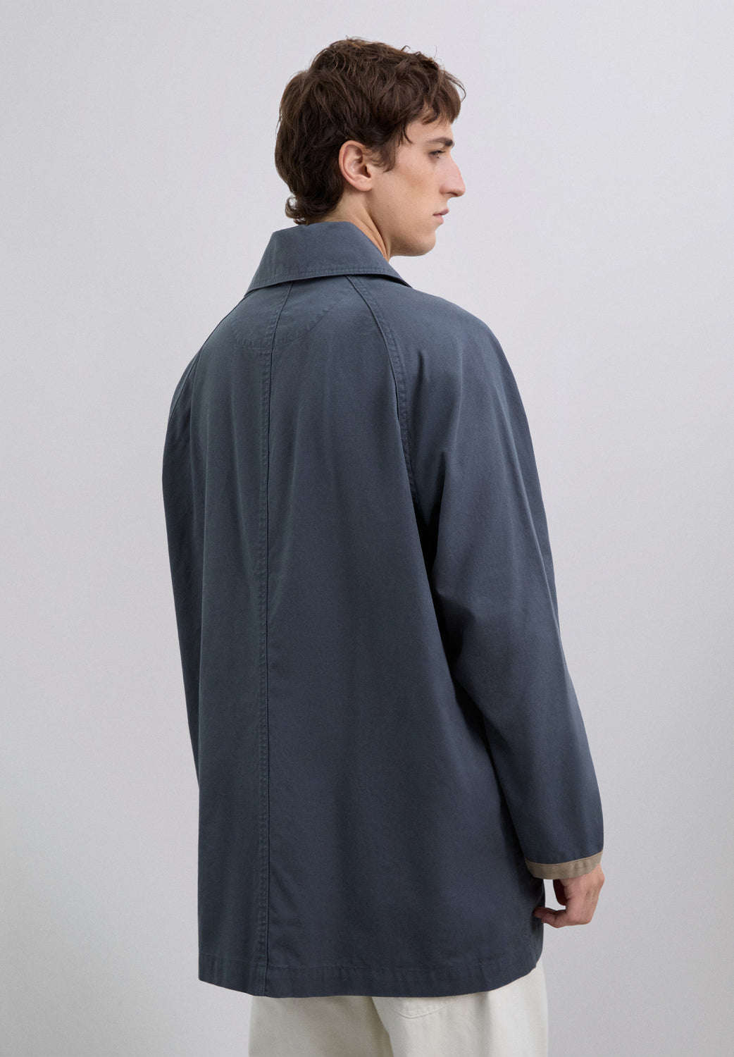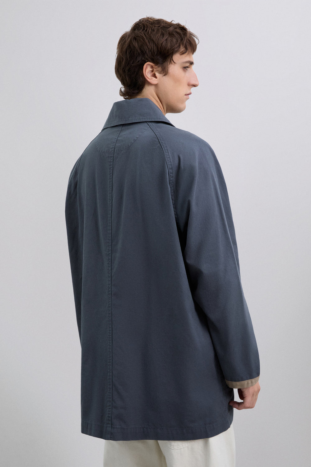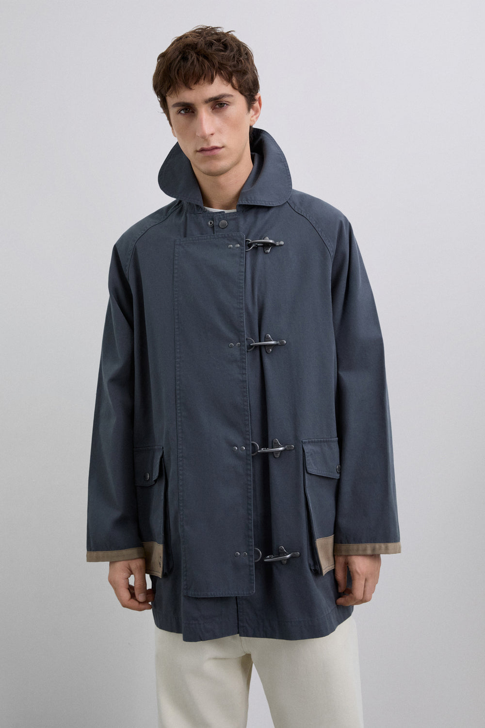 Chaqueta confeccionada en 100% algodón orgánico. Bolsillos de botón en frontal. Bolsillos laterales con detalles de ojales. Corte oversize. Cuello redondeado de estilo camisa. Manga ranglan. Cierre con broches y toggles. Vivos de ante en el bajo de la manga y en el borde inferior del bolsillo.