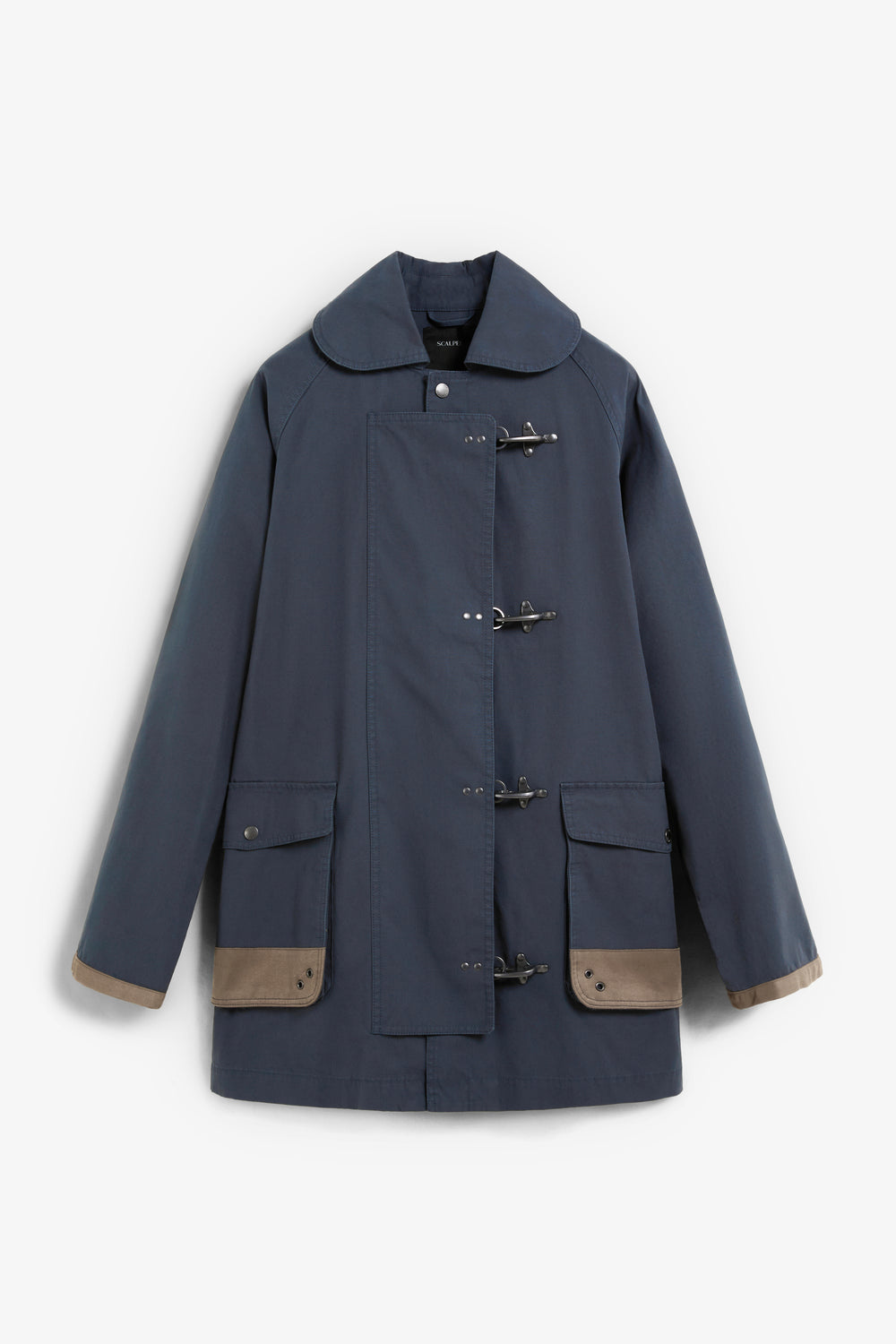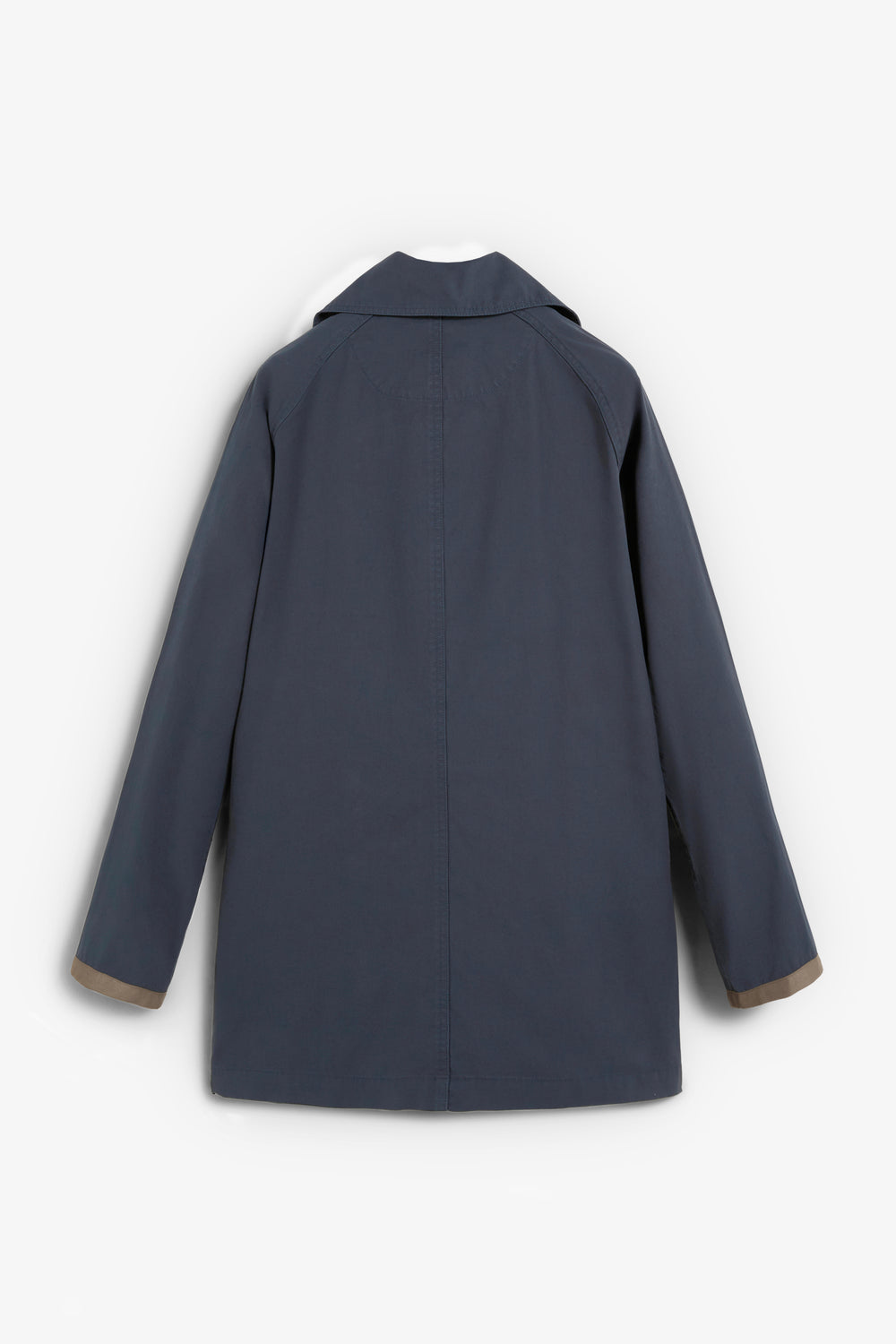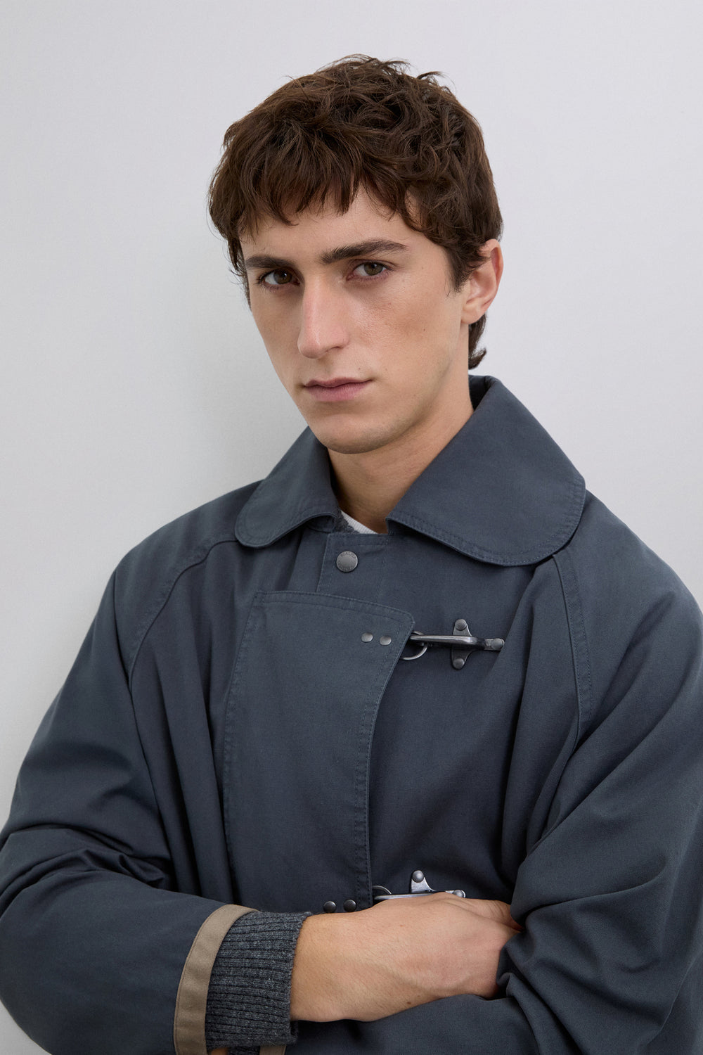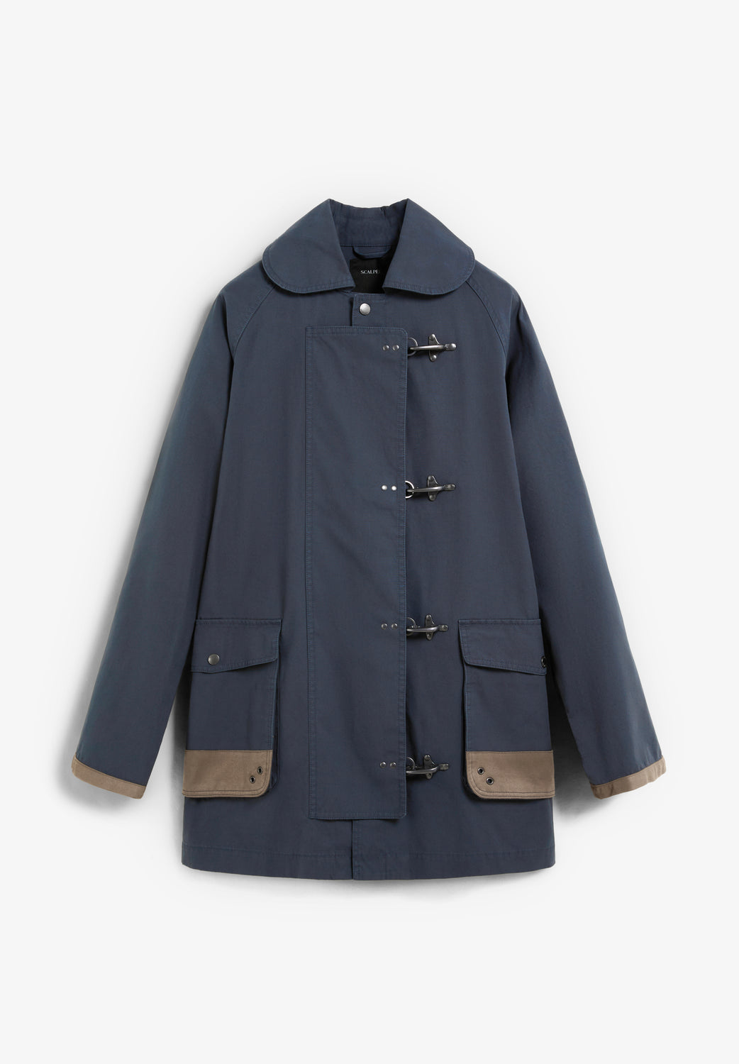 Chaqueta confeccionada en 100% algodón orgánico. Bolsillos de botón en frontal. Bolsillos laterales con detalles de ojales. Corte oversize. Cuello redondeado de estilo camisa. Manga ranglan. Cierre con broches y toggles. Vivos de ante en el bajo de la manga y en el borde inferior del bolsillo.