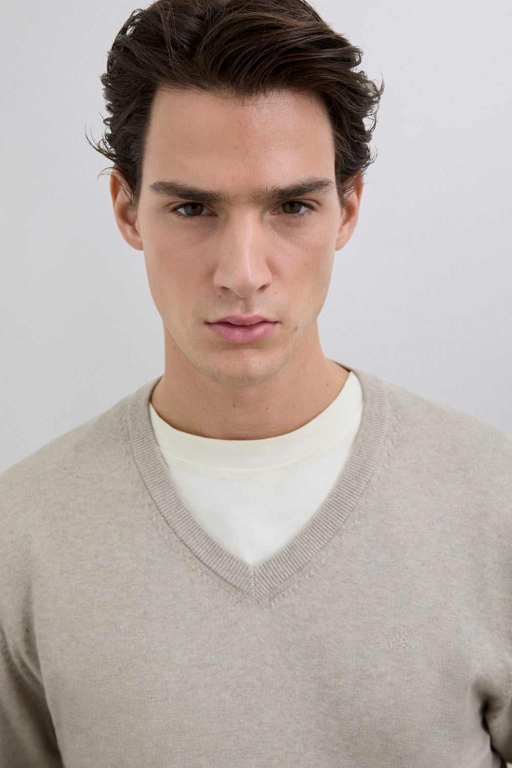 Jersey confeccionado en mezcla de algodón y cashmere. Manga larga. Cuello en pico. Acabados en rib. Detalle de logo bordado a tono en pecho.