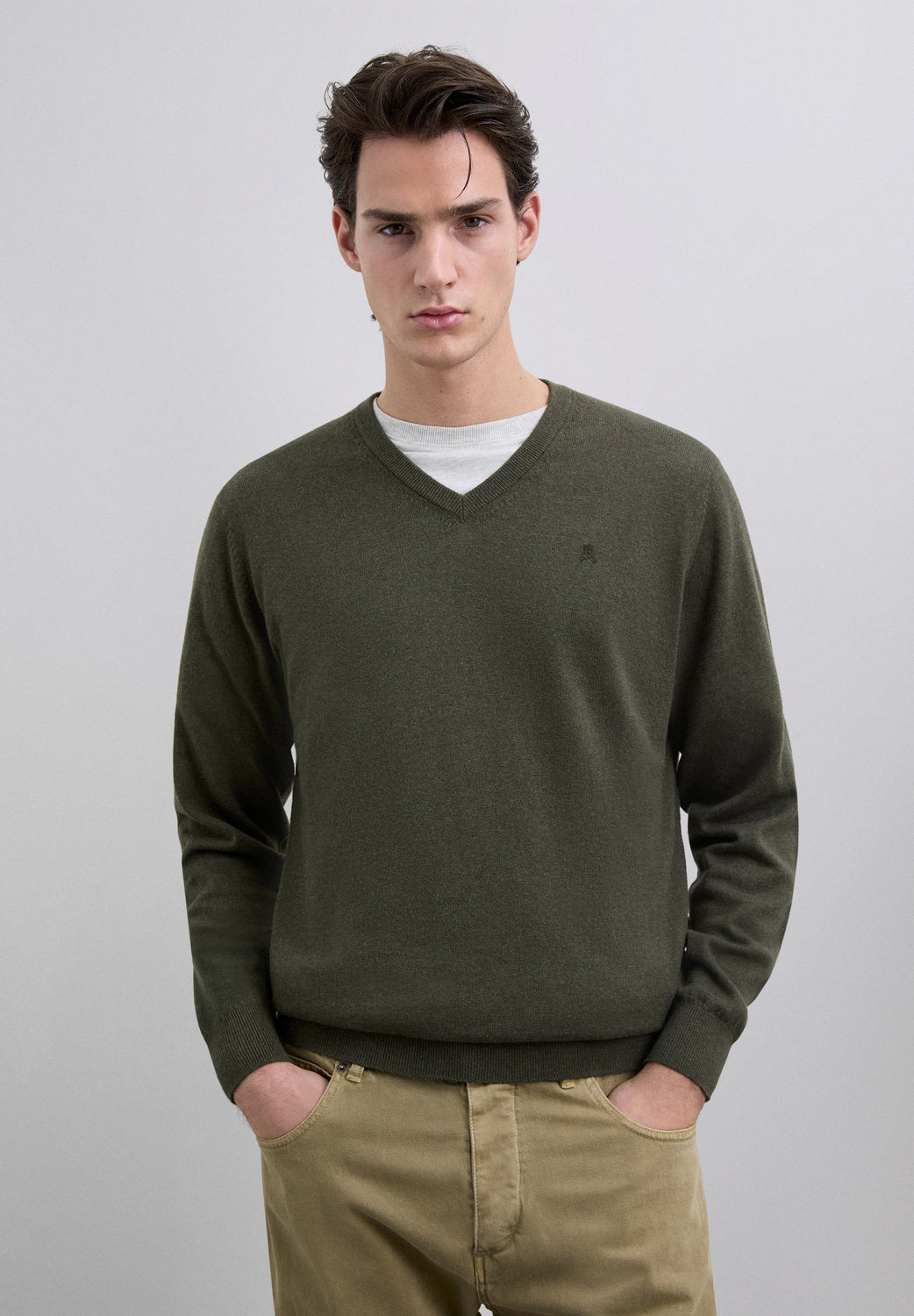 Jersey confeccionado en mezcla de algodón y cashmere. Manga larga. Cuello en pico. Acabados en rib. Detalle de logo bordado a tono en pecho.