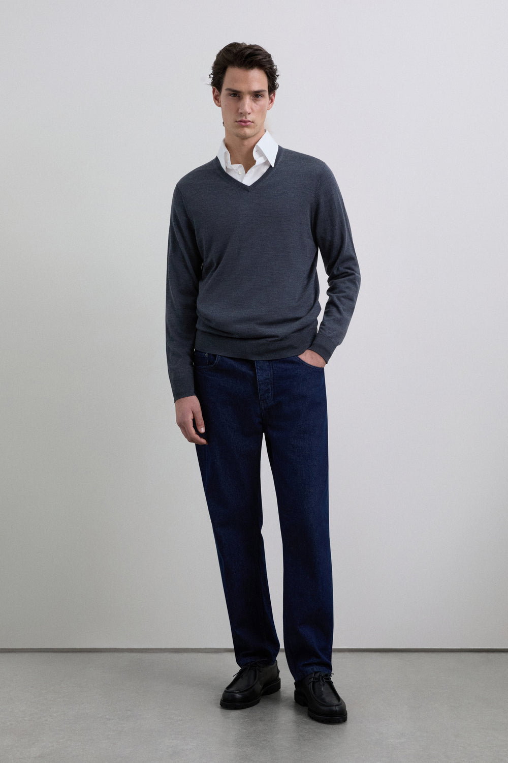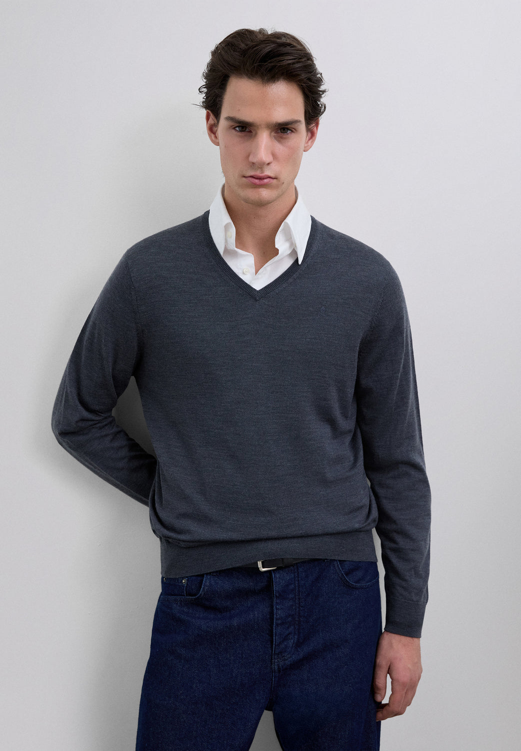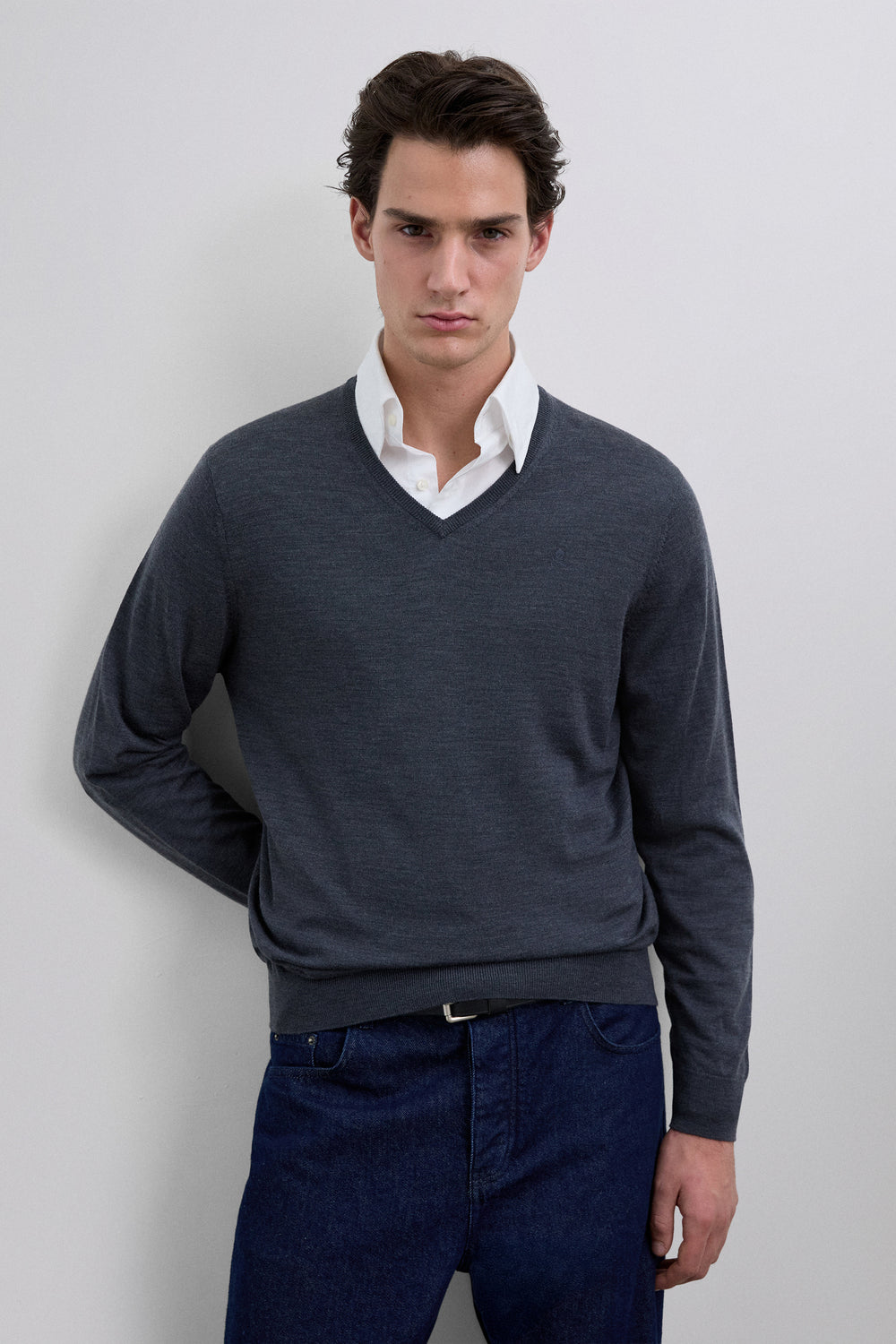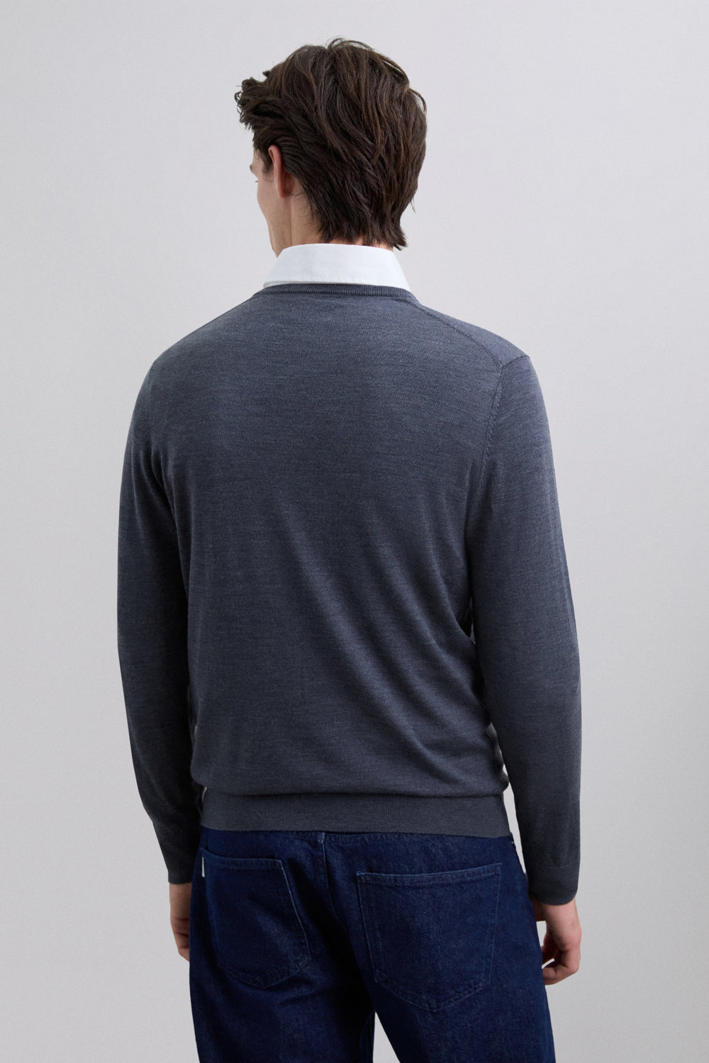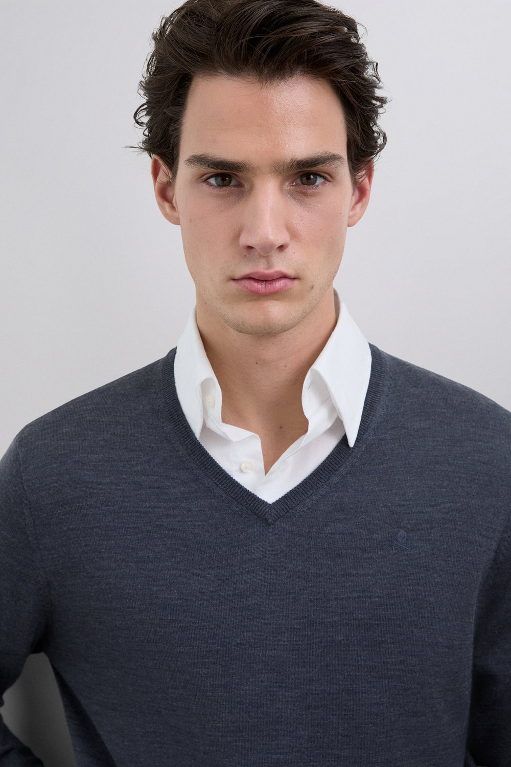 Jersey confeccionado en 100% lana merino. Regular Fit. Cuello en pico. Manga larga. Detalle de calavera bordada a tono en el pecho. Acabados en canalé.