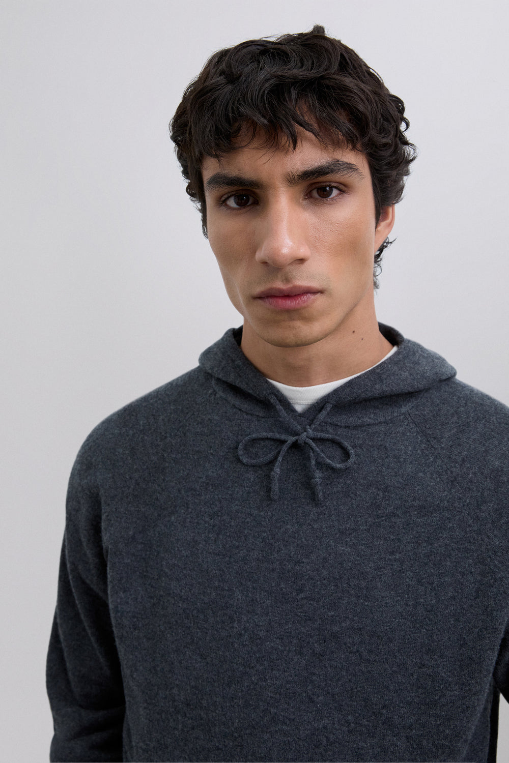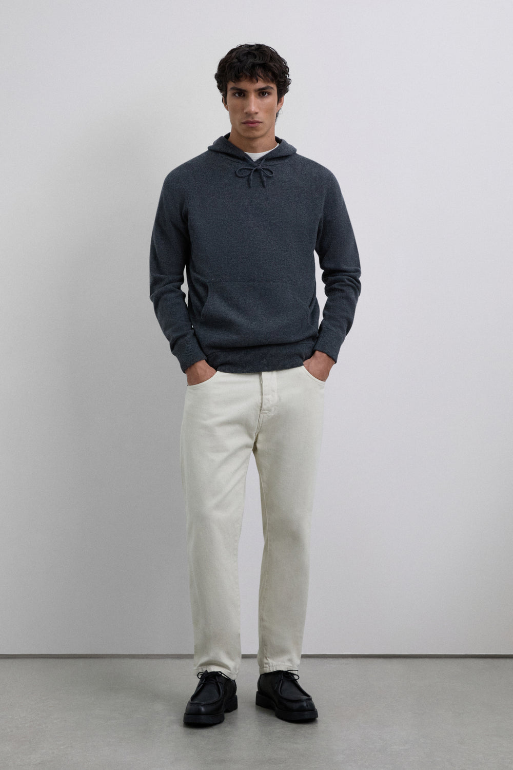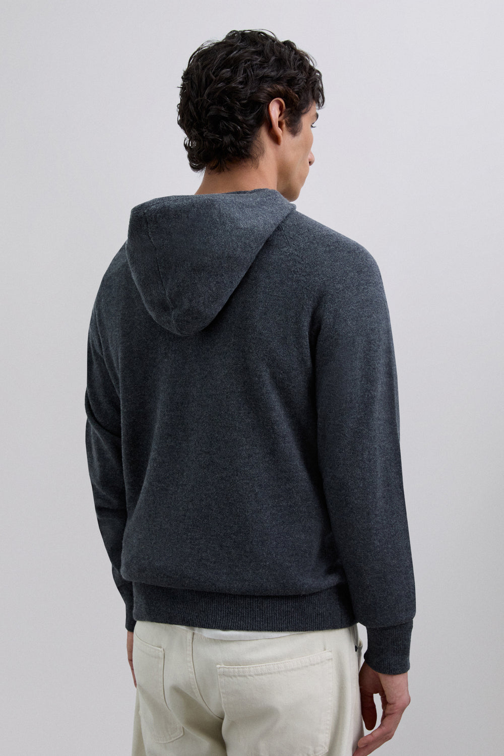 Jersey confeccionado en 100% lana merino. Capucha ajustable mediante cordones. Manga larga. Bolsillo frontal estilo canguro. Acabados canalé en puño y cintura.