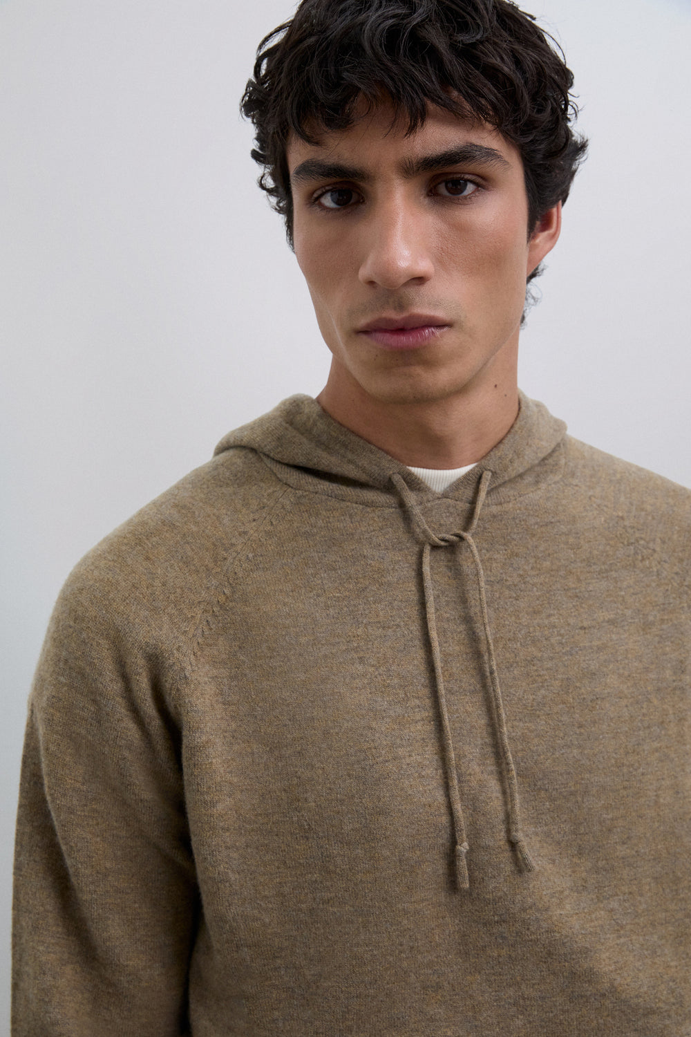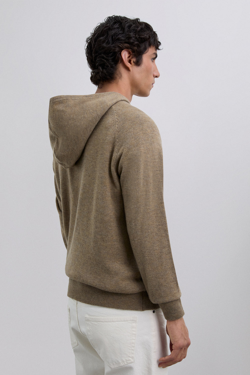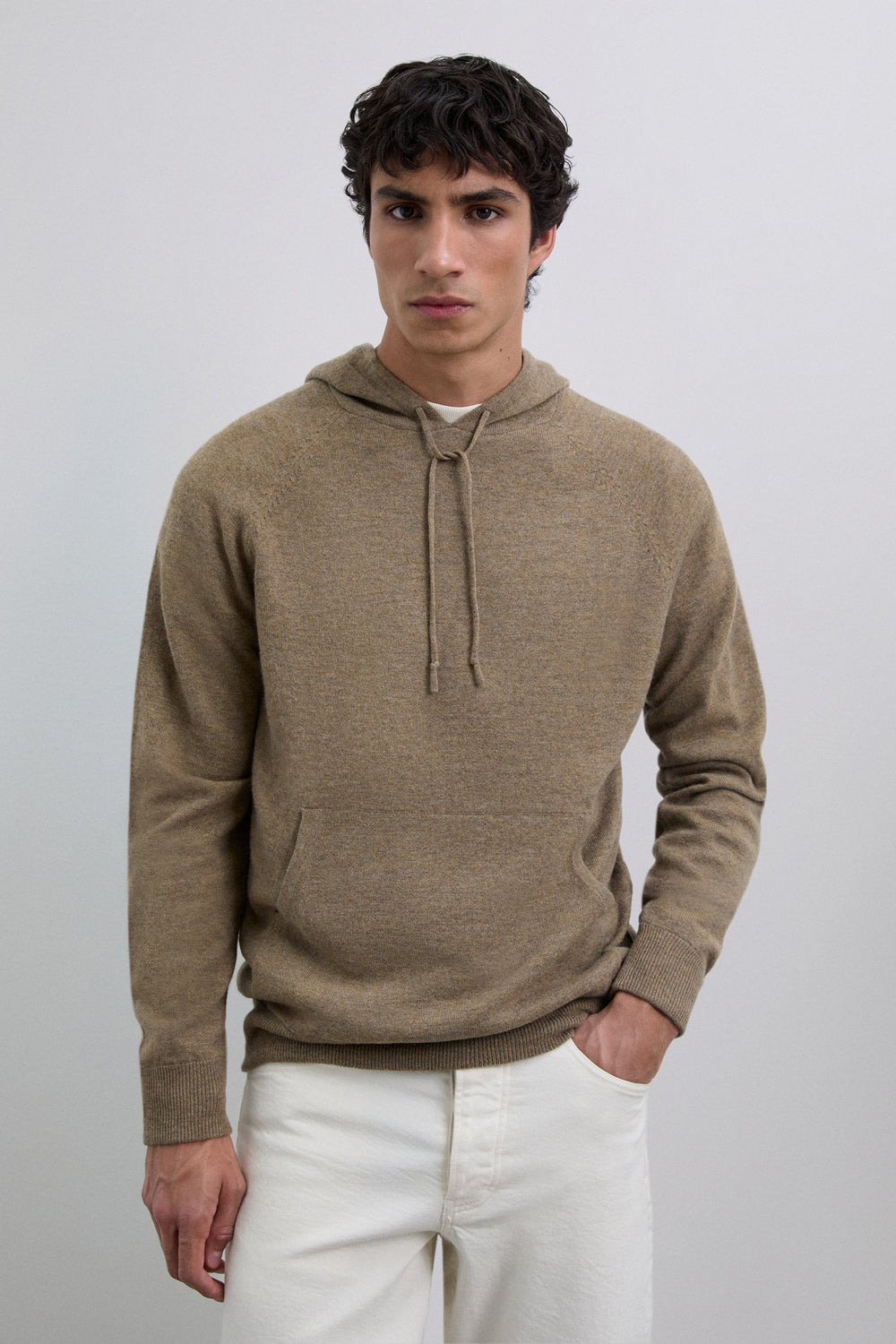 Jersey confeccionado en 100% lana merino. Capucha ajustable mediante cordones. Manga larga. Bolsillo frontal estilo canguro. Acabados canalé en puño y cintura.
