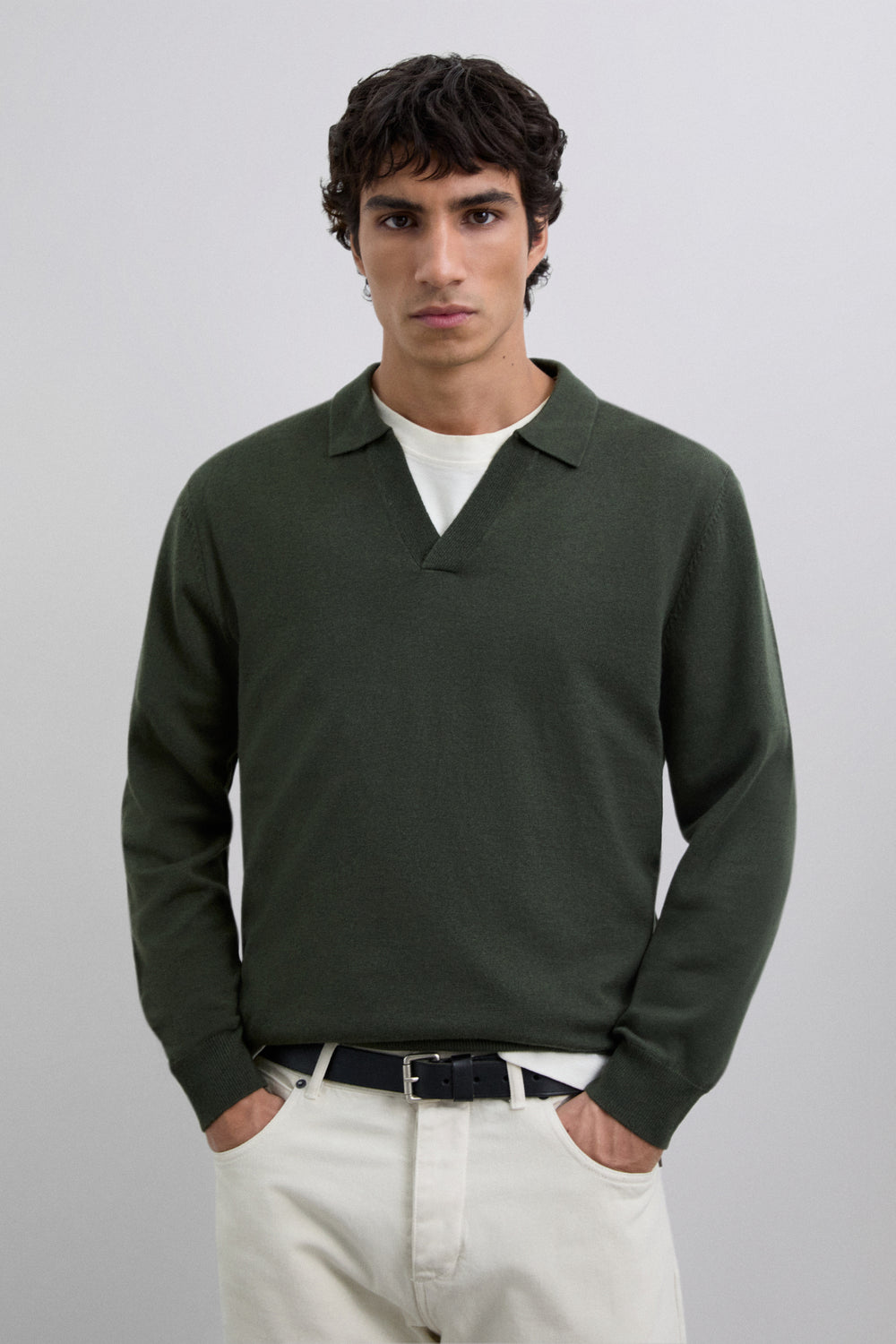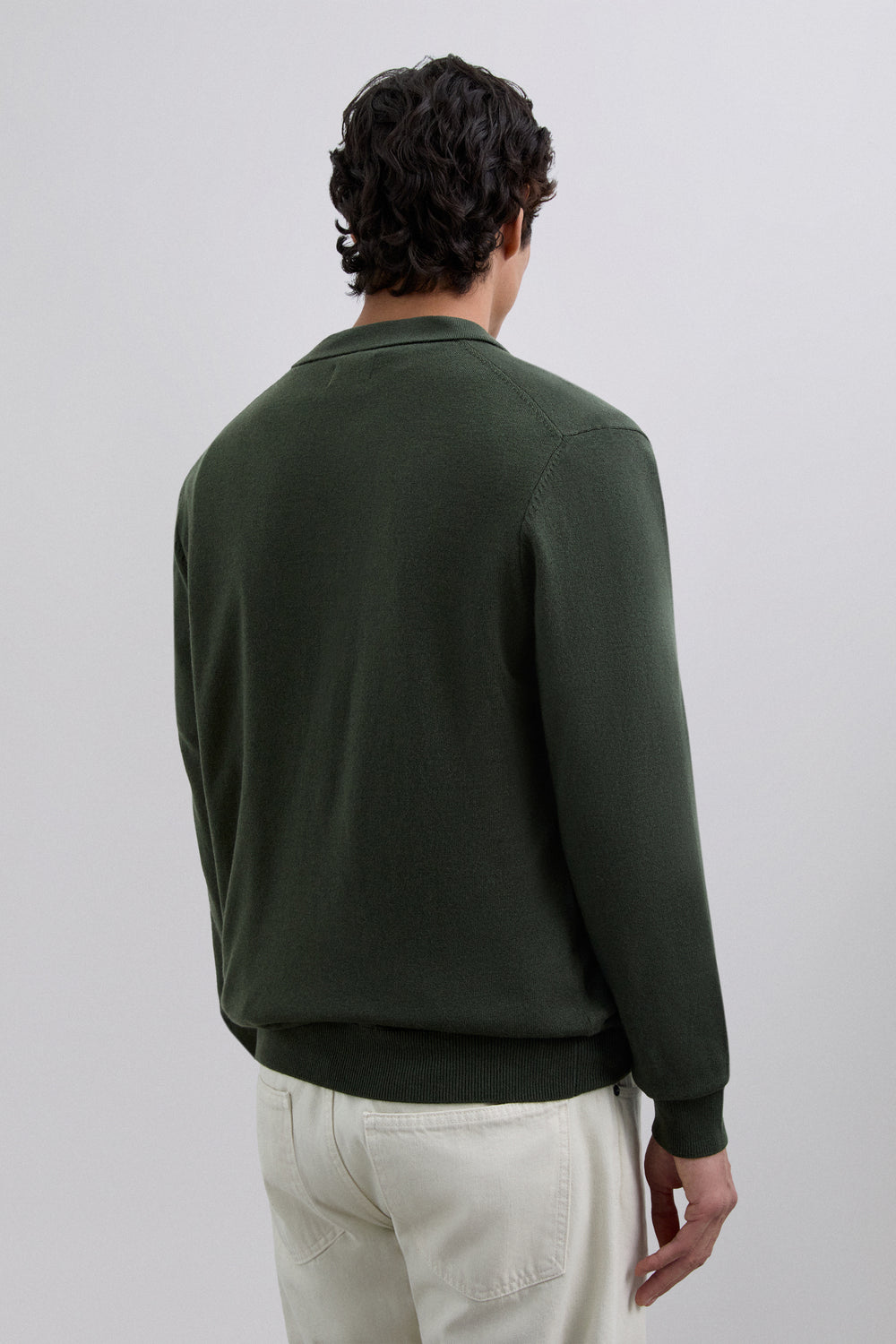 Jersey de punto confeccionado en tejido mezcla lana . Cuello pico tipo polo. Manga larga. Acabados en rib.