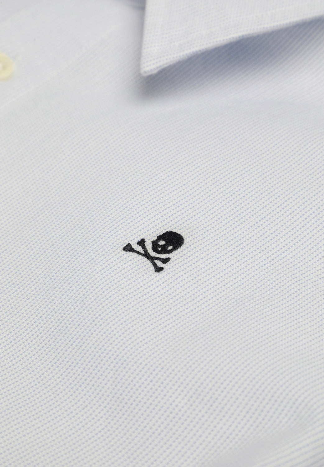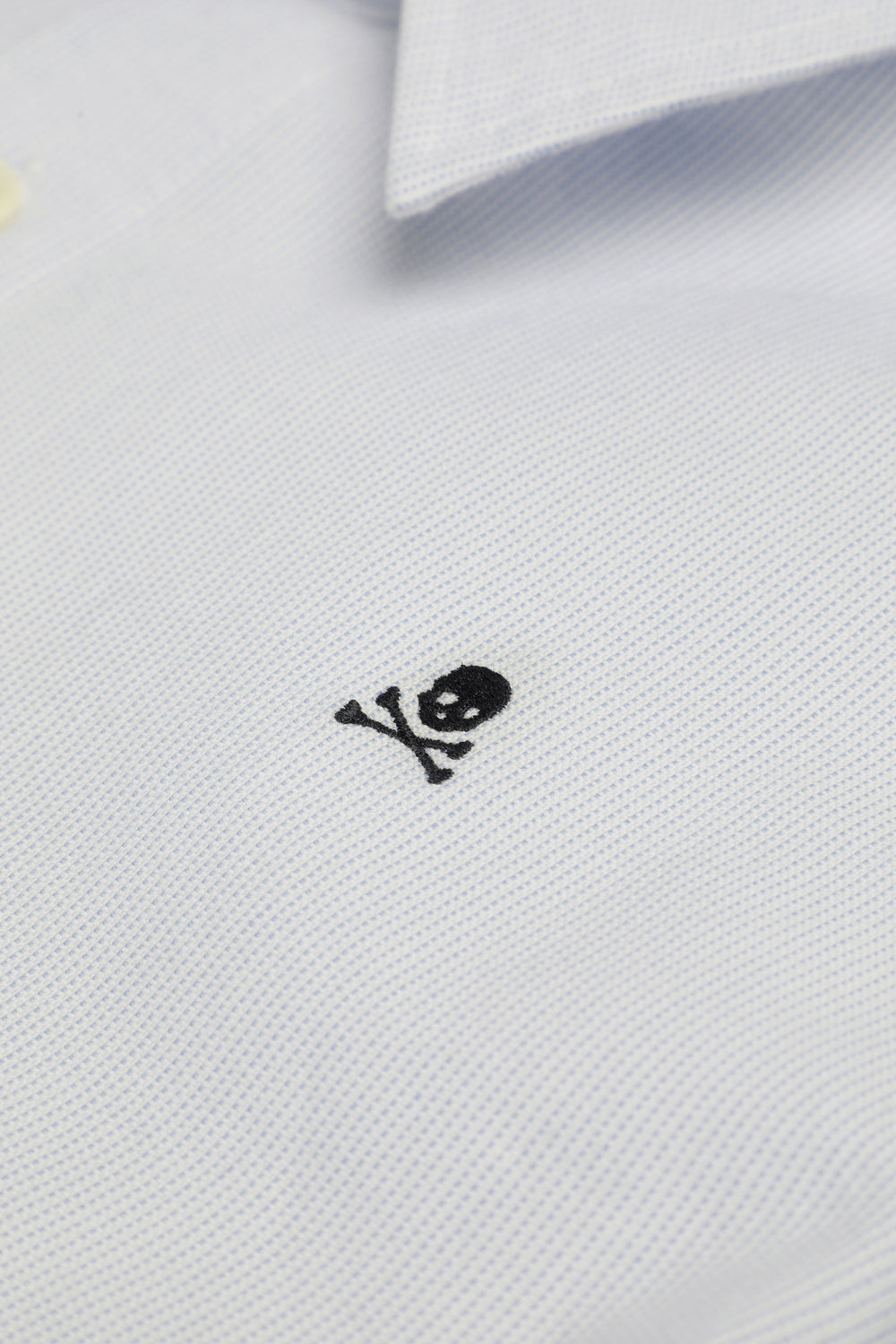 Camisa confeccionada en 100% algodón. Estampado de rayas. Corte regular, cuello italiano y cierre de botones. Mangas largas con puños abotonados. Calavera bordada en contraste en el pecho.