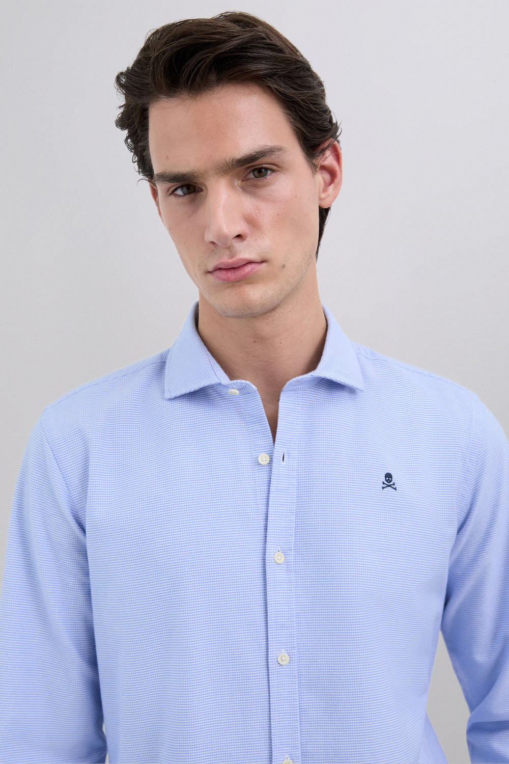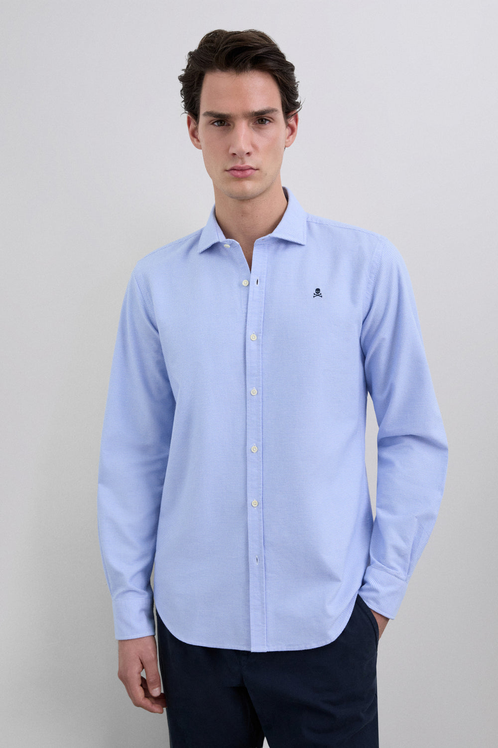 Camisa Oxford confeccionada en 100% algodón BCI. Regular Fit. Manga larga. Cierre frontal y en puños mediante abotonadura. Detalle de calavera bordada a contraste en pecho.