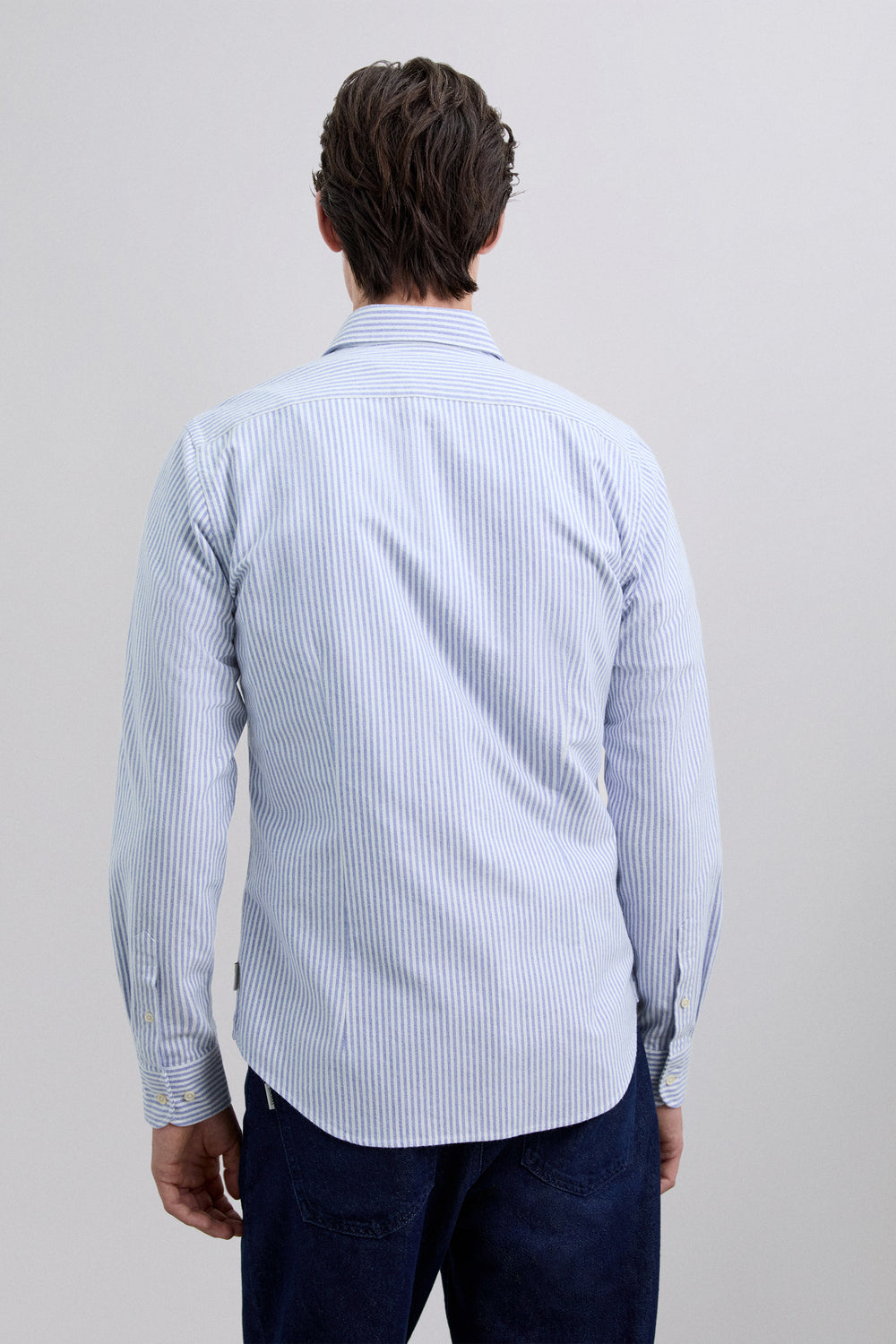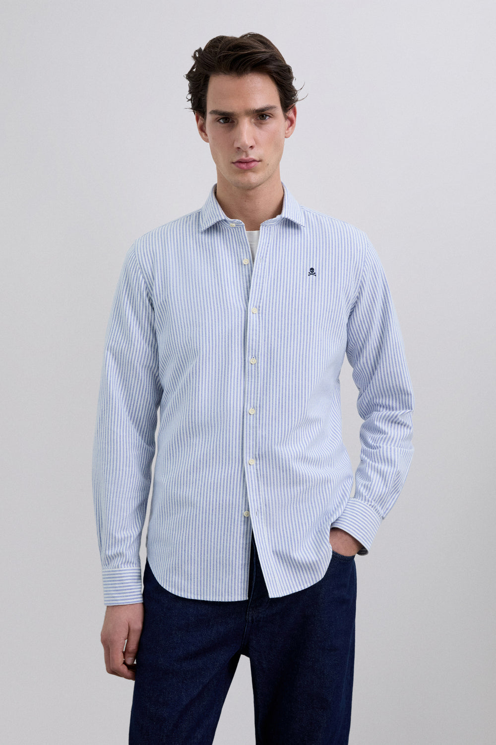 Camisa Oxford confeccionada en 100% algodón BCI. Regular Fit. Estampado de rayas. Manga larga. Cierre frontal y en puños mediante abotonadura. Detalle de calavera bordada a contraste en pecho.