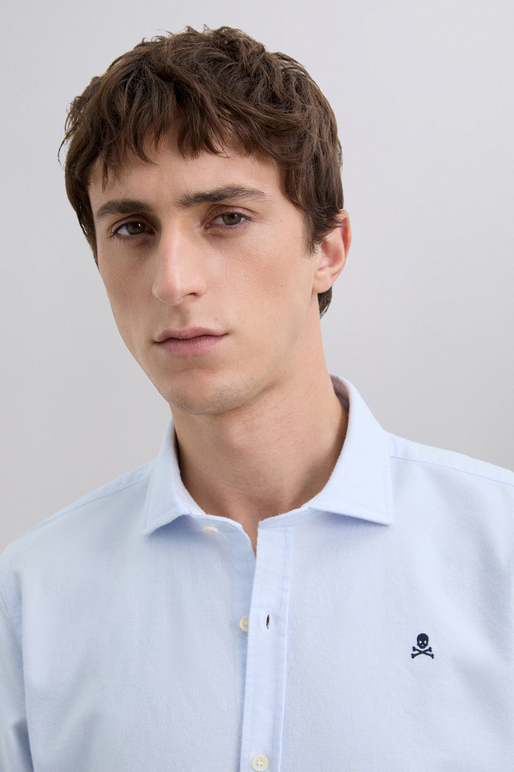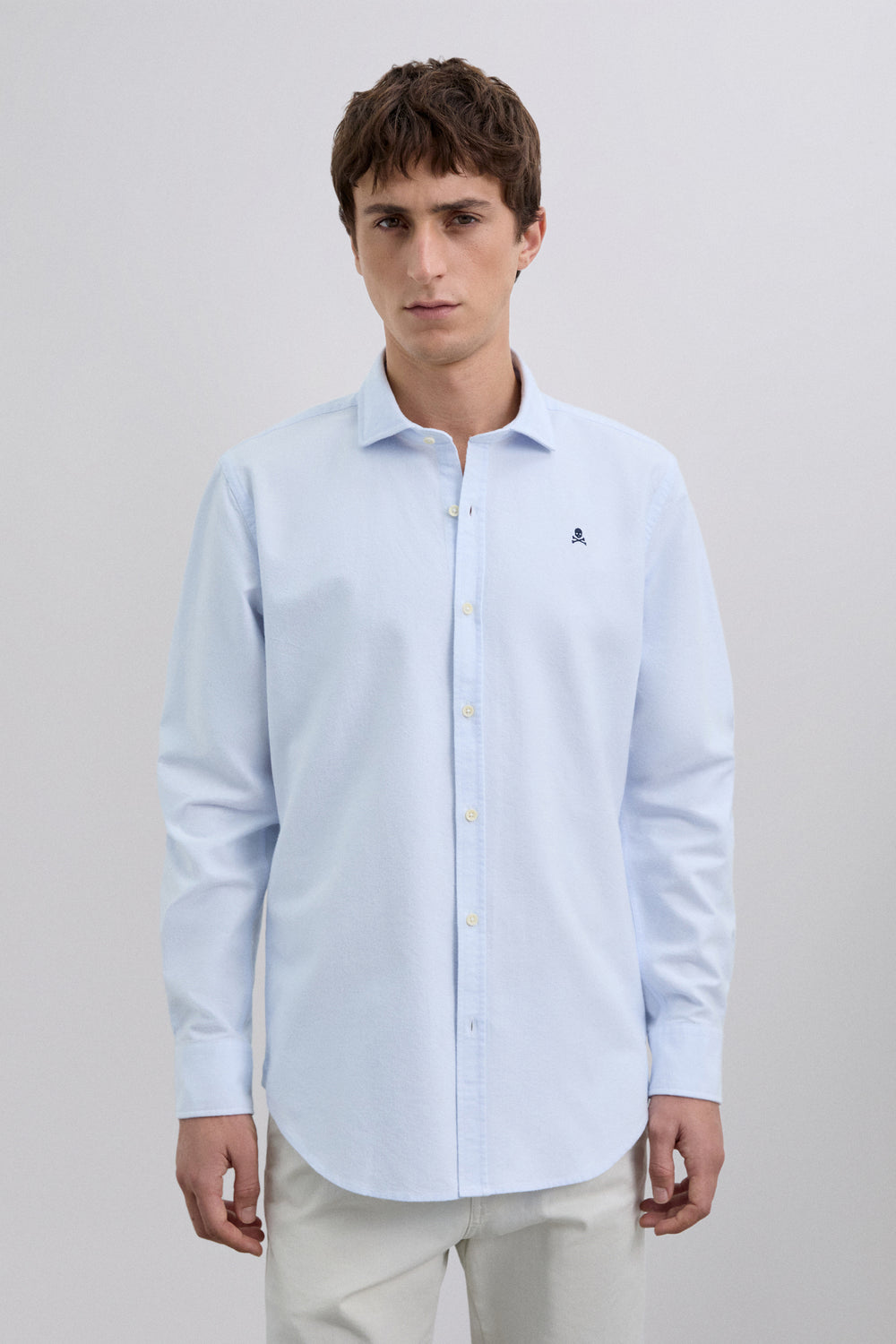 Camisa Oxford confeccionada en 100% algodón BCI. Regular Fit. Manga larga. Cierre frontal y en puños mediante abotonadura. Detalle de calavera bordada a contraste en pecho.