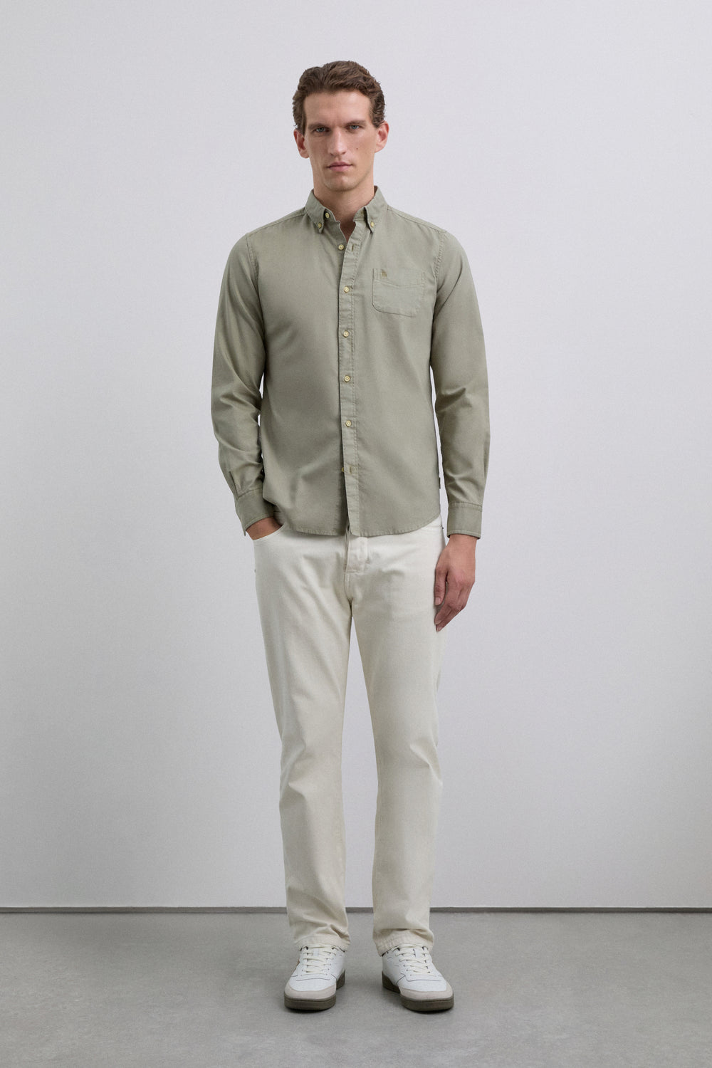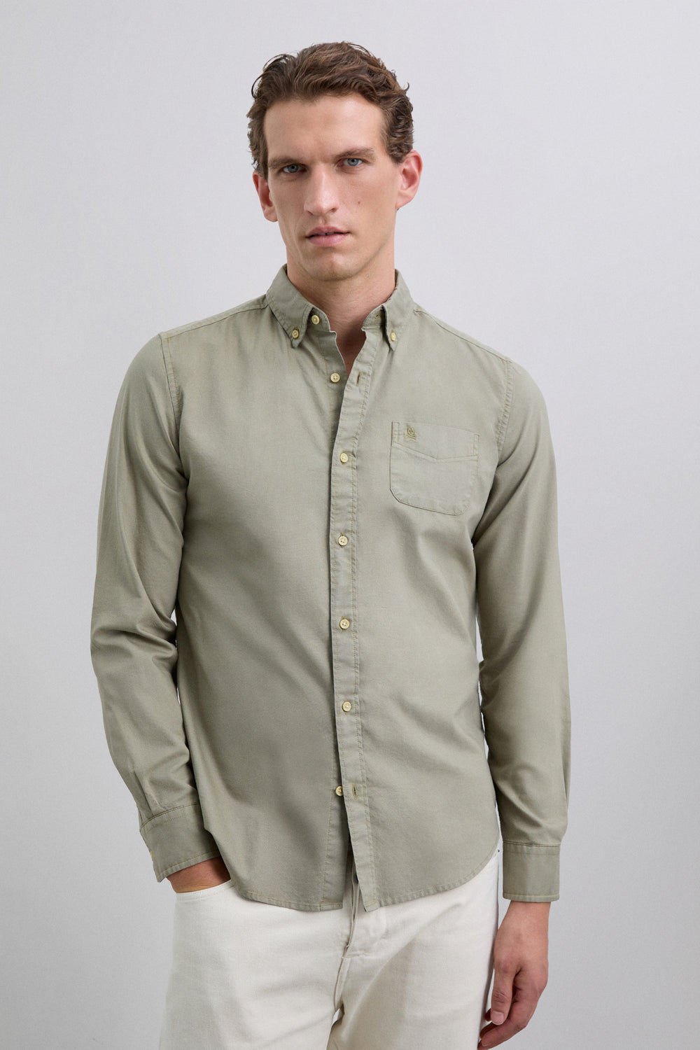 Camisa confeccionada en 100% Algodón BCI. Corte Regular fit. Detalle calavera bordada a tono en pecho. Cuello con botones. Manga larga terminada en puño con botones. Bolsillo tipo parche en pecho. Cierre frontal con botones.