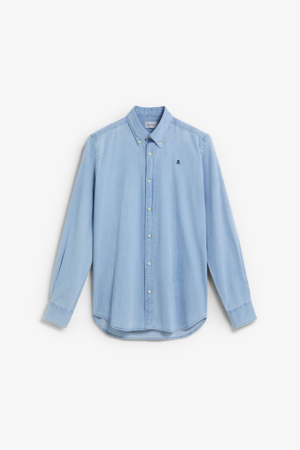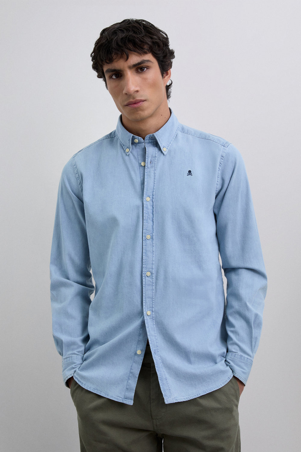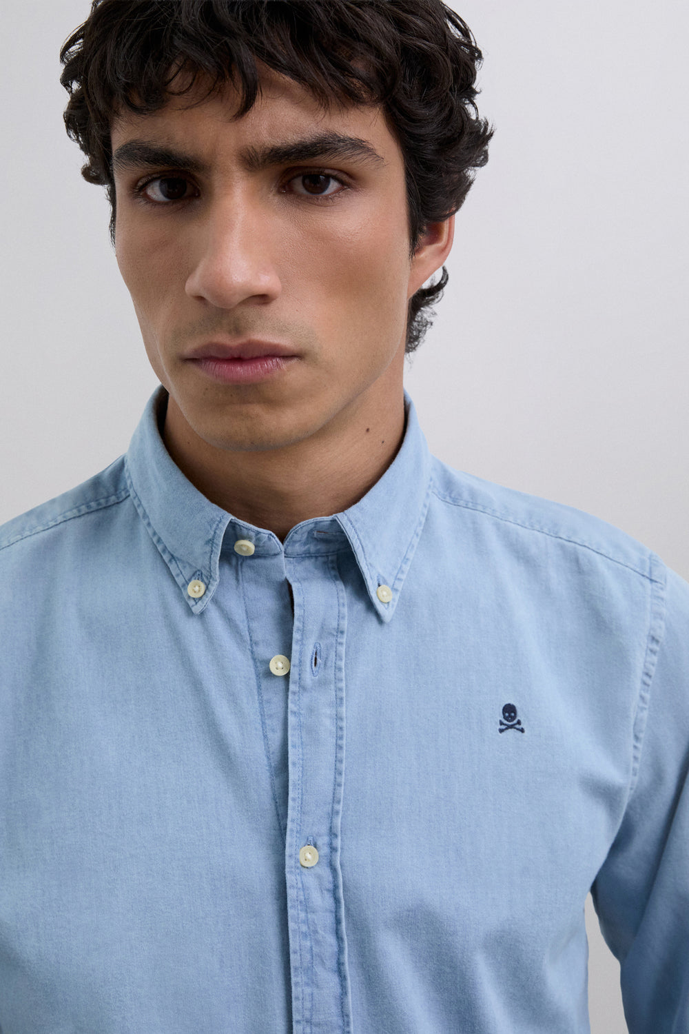 Camisa vaquera confeccionada en mezcla de algodón. Corte regular, cuello con botones y cierre de botones. Mangas largas con puños abotonados y calavera bordada en contraste en el pecho.