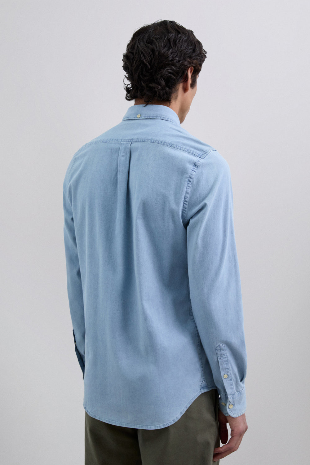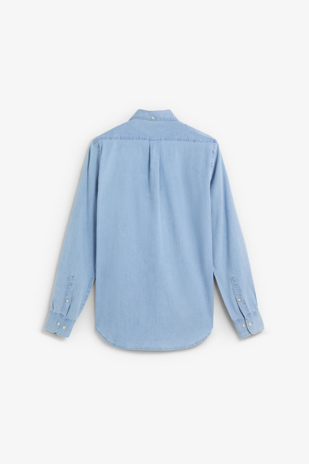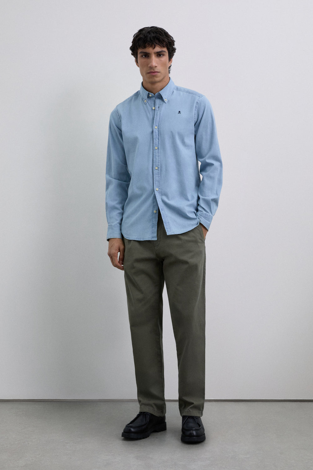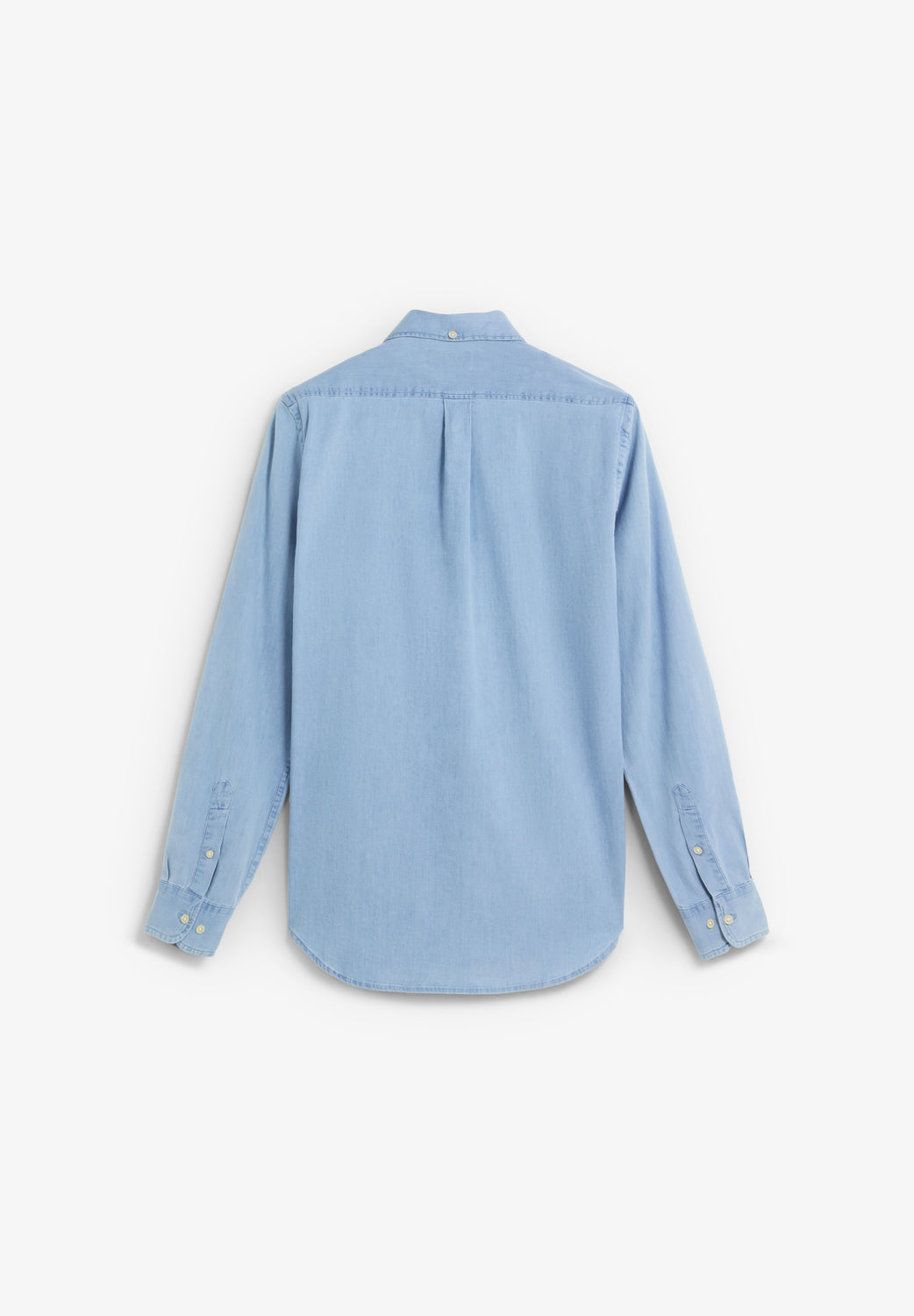 Camisa vaquera confeccionada en mezcla de algodón. Corte regular, cuello con botones y cierre de botones. Mangas largas con puños abotonados y calavera bordada en contraste en el pecho.