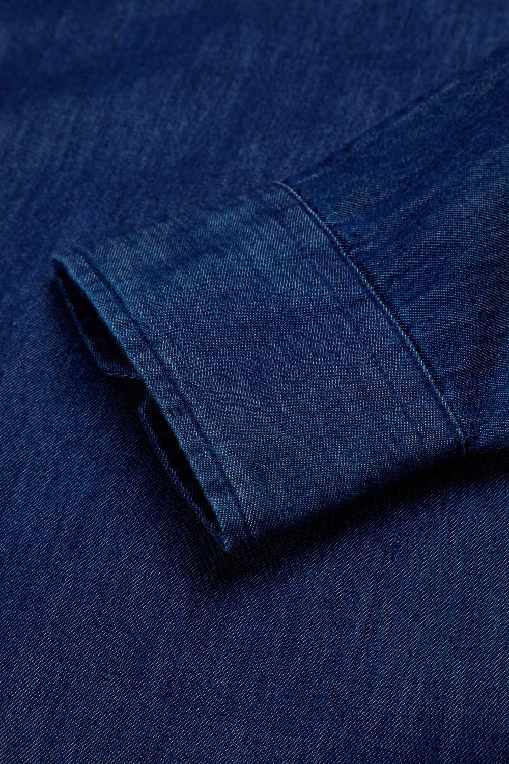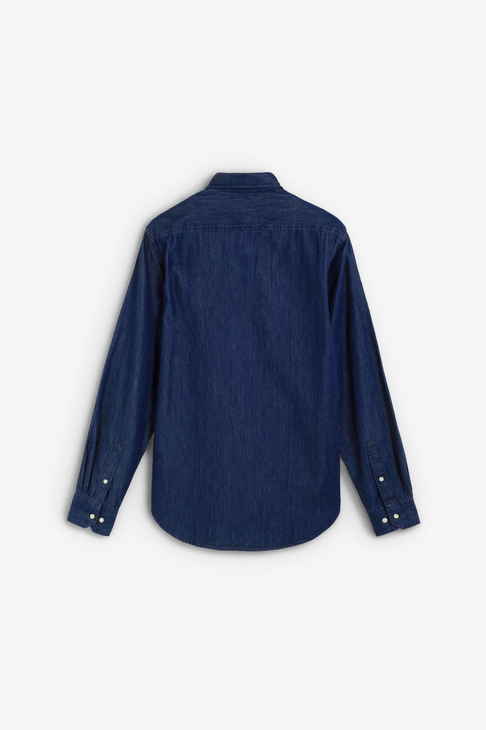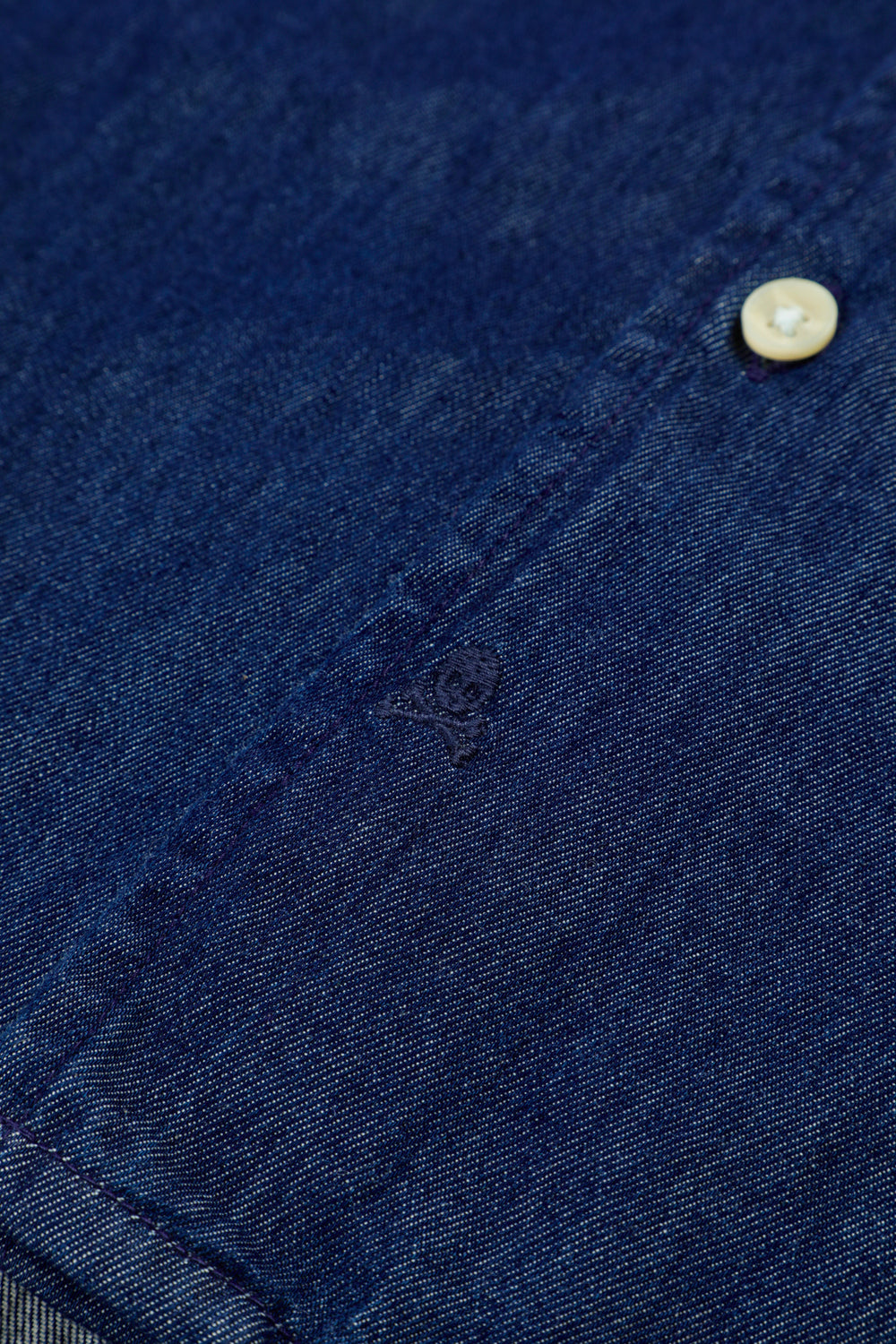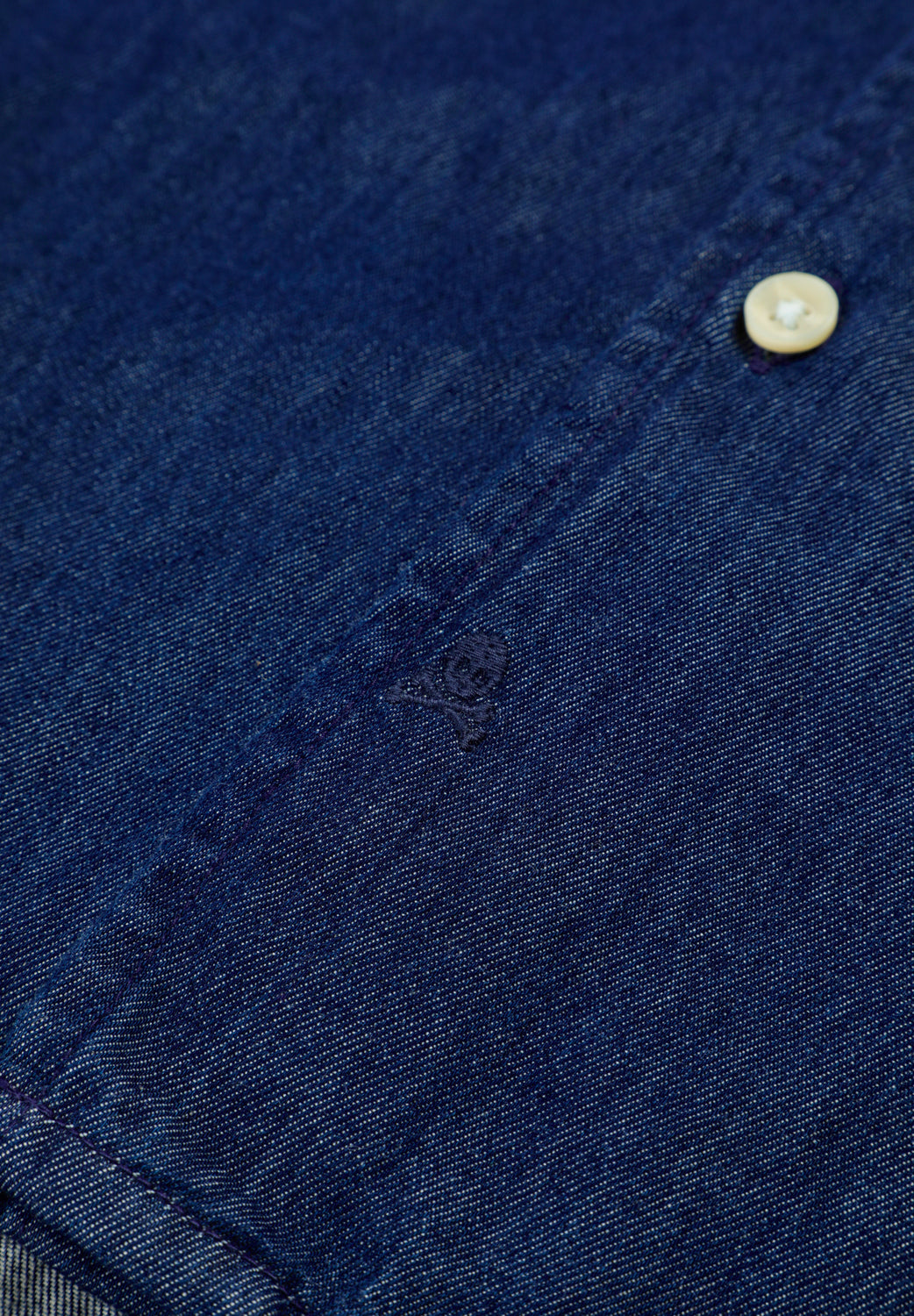 Camisa vaquera confeccionada en 100% algodón con acabado peach. Corte regular, cuello italiano y cierre de botones. Mangas largas con puños abotonados. Calavera bordada en contraste en el pecho.