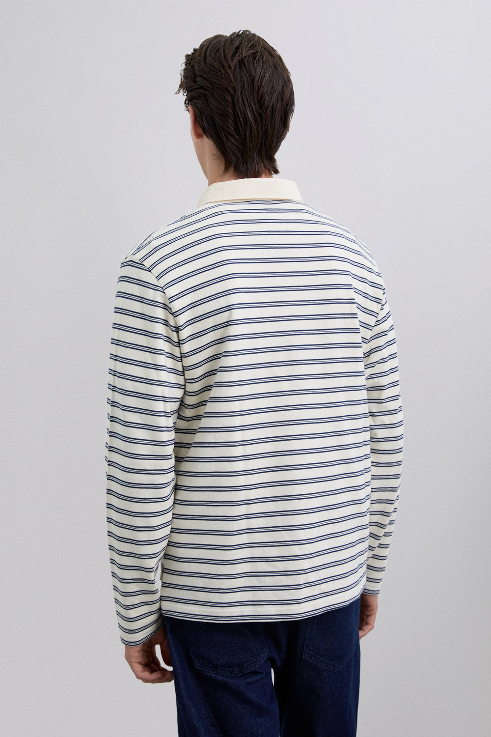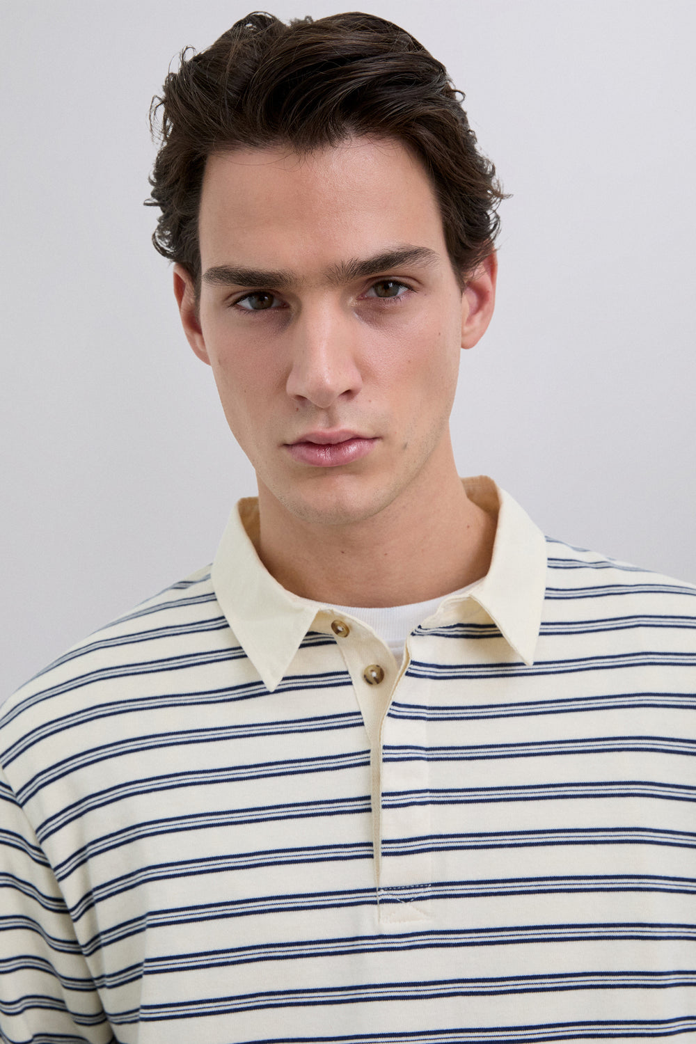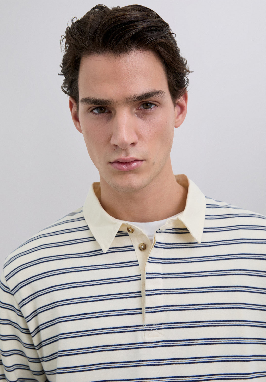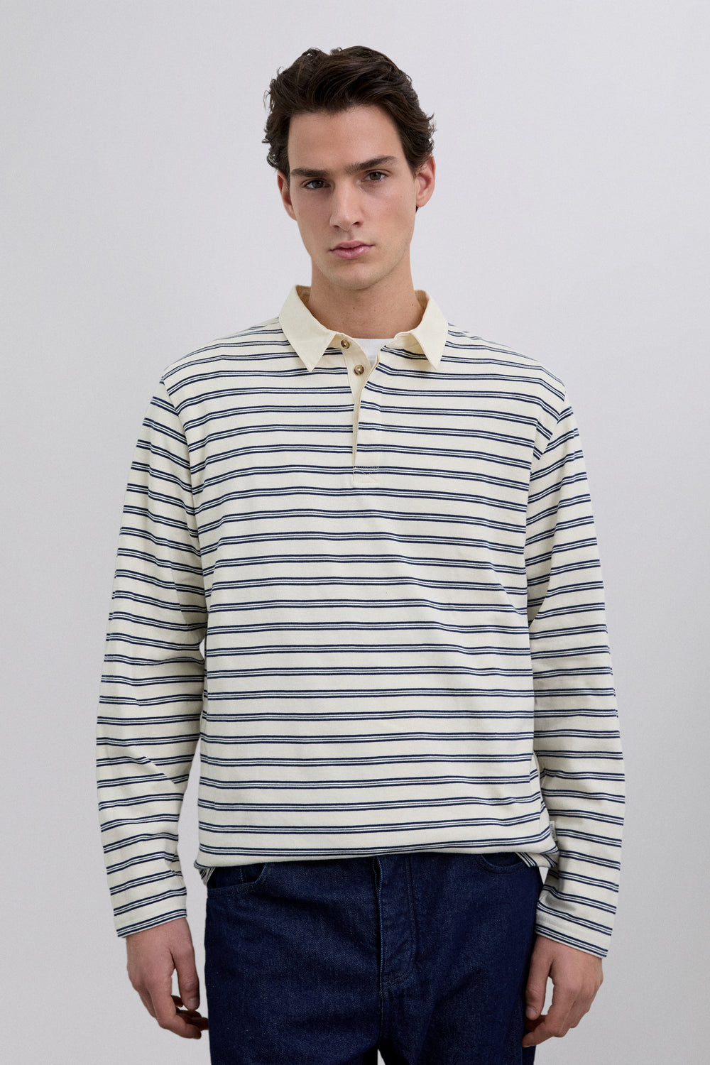 Polo confeccionado en tejido de punto 100% algodón BCI. Relaxed fit. Manga larga. Cuello de sarga en contraste. Cierre por cuatro botones con tapeta oculta.