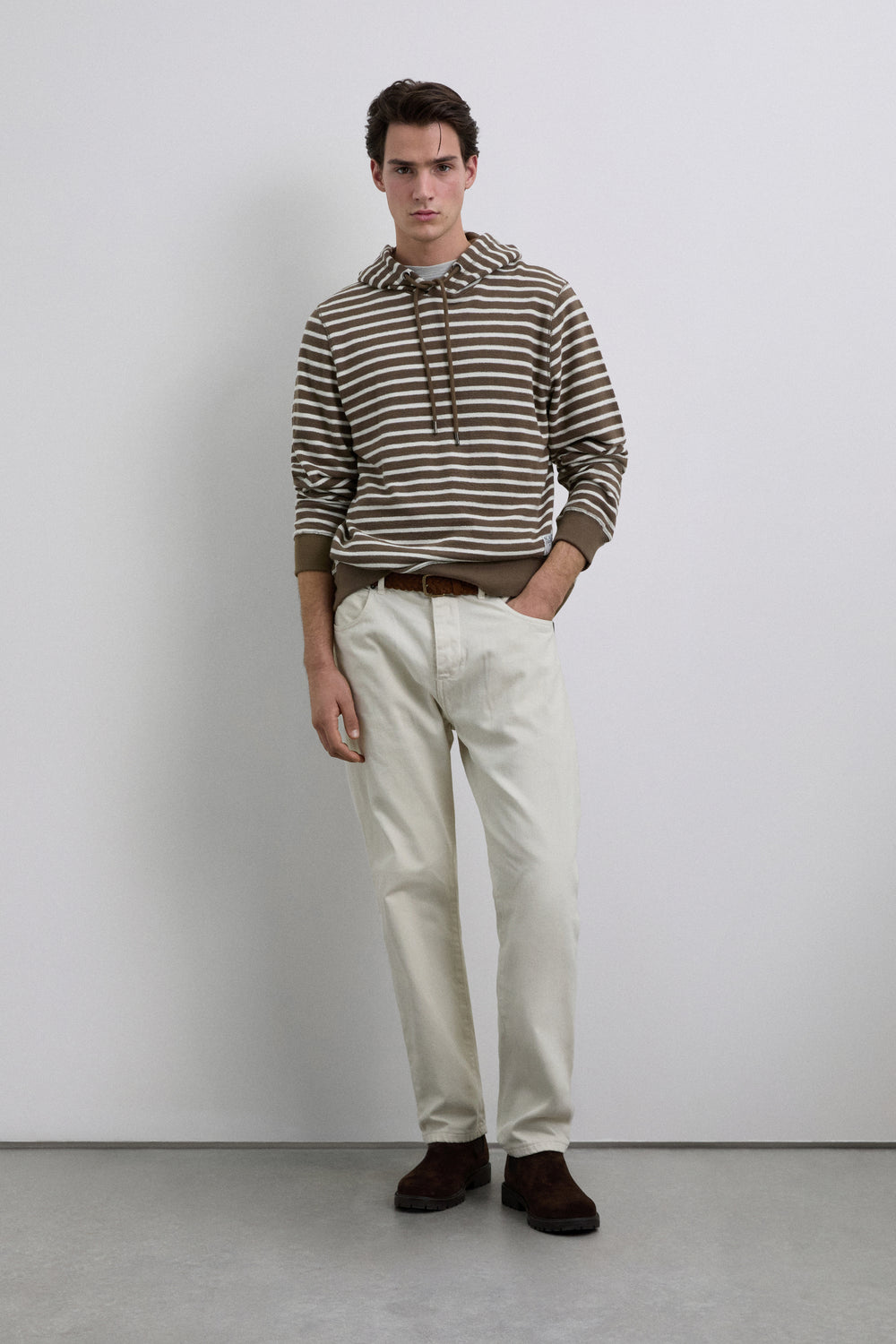 Sudadera confeccionada en 100% algodón BCI. Estampado de rayas. Corte regular. Etiqueta bordada en parte izquierda. Ojales metálicos. Cordones con punta metálica. Puños y bajo acanalados.