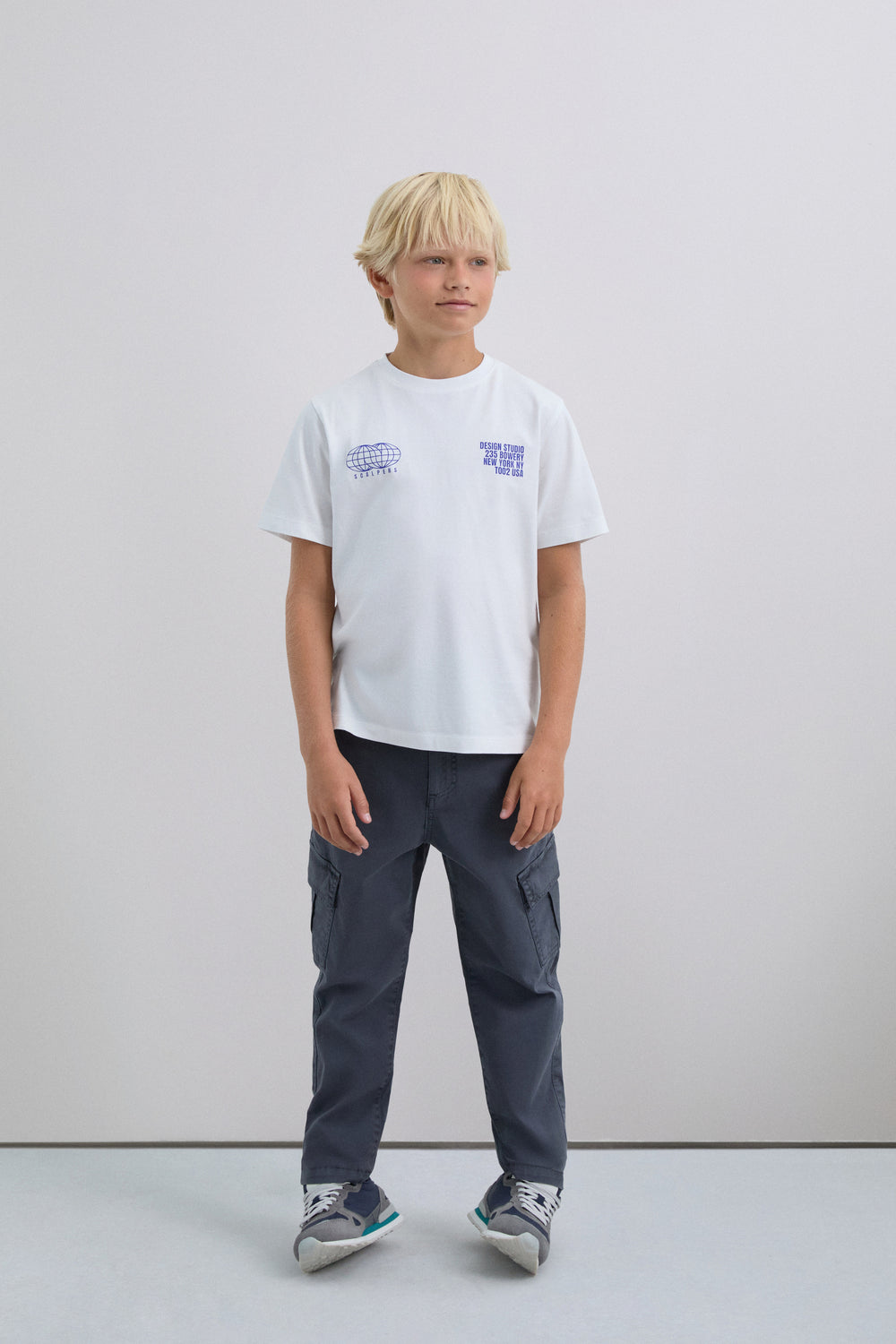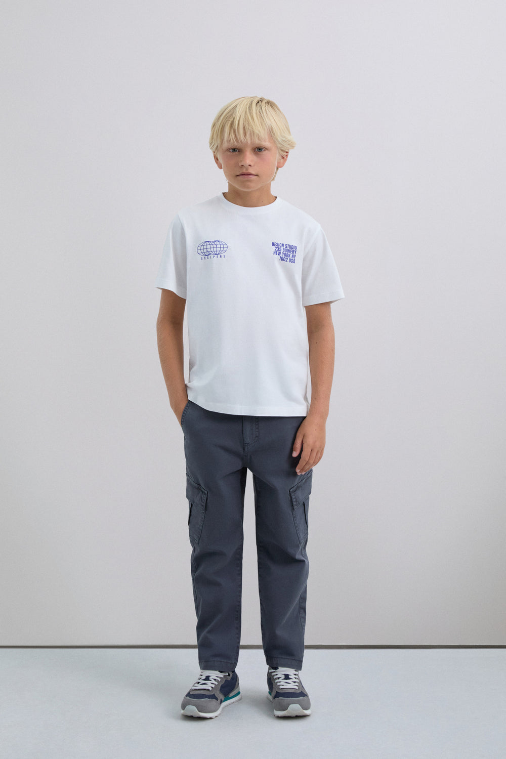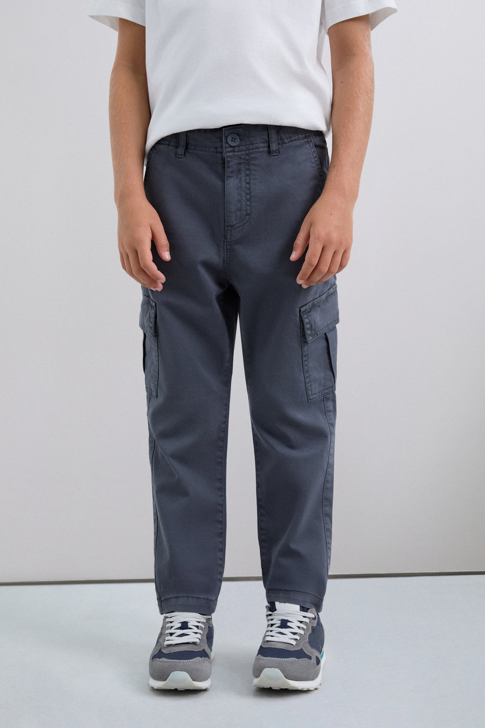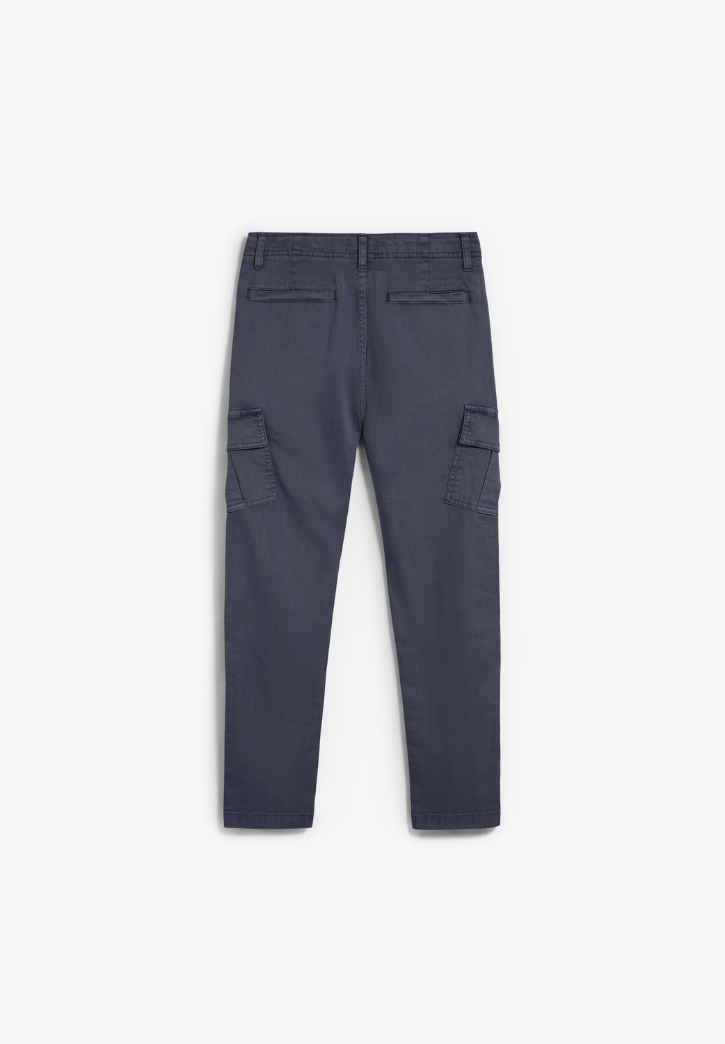 Pantalón cargo confeccionado en algodón BCI ligeramente elástico. Regular fit, cierre con botón y cremallera y bolsillos laterales. Trabillas en cintura y bolsillos en pernera con tapeta.