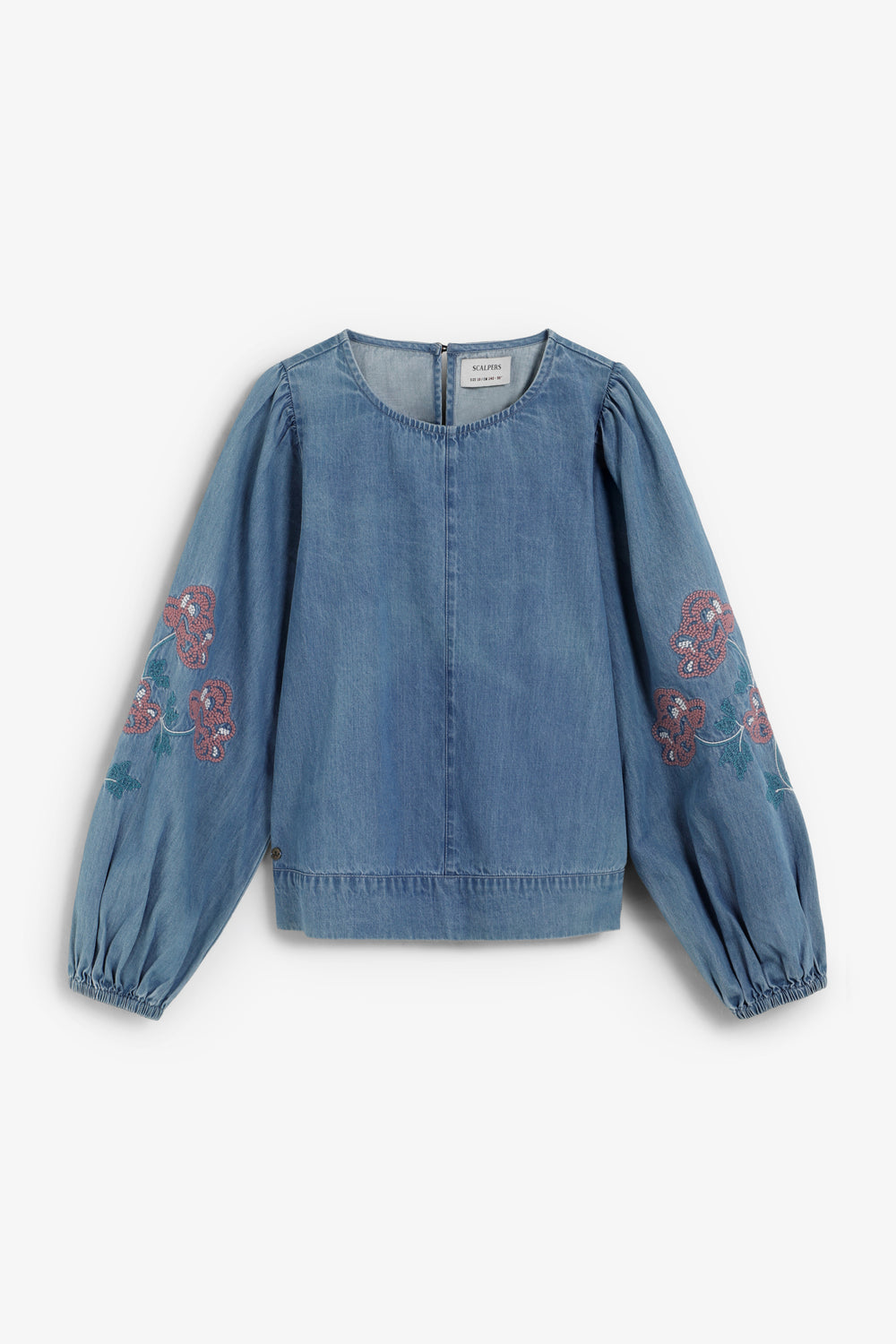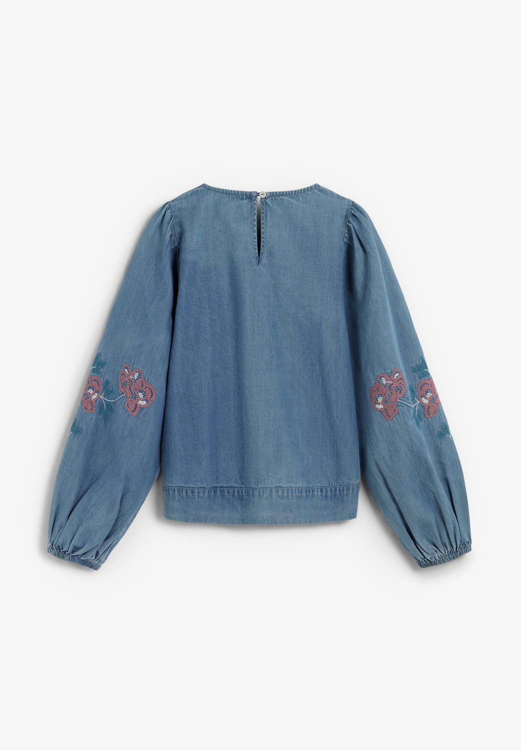 Blusa confeccionada 100% en algodón BCI. Manga larga abullonada y acabada en goma. Cuello redondo y detalle de flores bordadas en las mangas. Cierre con botón en espalda.
