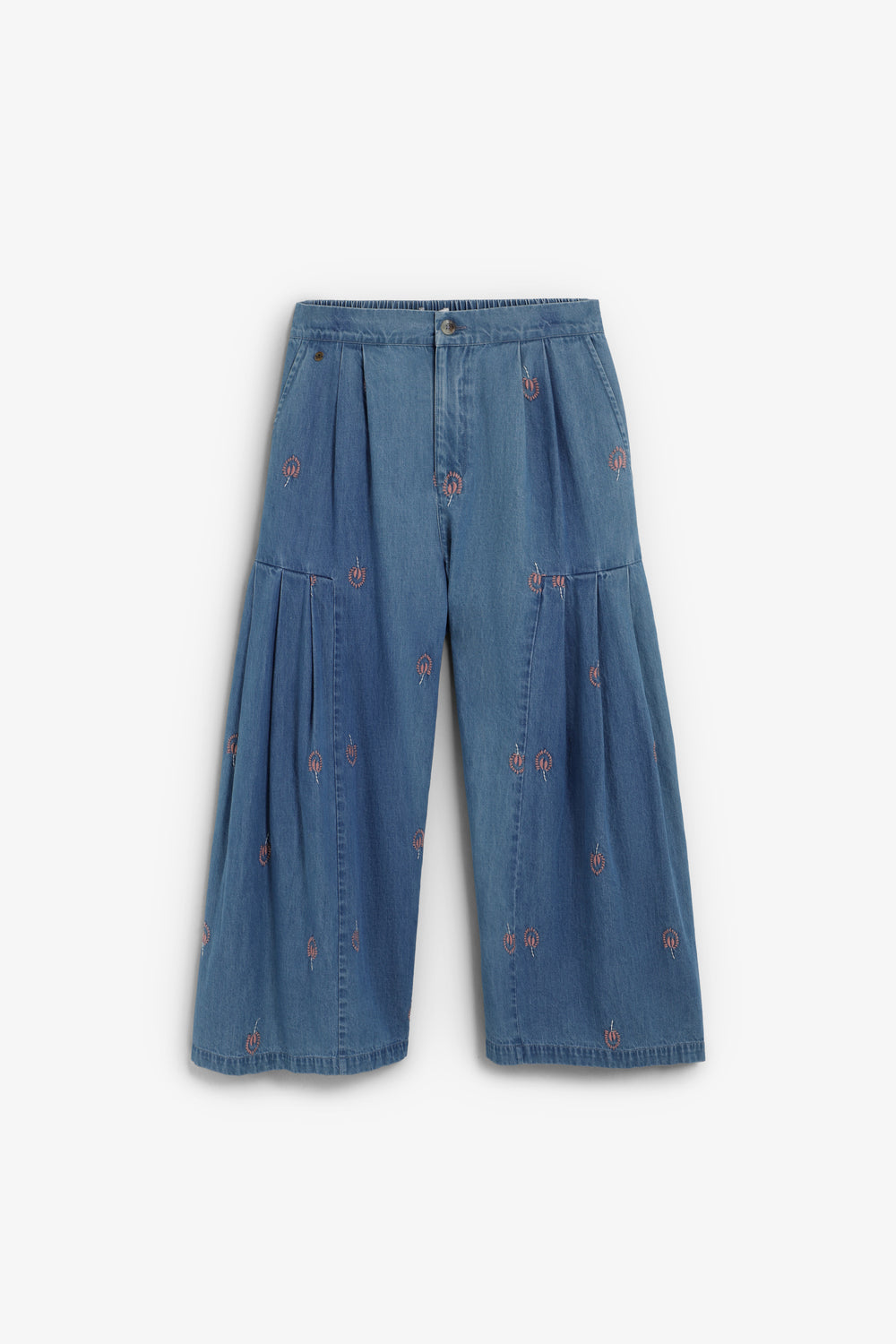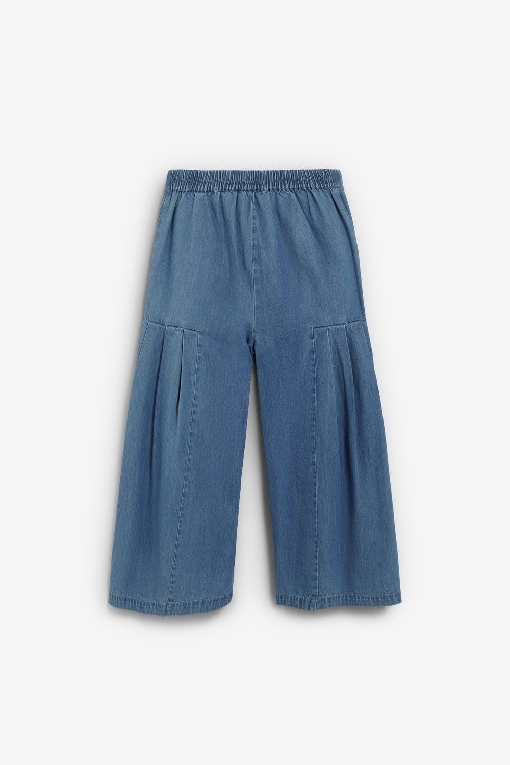 Pantalón denim confeccionado 100% en algodón BCI. Cierre con botón y cremallera en parte delantera. Cintura elástica con banda. Bolsillos laterales.