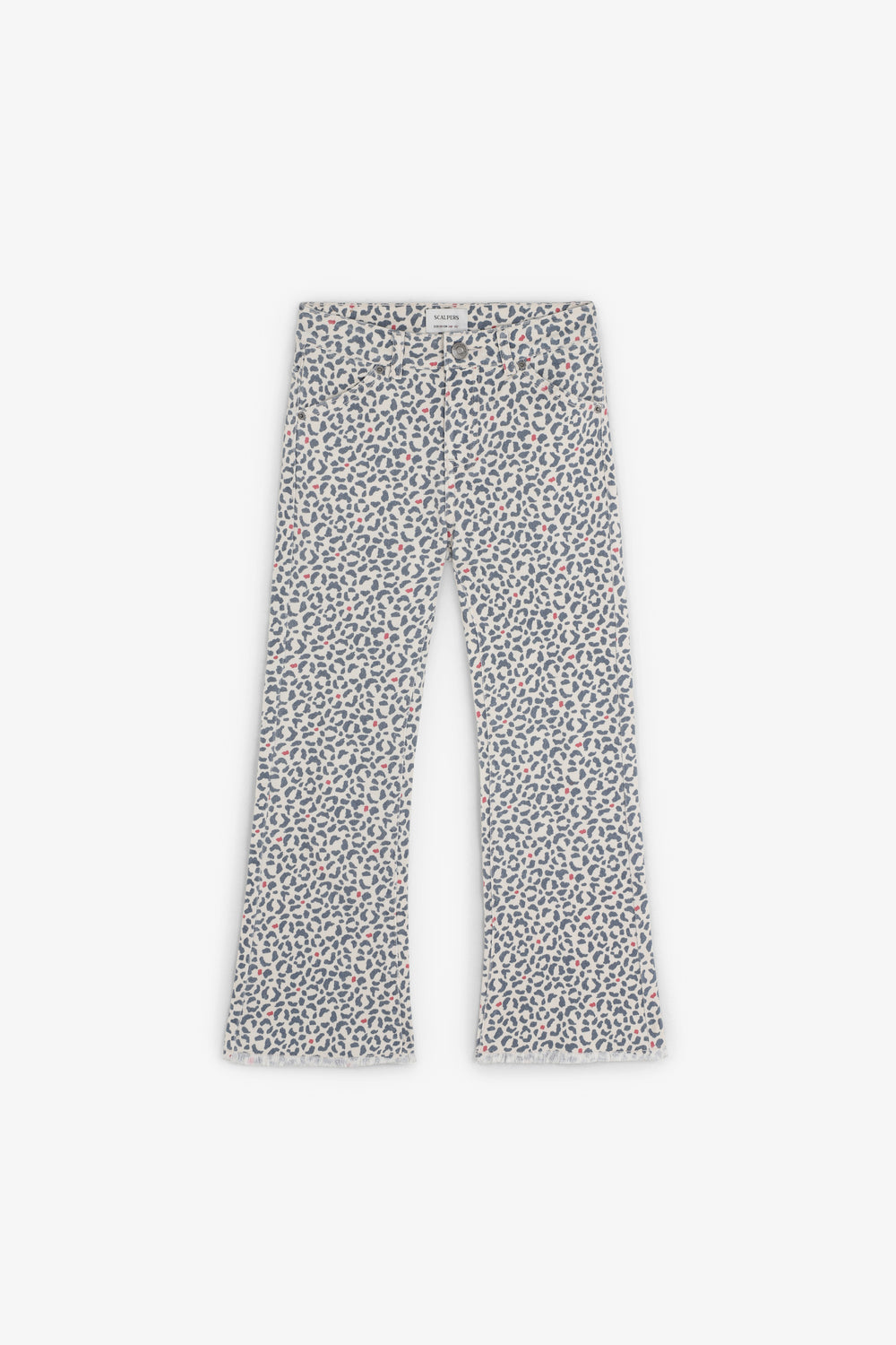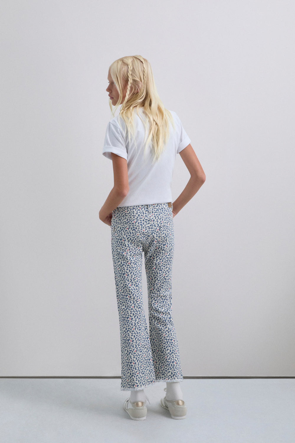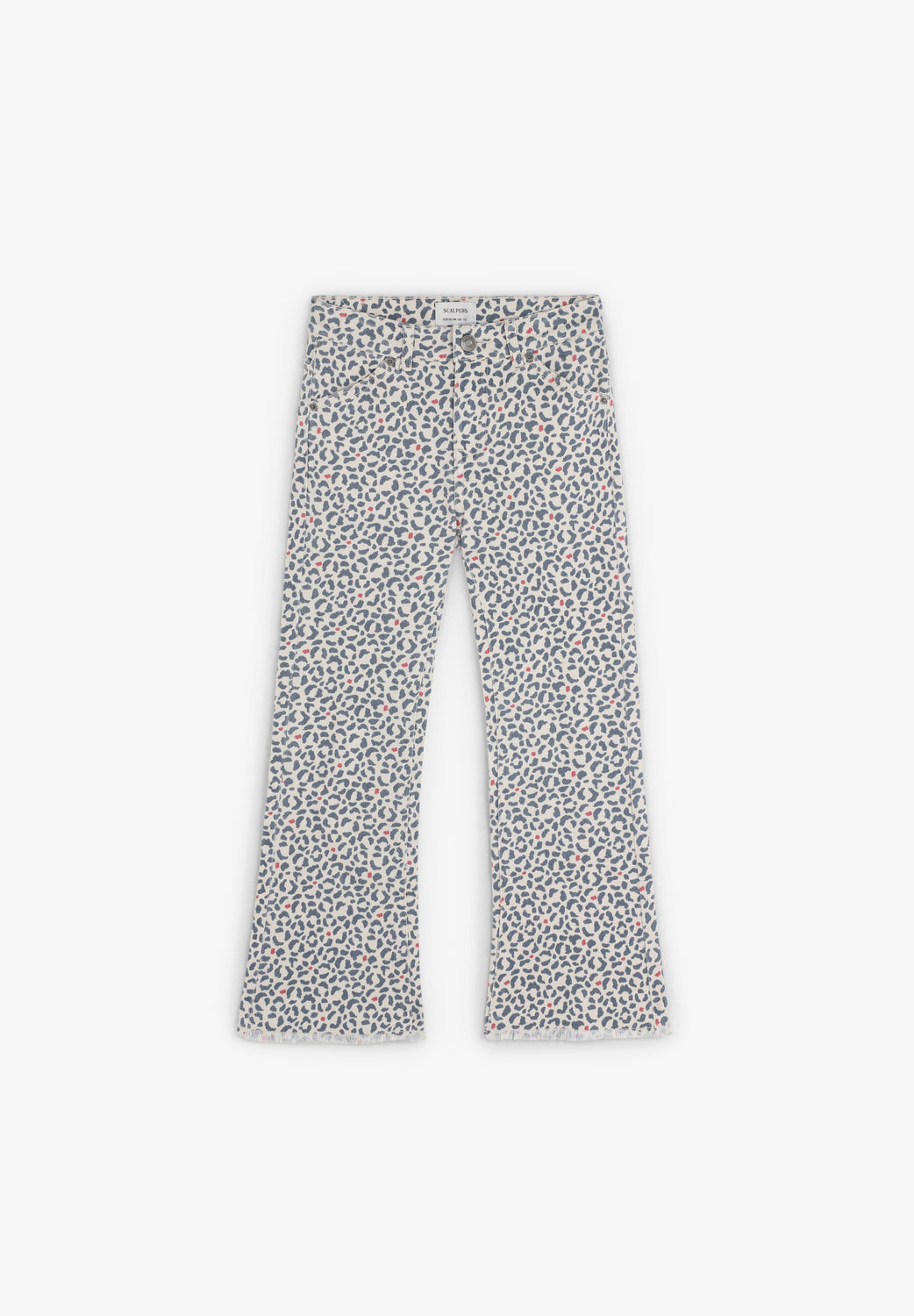 Pantalón vaquero. Dos bolsillos en frontal. Dos bolsillos posteriores con detalle de etiqueta con logo y calavera. Motivo desflecado en bajos. Trabillas en cintura. Cierre mediante botón y cremallera. Animal print.