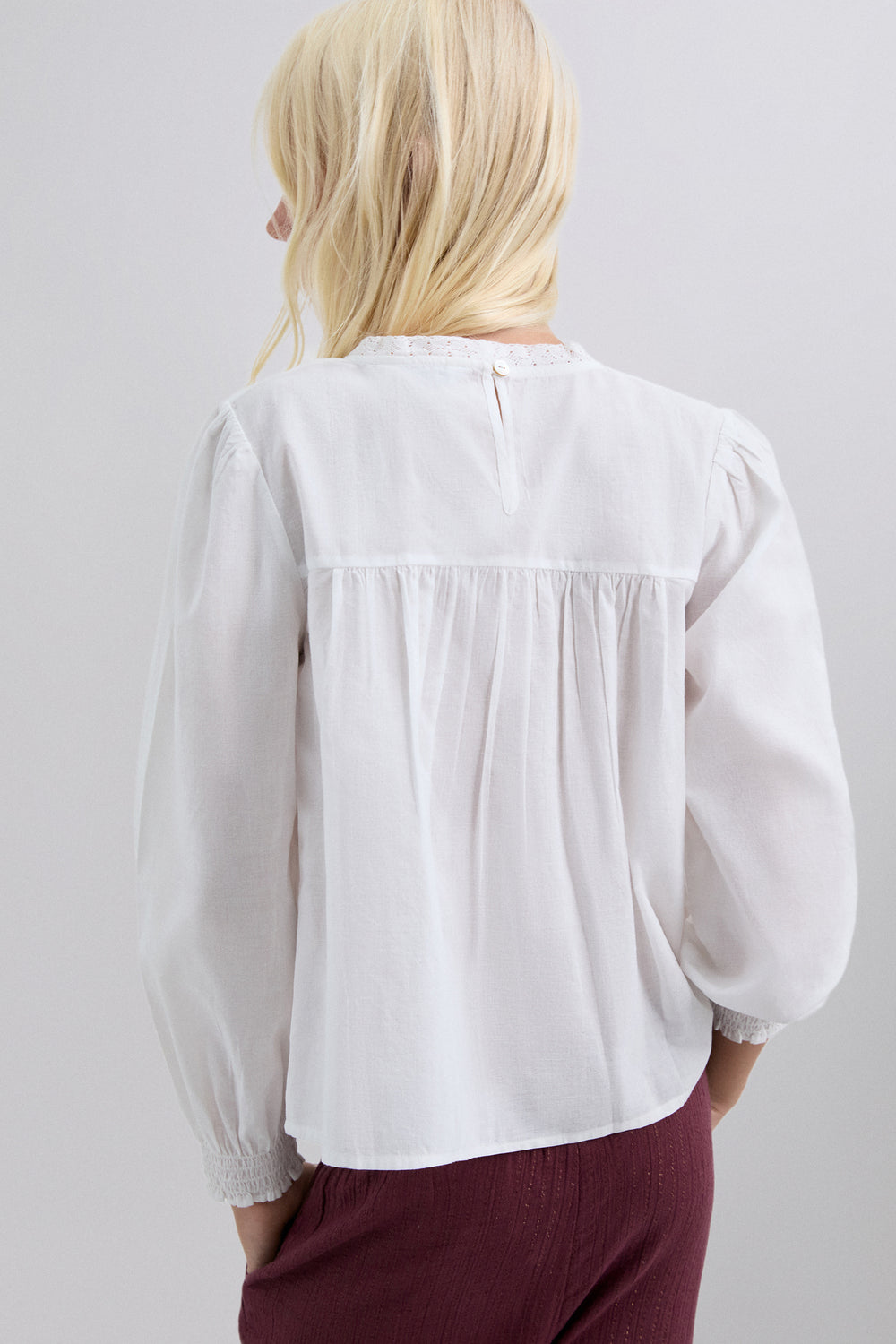 Blusa confeccionada en 100% algodón BCI. Regular fit. Cuello redondo. Manga larga abullonada terminada en elástico. Detalle metálico de calavera en cintura. Detalles bordados en cuello y frontal. Cierre trasero con botón.