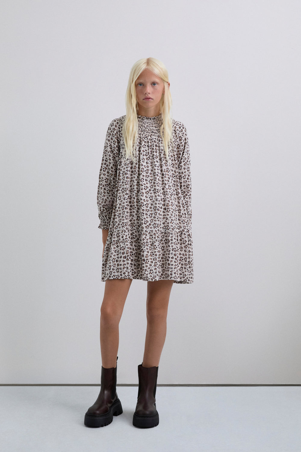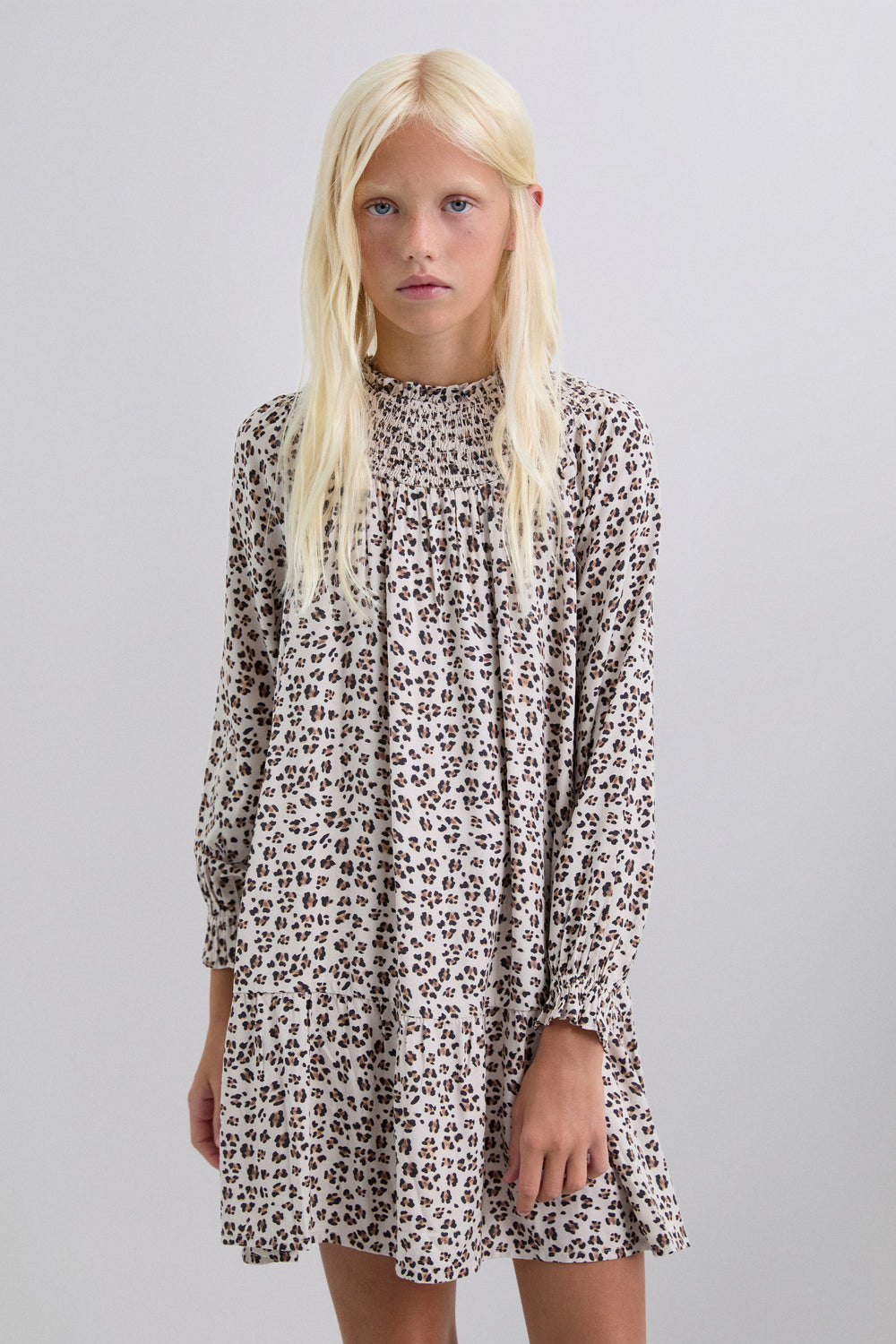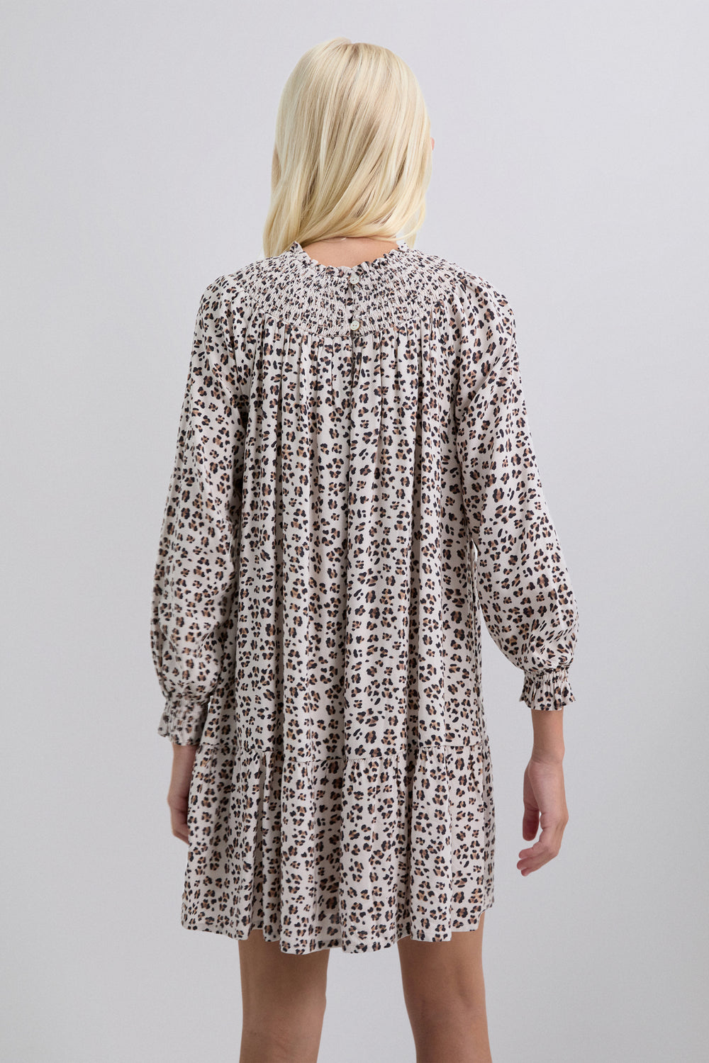 Vestido estampado animal print. Manga larga ligeramente abullonada. Cuello nido de abeja y cierre mediante botón.