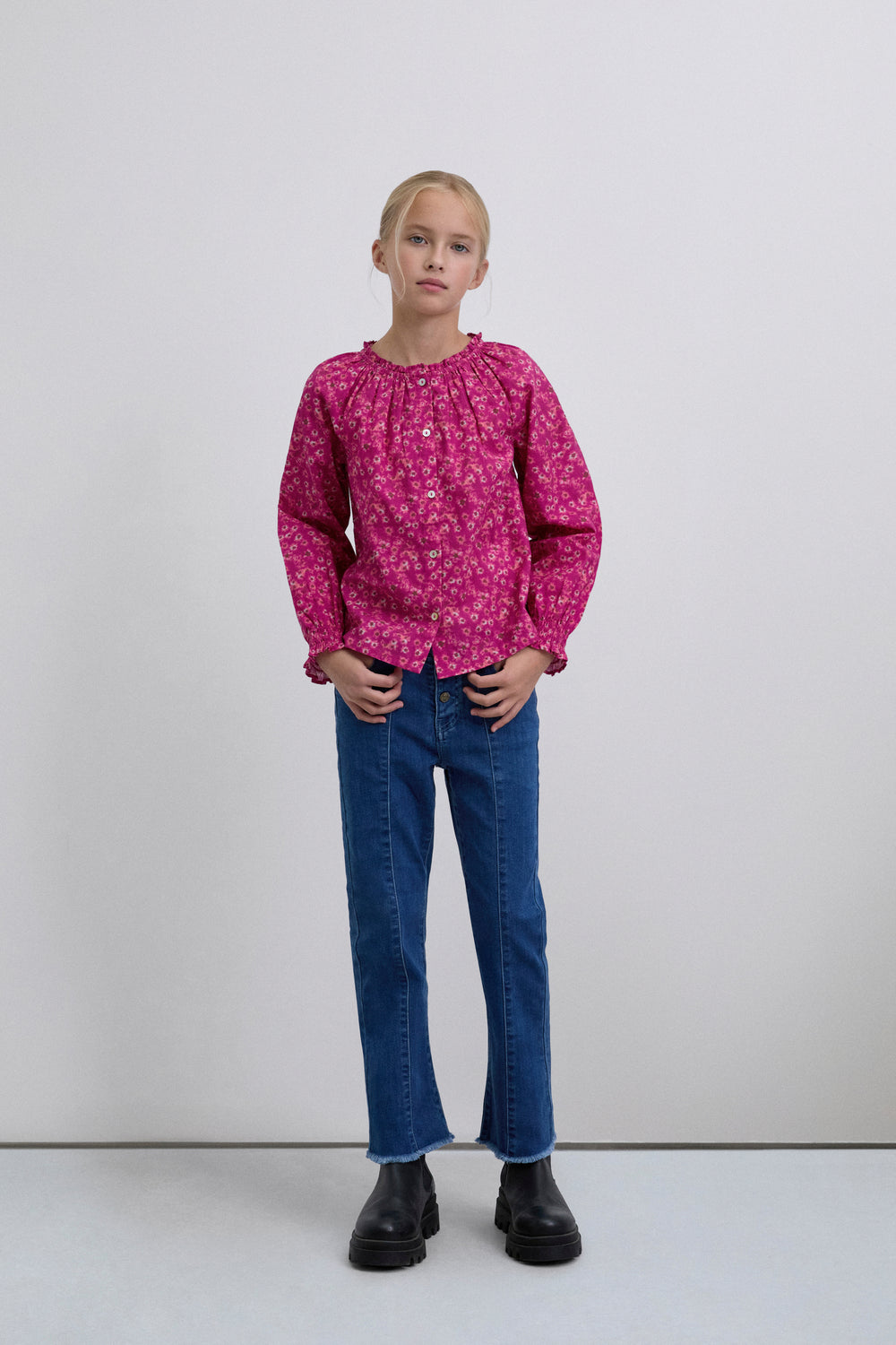 Blusa confeccionada en 100% algodón BCI. Regular fit. Cuello redondo. Manga larga abullonada terminada en elástico. Cierre frontal mediante botones. Estampado de flores.