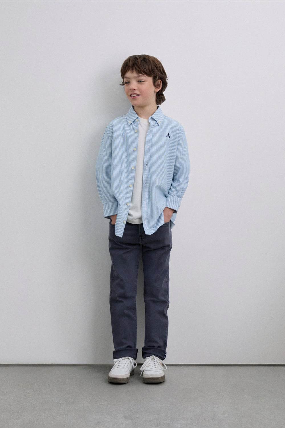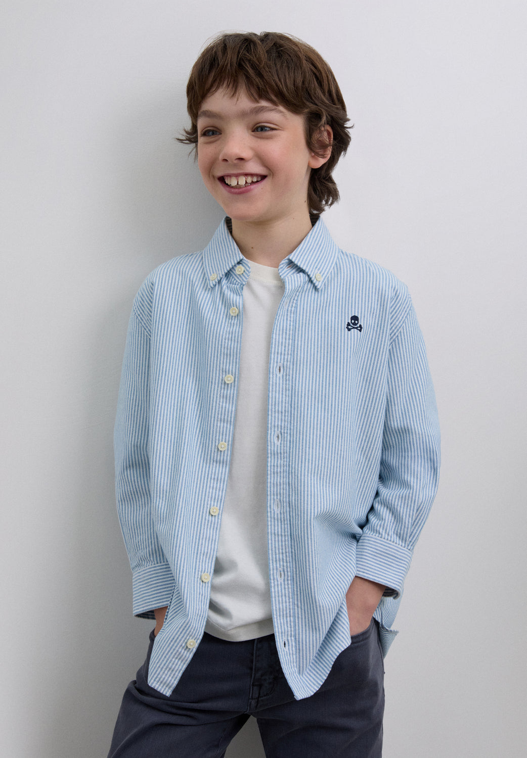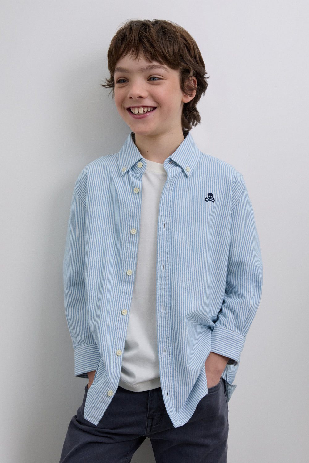 Camisa de rayas confeccionada en 100% algodón BCI. Cuello clásico, cierre con botones, regular fit, calavera en pecho a contraste. Acabado de botones en puño.