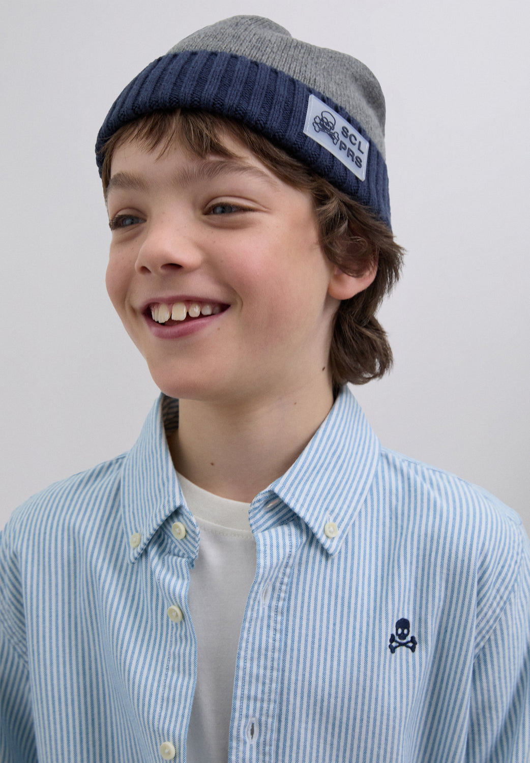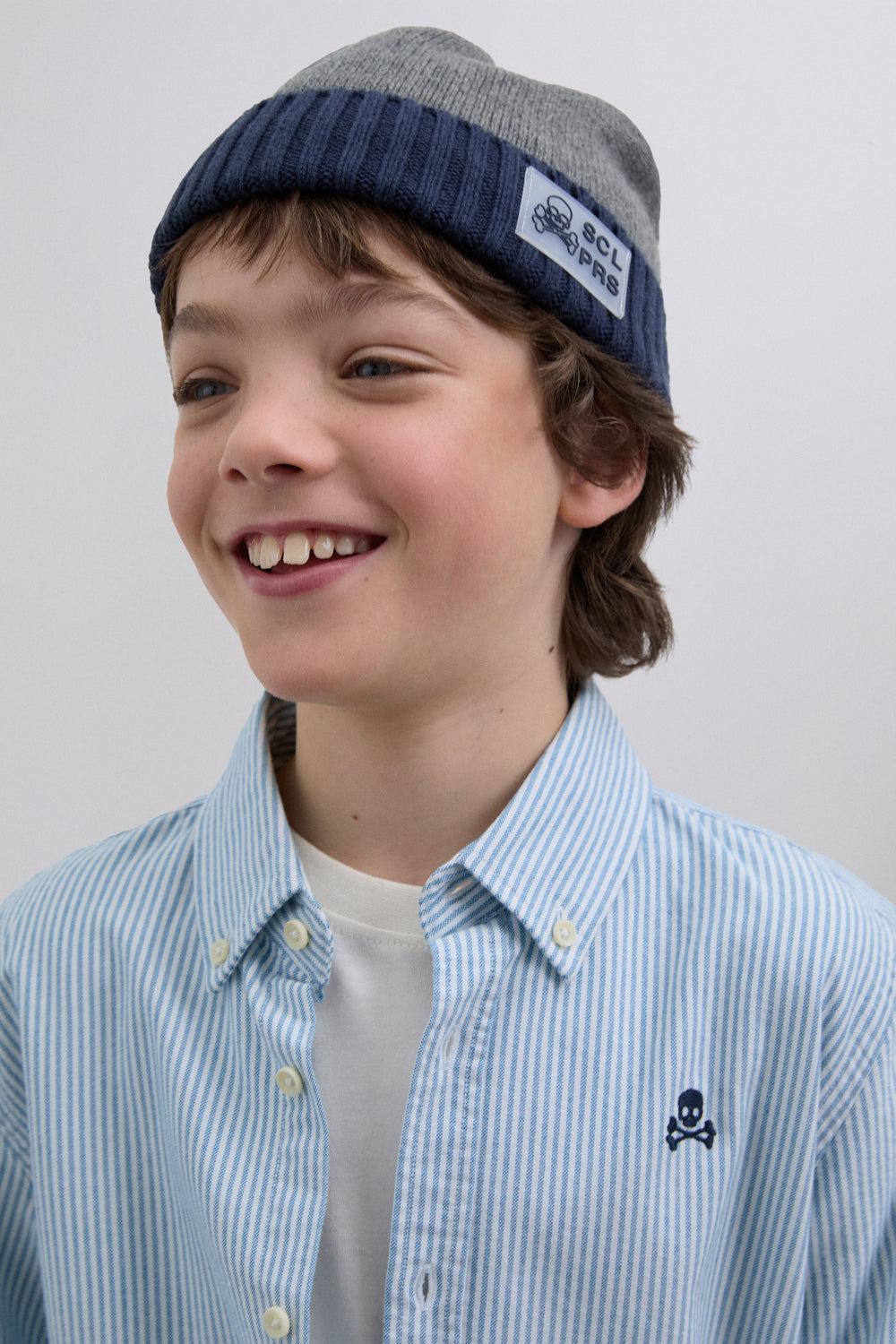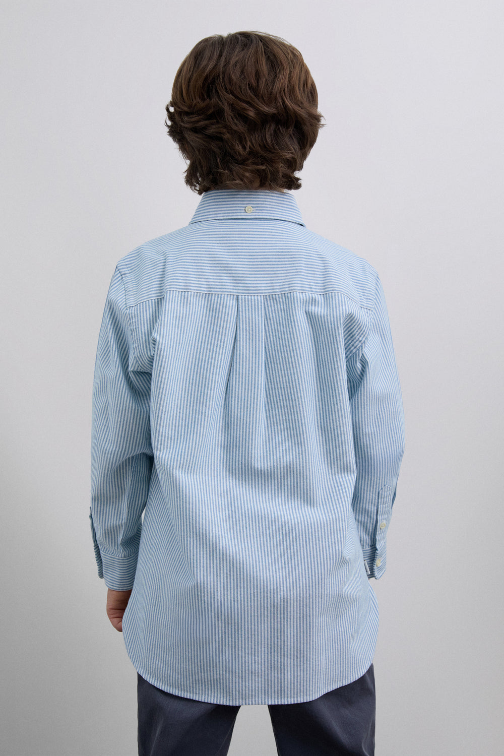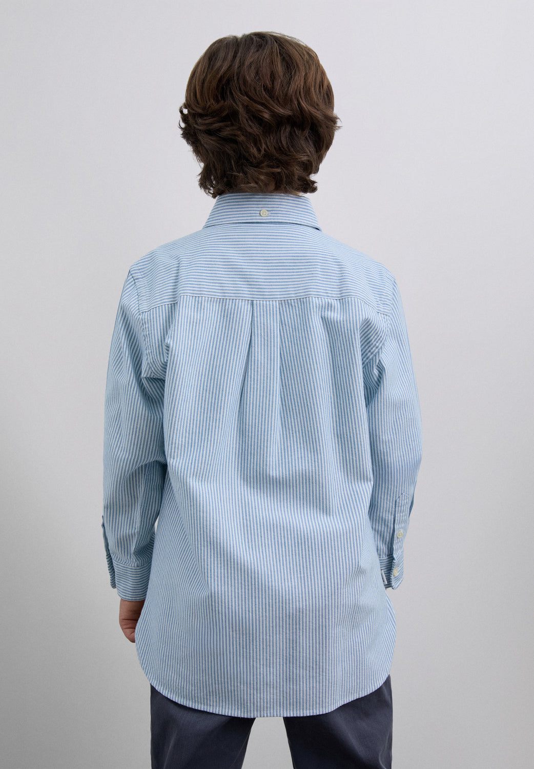 Camisa de rayas confeccionada en 100% algodón BCI. Cuello clásico, cierre con botones, regular fit, calavera en pecho a contraste. Acabado de botones en puño.