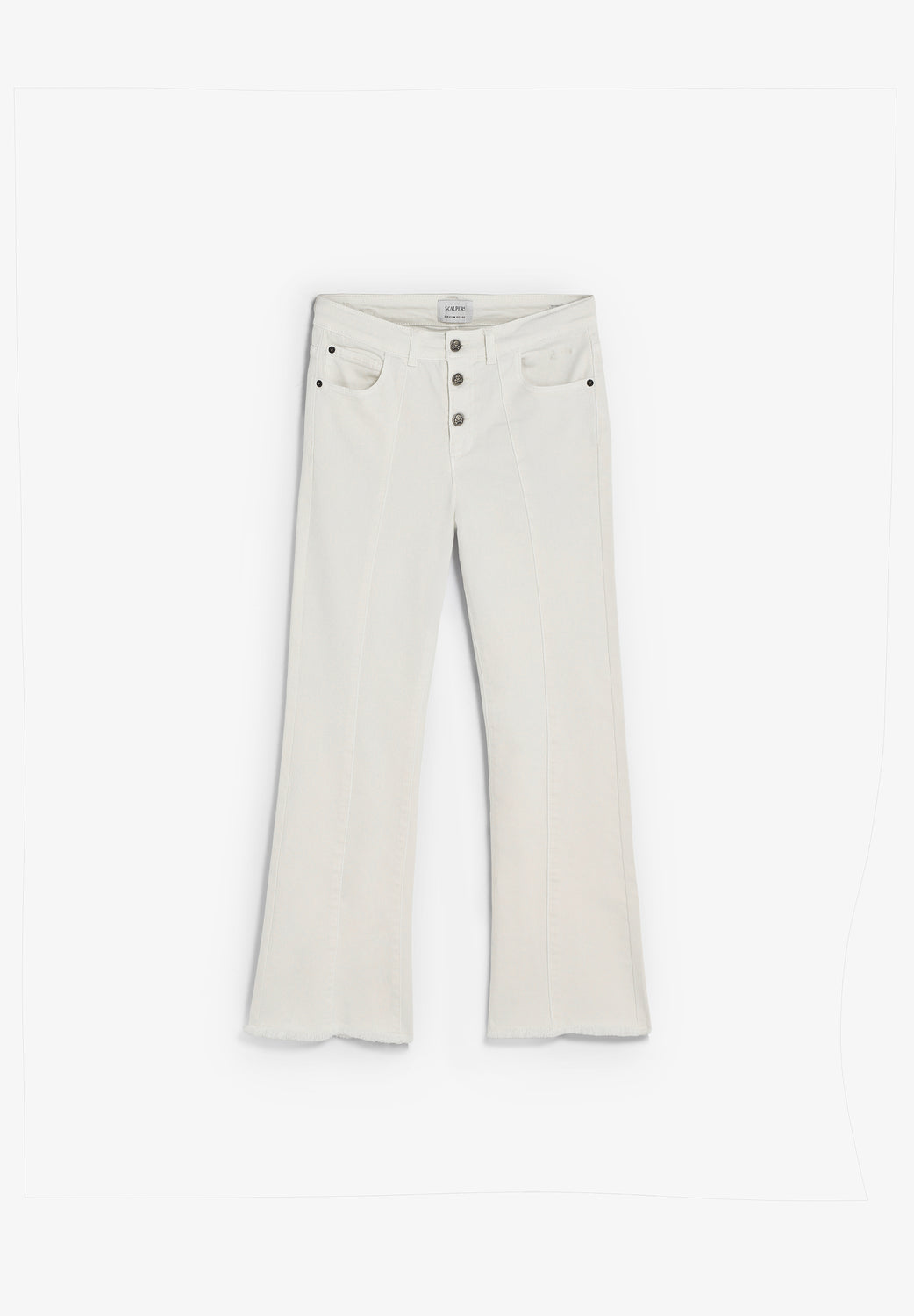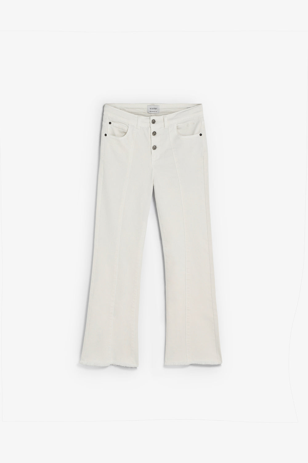 Pantalón confeccionado con algodón ligeramente elástico. Corte flare. Cierre en botones con detalles logo calavera. Bolsillos delanteros y traseros de parche. Acabado en flecado y costura frontal.