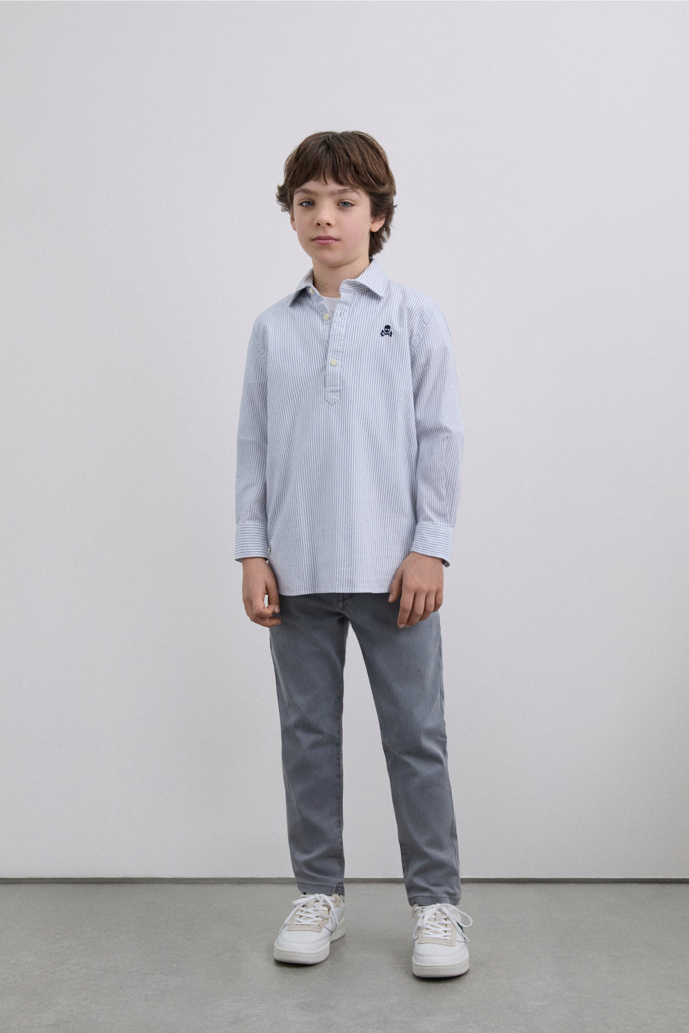 Polera de rayas confeccionada en 100% algodón BCI. Cuello clásico, cierre con botones, regular fit, calavera en pecho a contraste. Acabado de botones en puño.