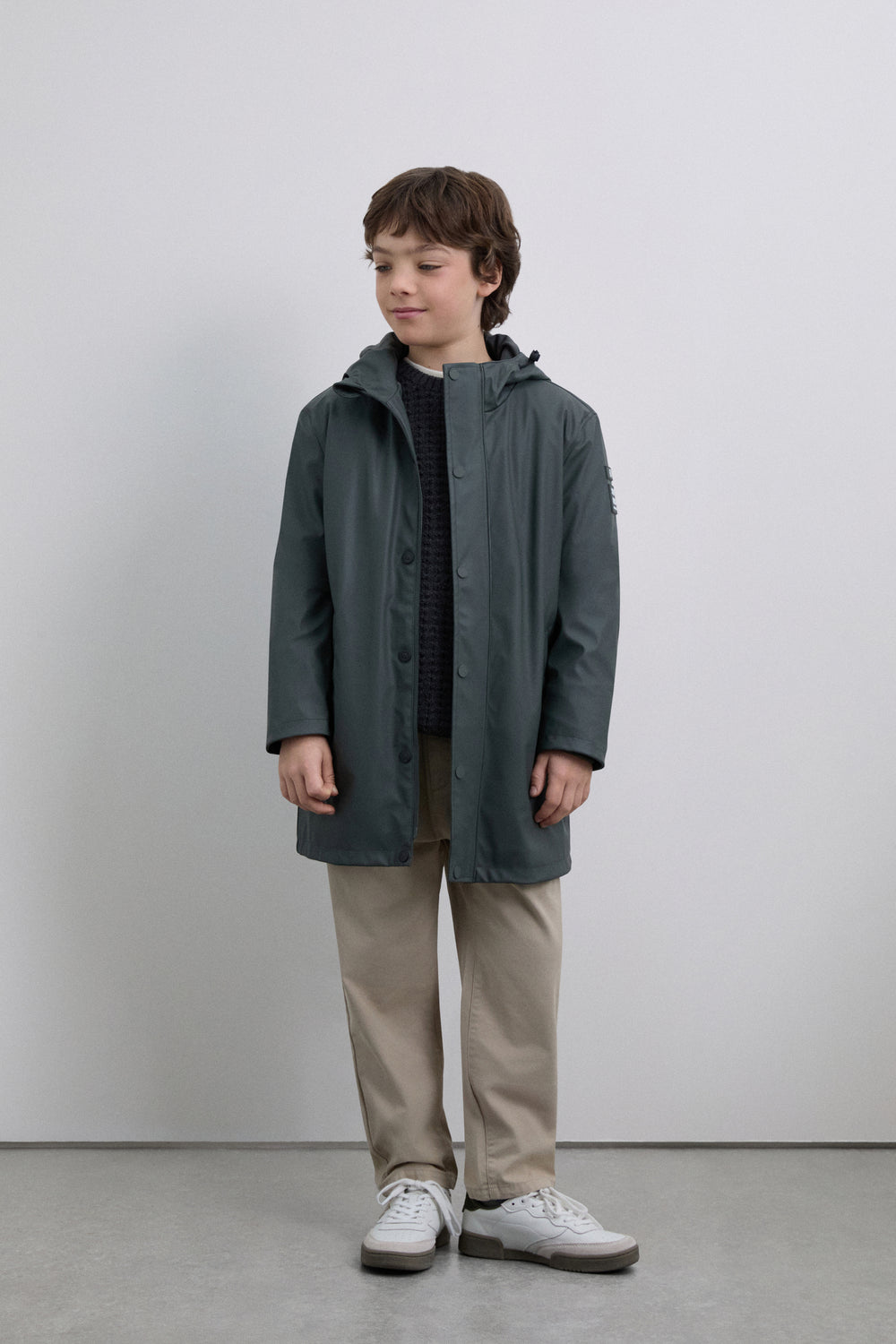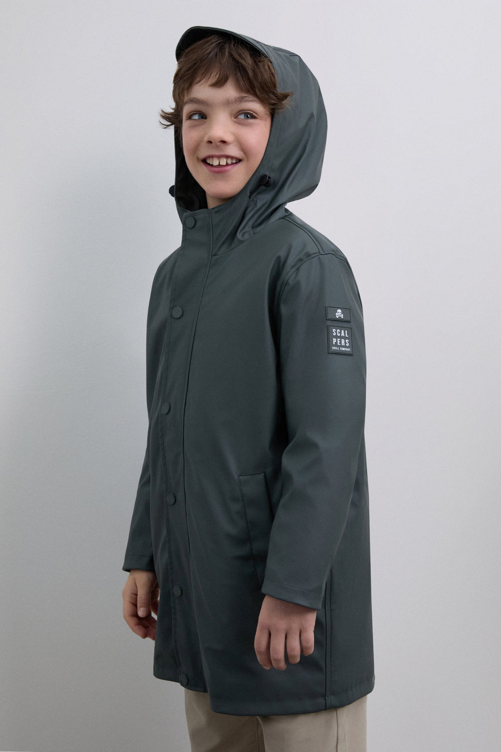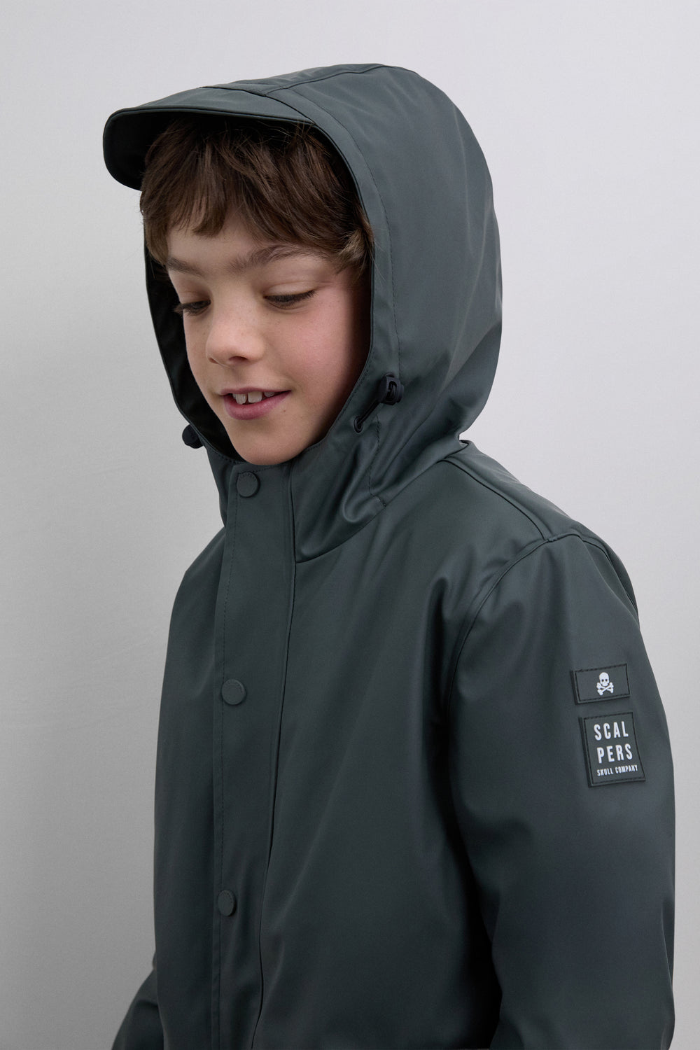 Parka impermeable con capucha ajustable. Bolsillos laterales con tapeta y snap. Forro interior sintético. Detalle de parche engomado con logo y calavera. Cierre mediante abotonadura. Manga larga.