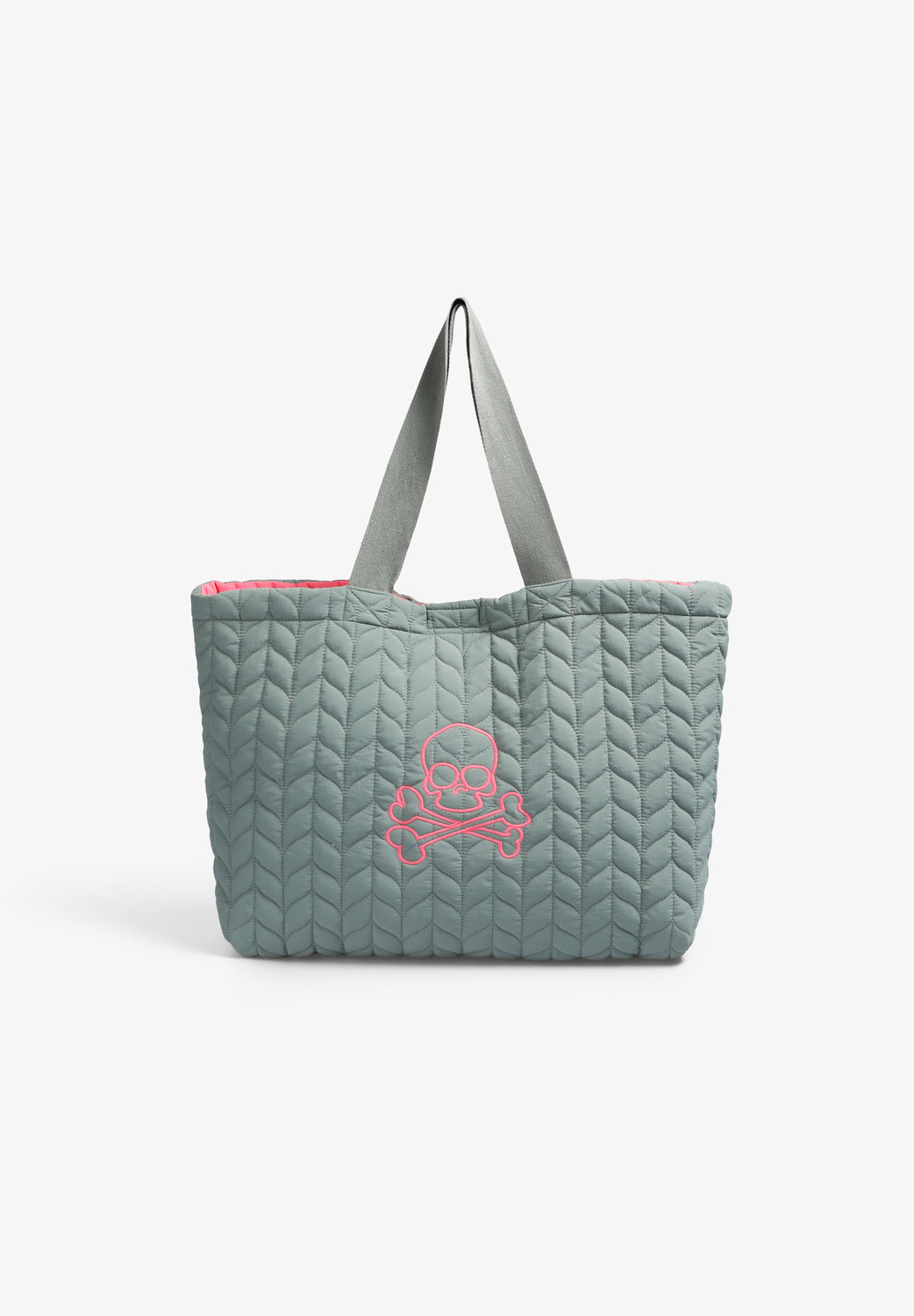 Bolsa sintética efecto acolchado. Calavera frontal bordada a contraste. Doble asa. Bolsillo interior.