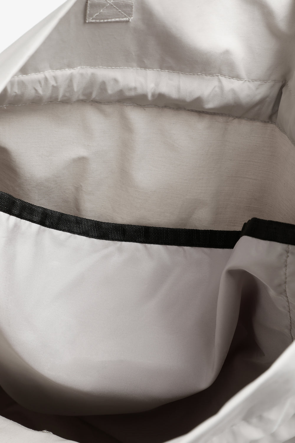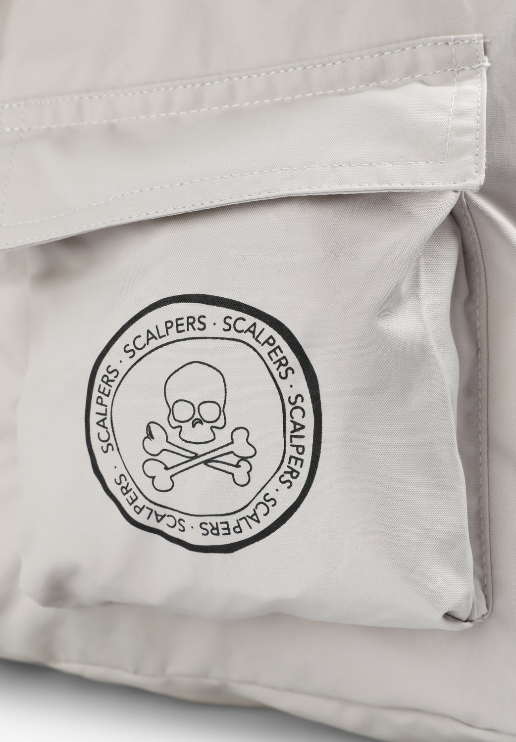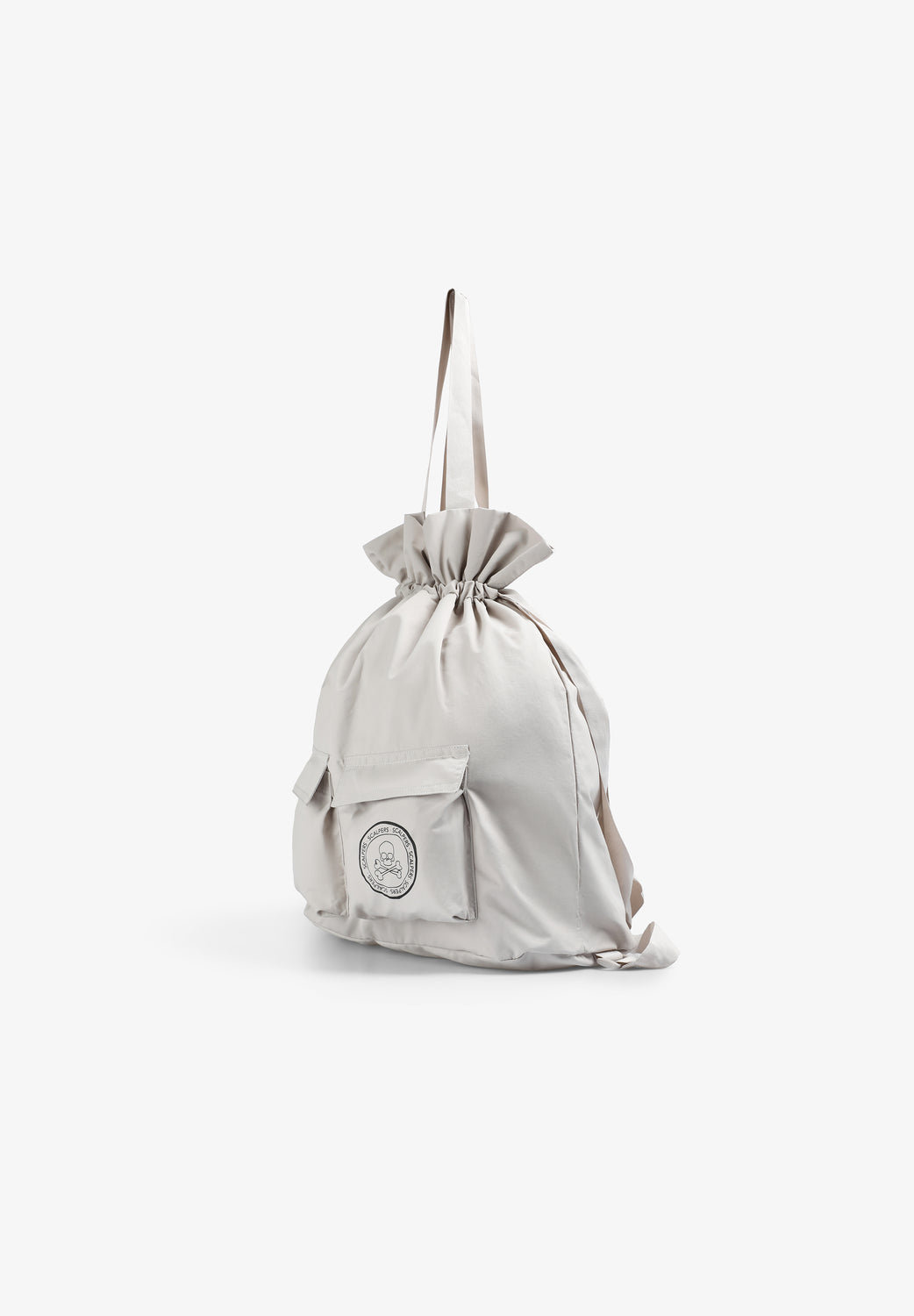 Mochila ligera con cierre en nudo. Doble asa ajustable. Dos bolsillos frontales con tapeta. Print con calavera en bolsillo. Detalle cremallera lateral a contraste.