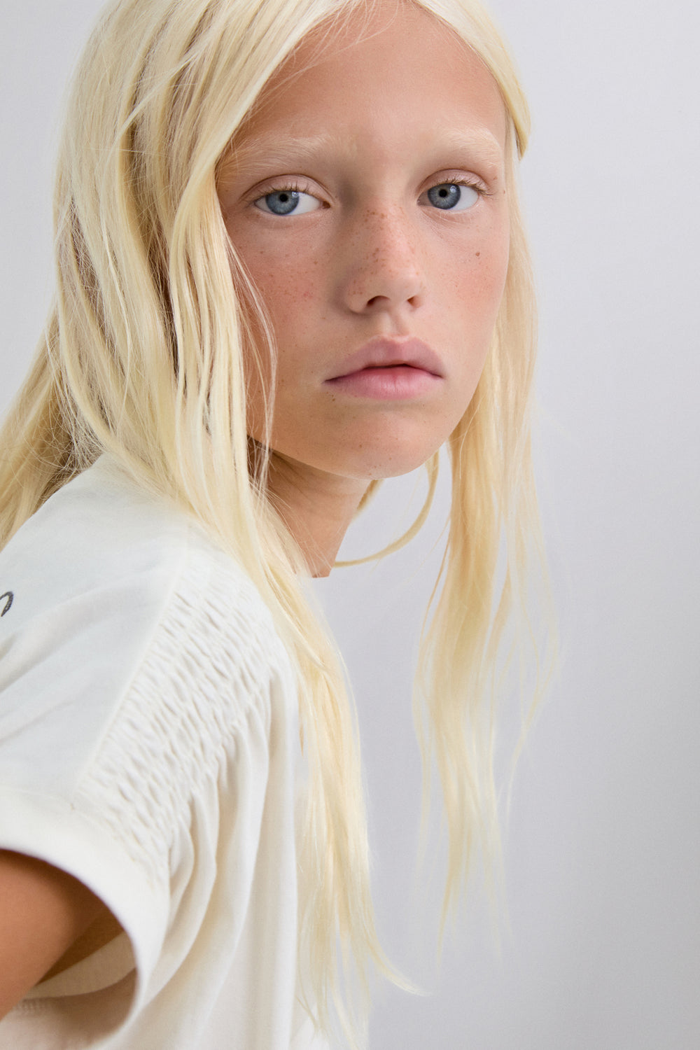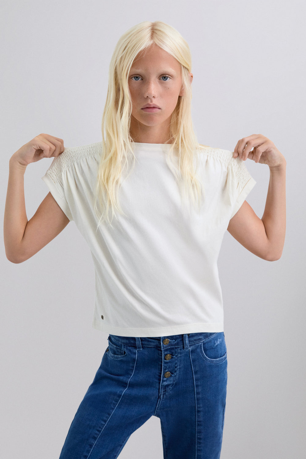 Camiseta confeccionada en 100% algodón BCI. Manga corta. Cuello redondo. Detalle de frunce en manga y calavera metálica en cintura. Print en espalda con logo bordado.