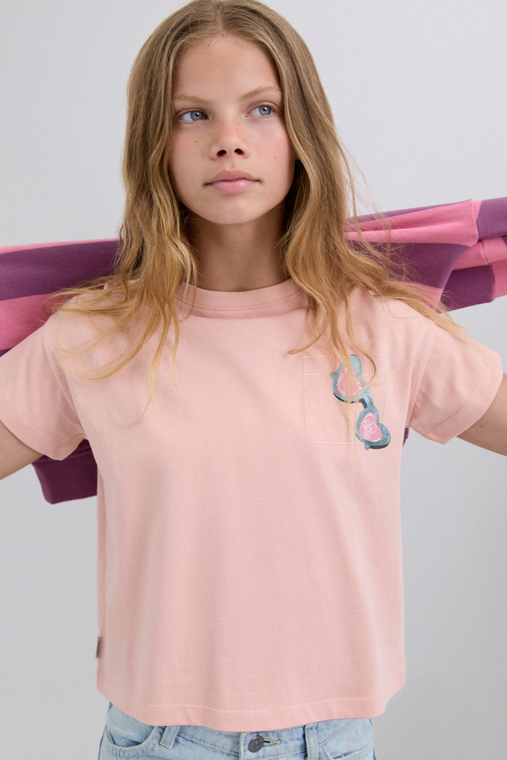 Camiseta confeccionada en 100% Algodón BCI con cuello redondo en manga corta. Detalle de bolsillo en pecho con print delantero y trasero.