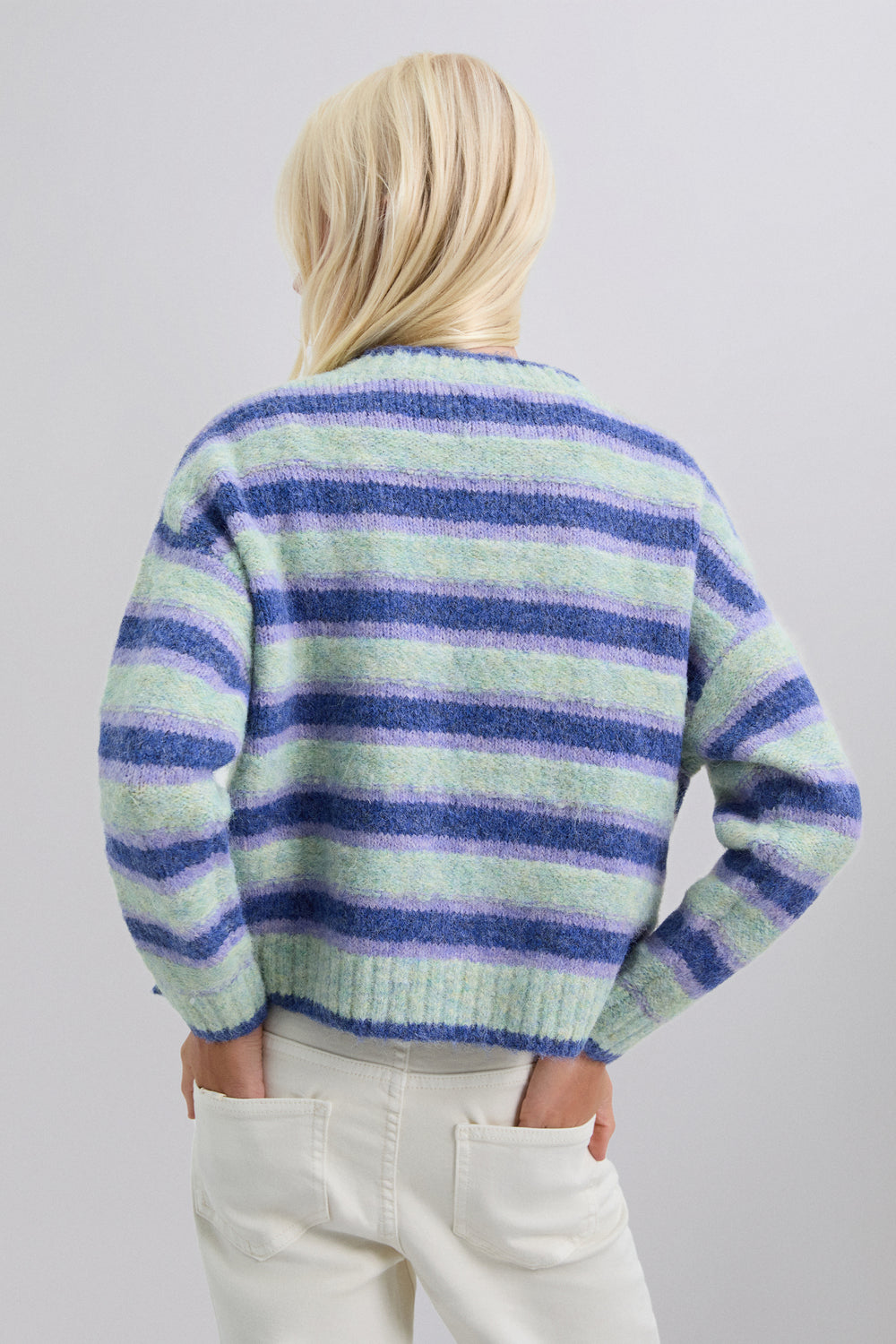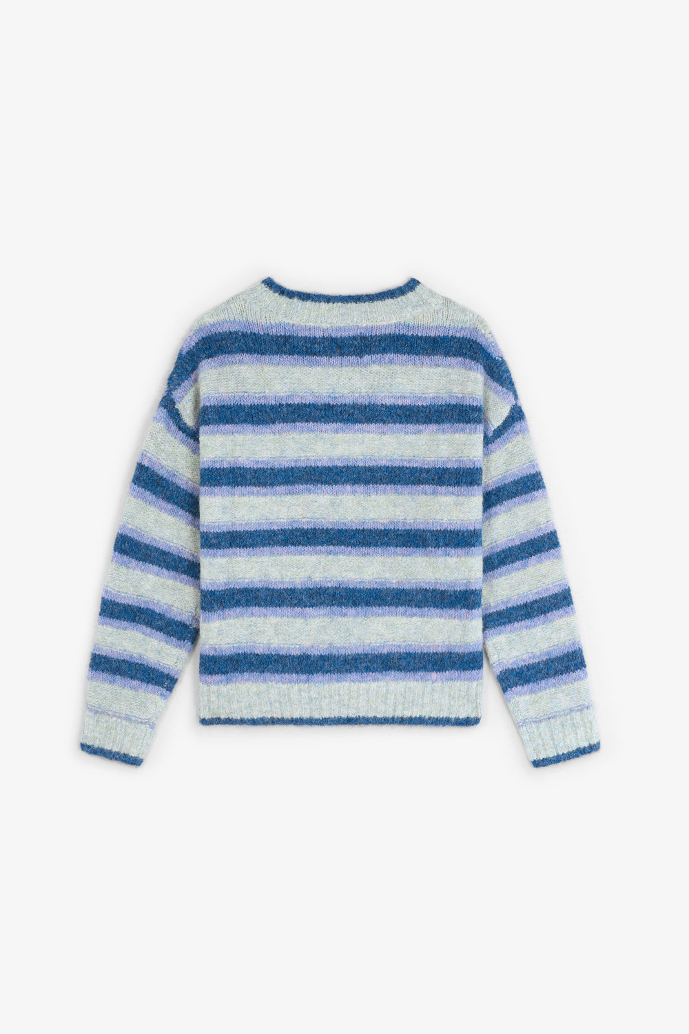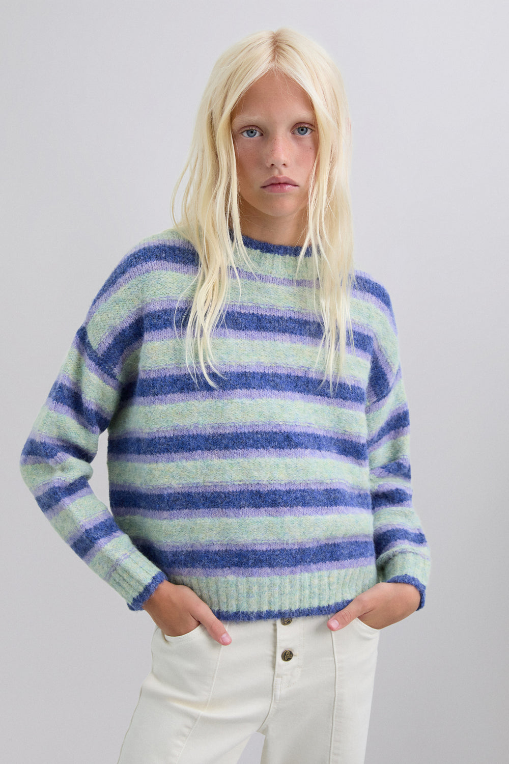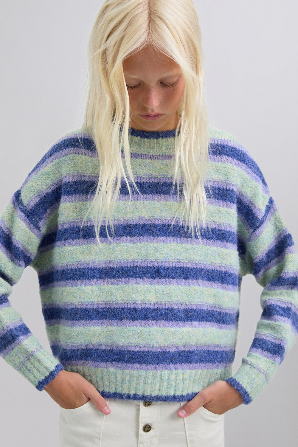Jersey de punto con estampado de rayas. Manga larga. Cuello redondo. Acabados en rib.