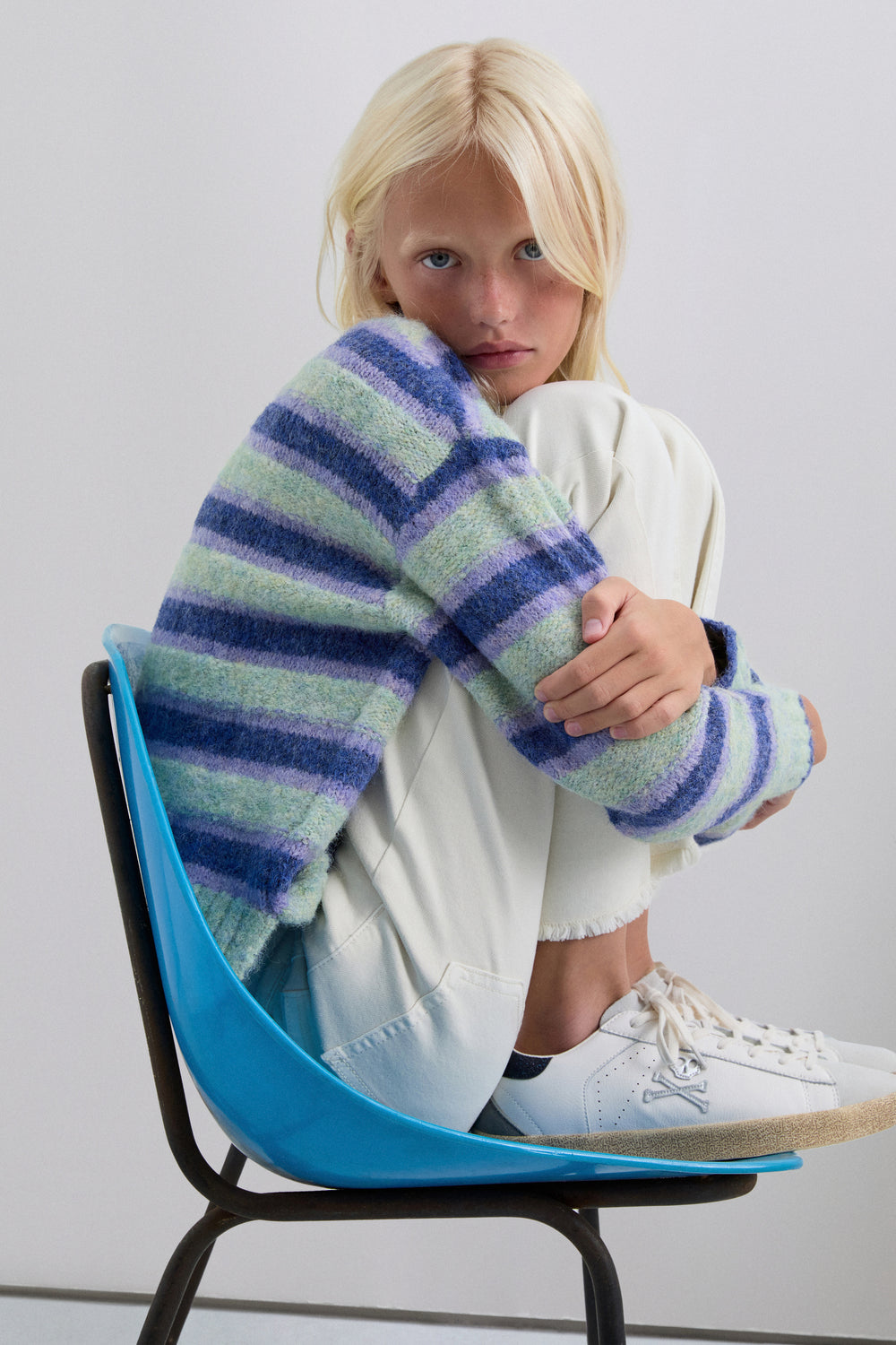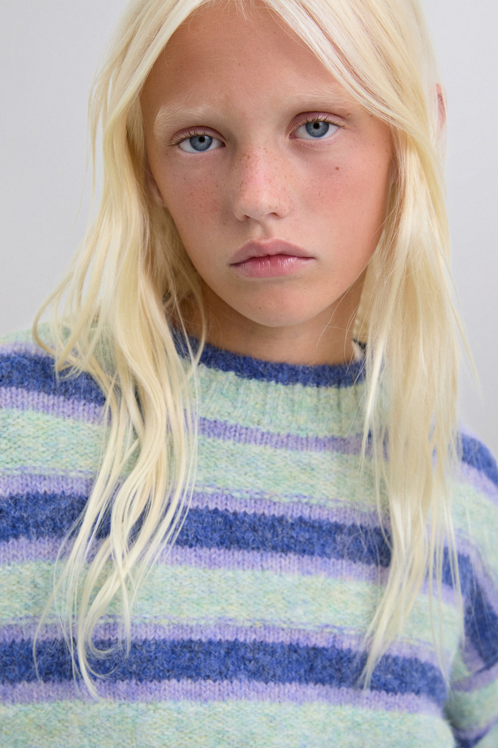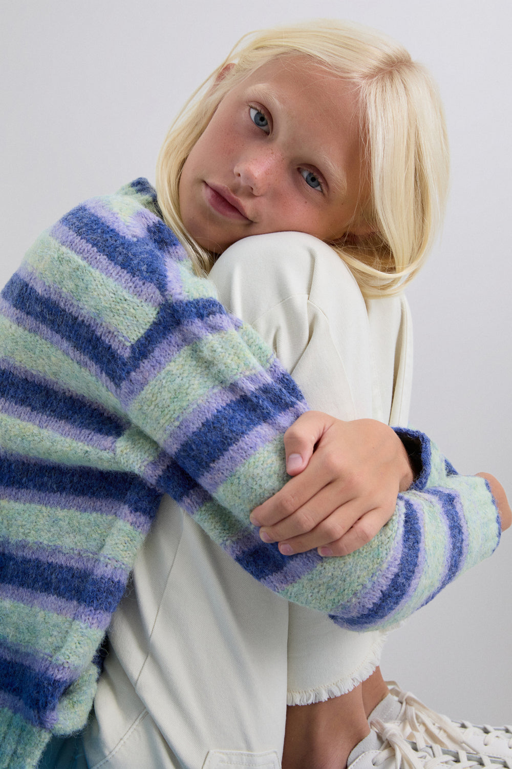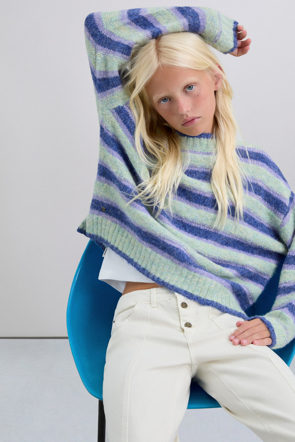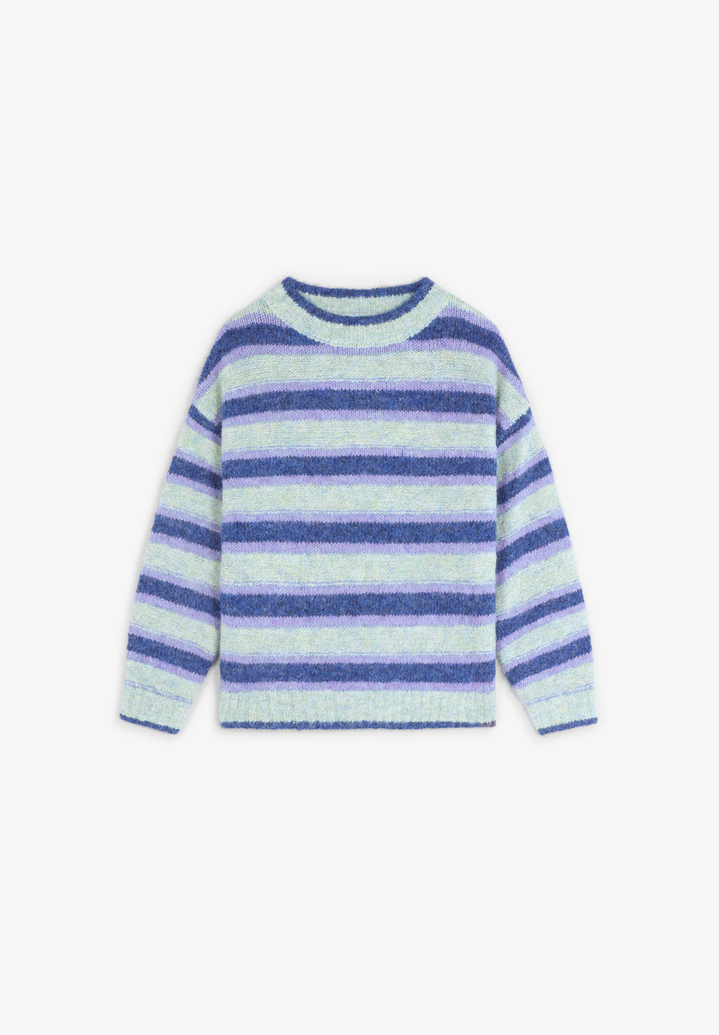 Jersey de punto con estampado de rayas. Manga larga. Cuello redondo. Acabados en rib.