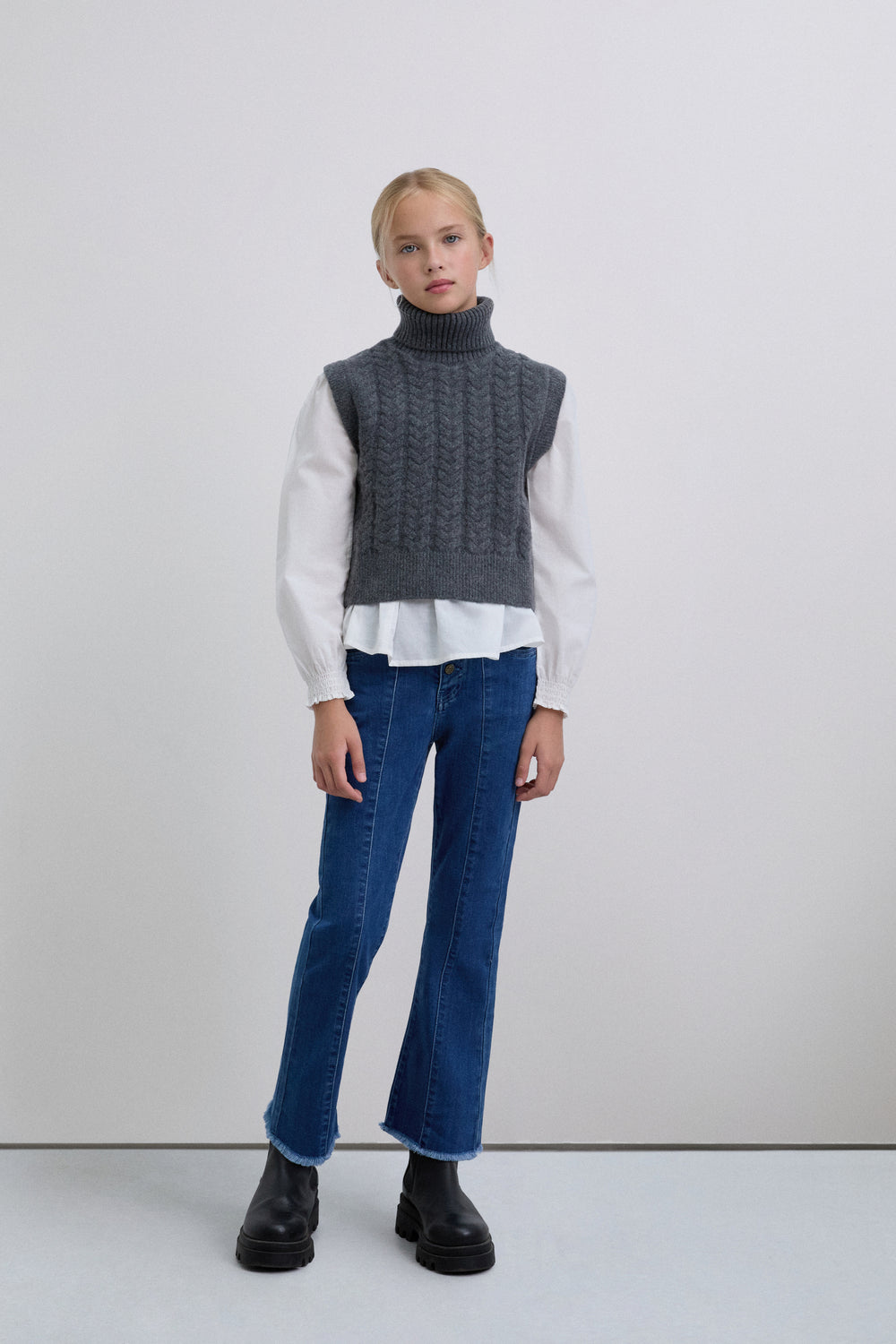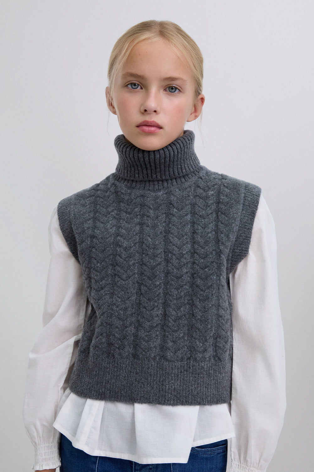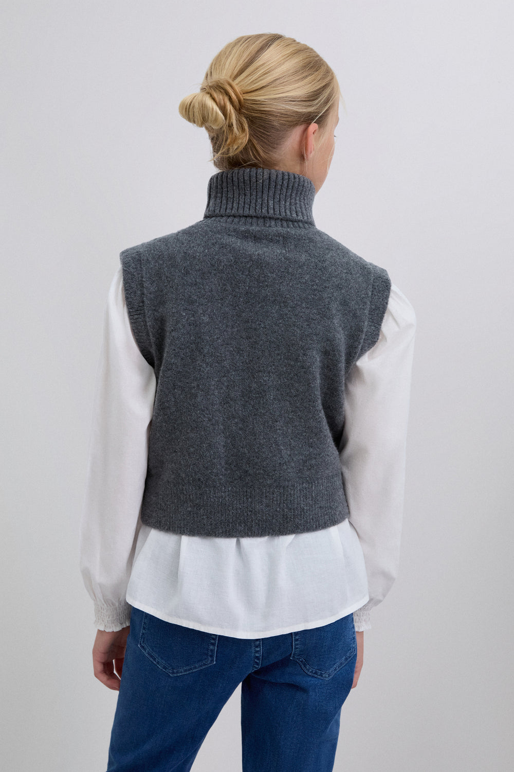 Chaleco de punto. Cuello vuelto. Acabados en rib. Detalle de calavera en chapa metálica.
