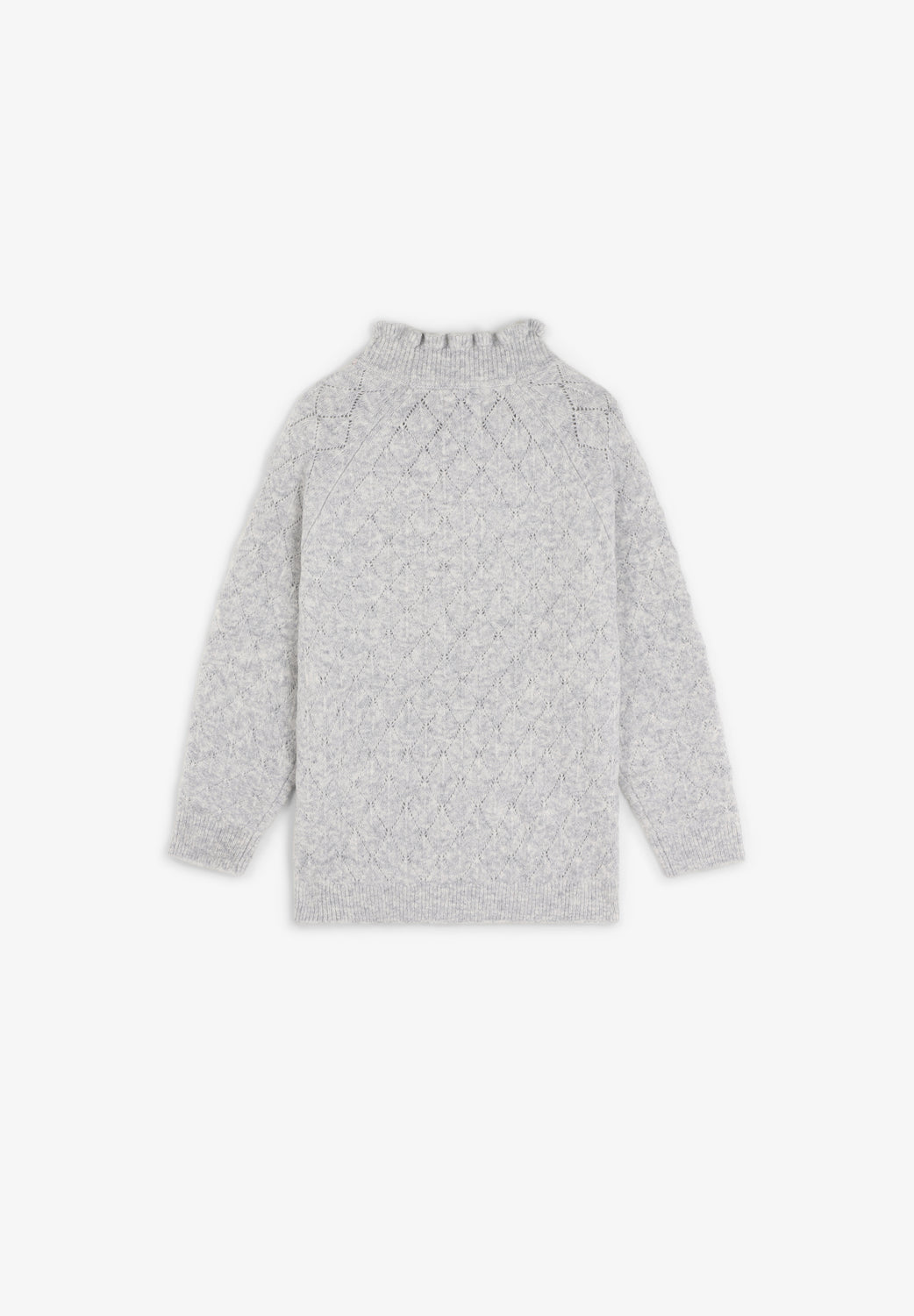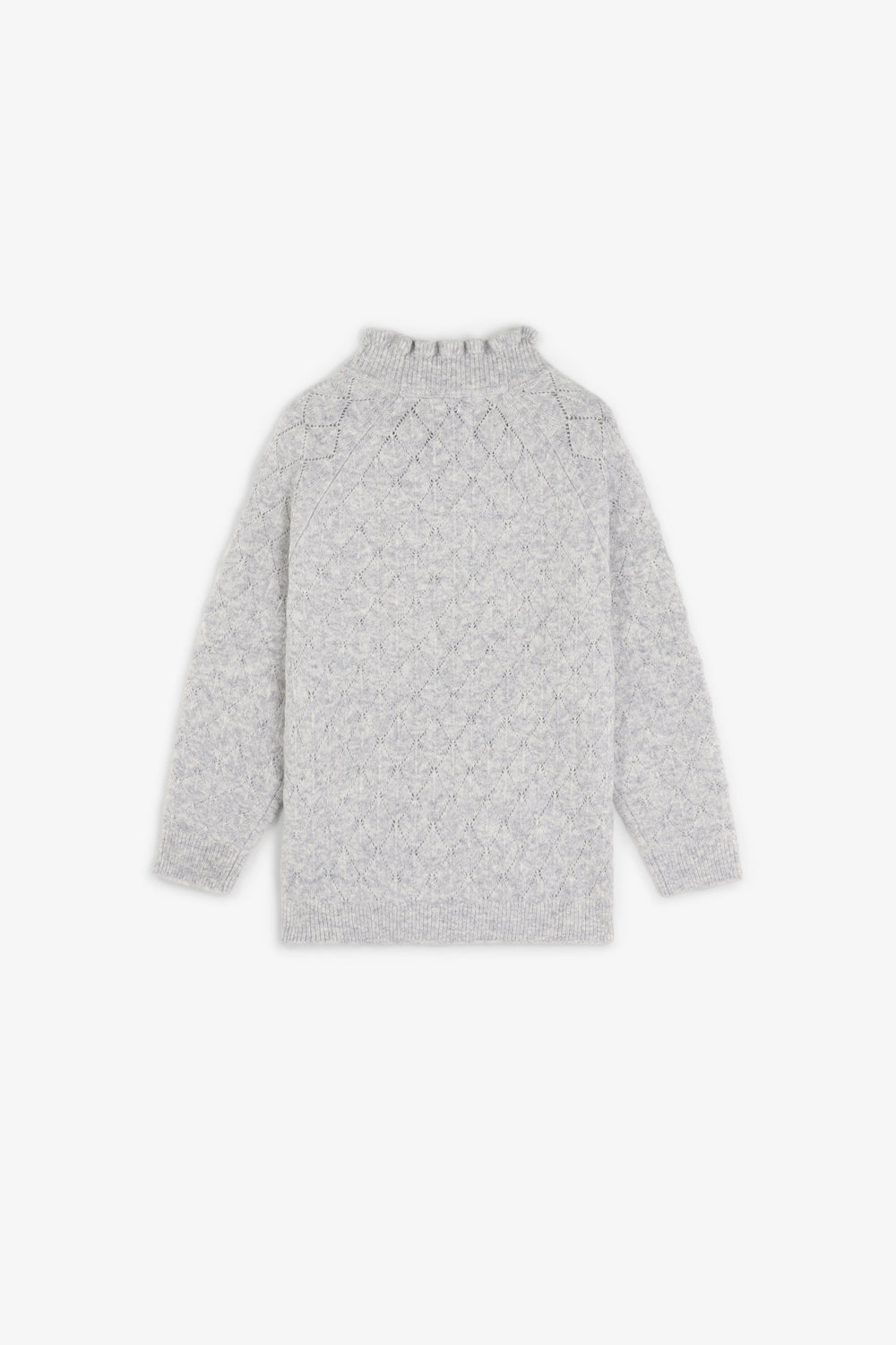 Jersey de punto confeccionado en mezcla de lana merino. Cuello perkins con volantes. Manga larga con acabados acanalados. Motivo perforado de rombos.