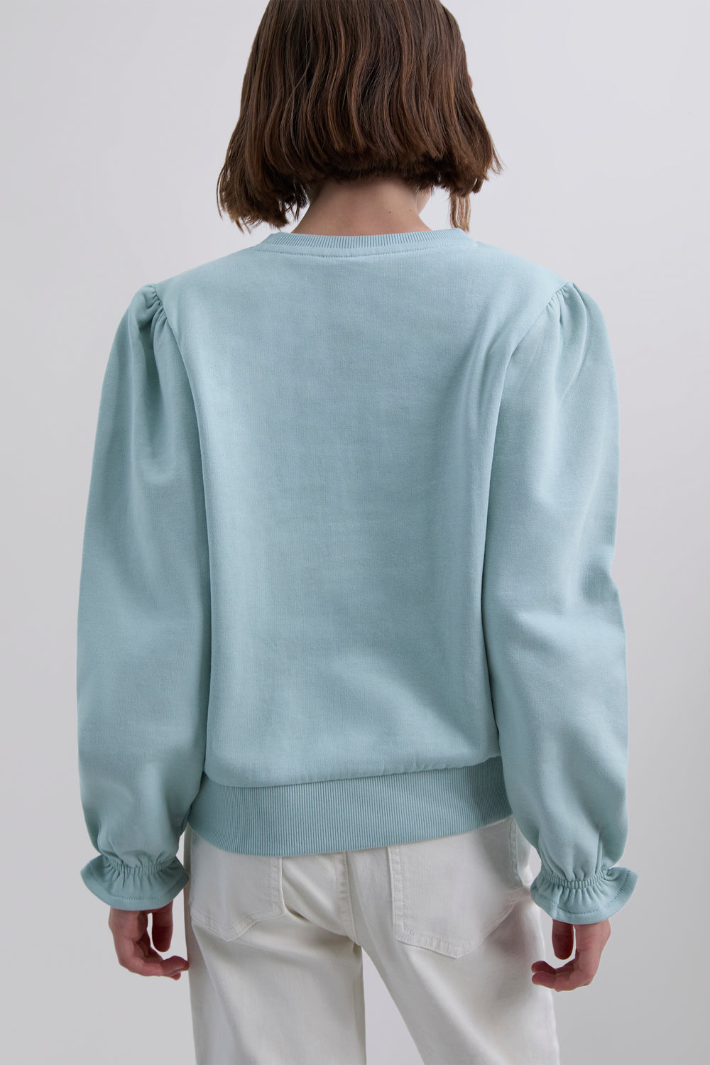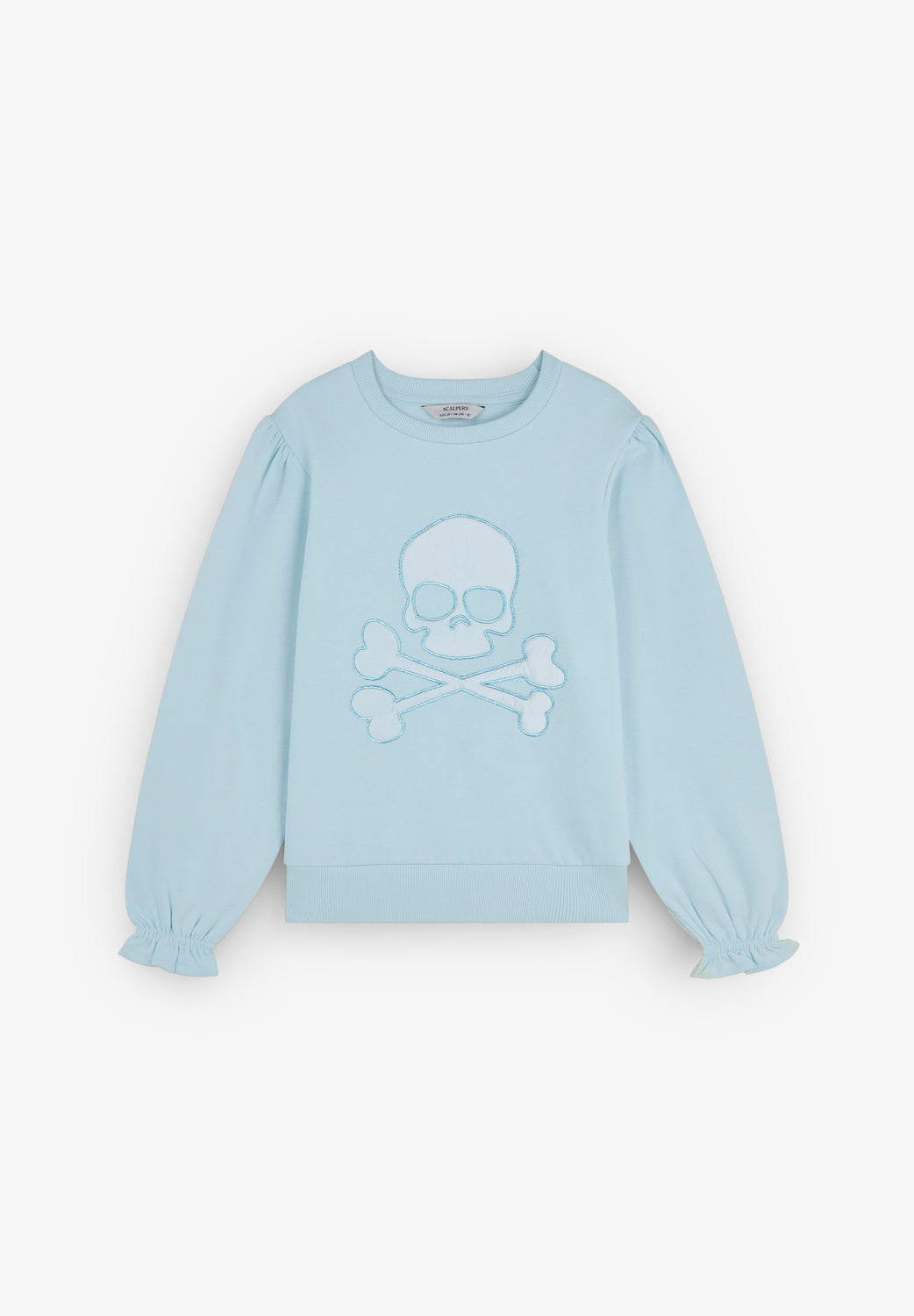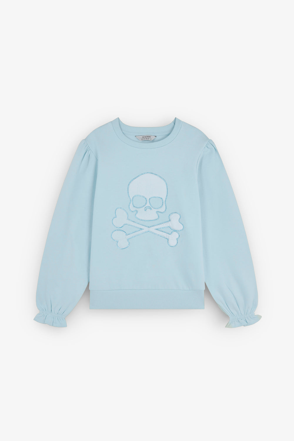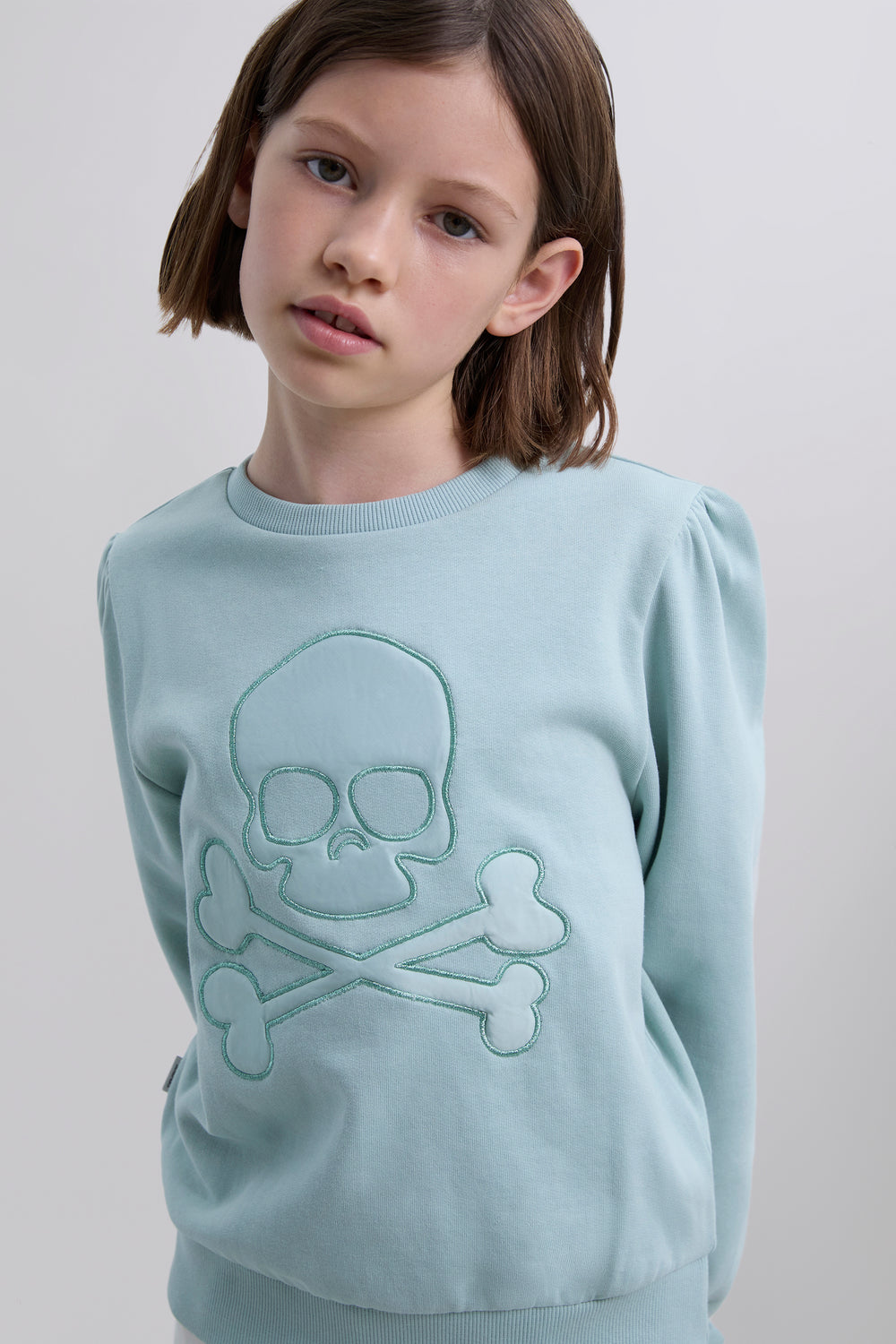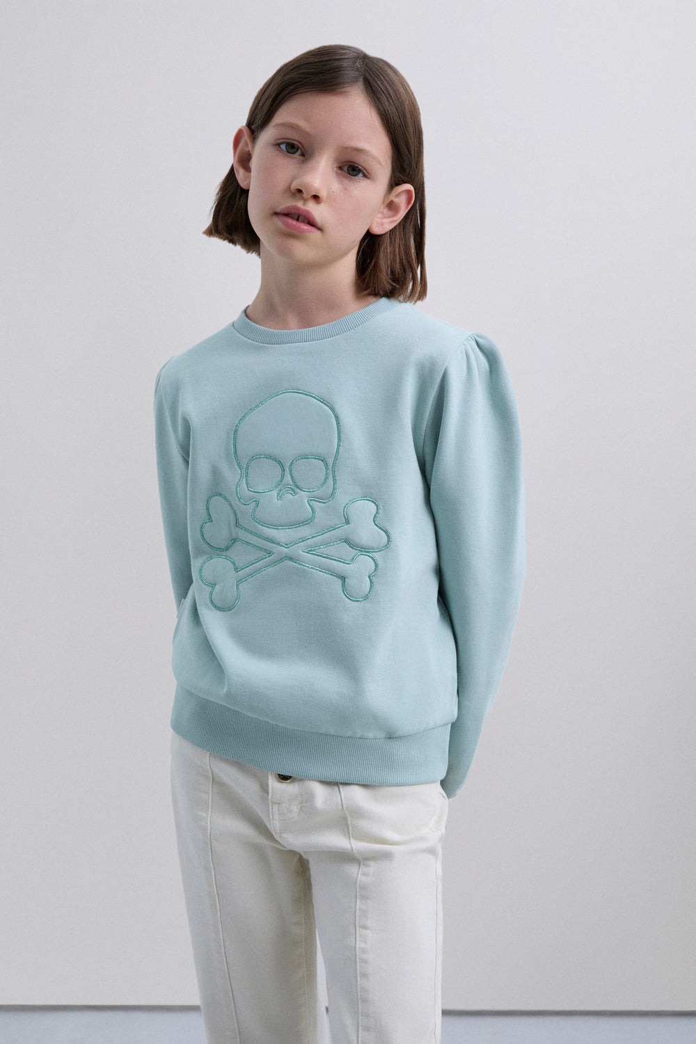 Sudadera confeccionada en 100% algodón BCI. Cuello redondo. Calavera bordada frontal. Manga larga. Detalle de frunces en puños elásticos