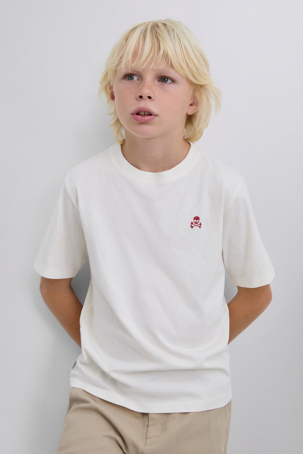 Camiseta confeccionada en 100% algodón BCI. Regular fit, manga corta y cuello redondo. Calavera en pecho y print en espalda.