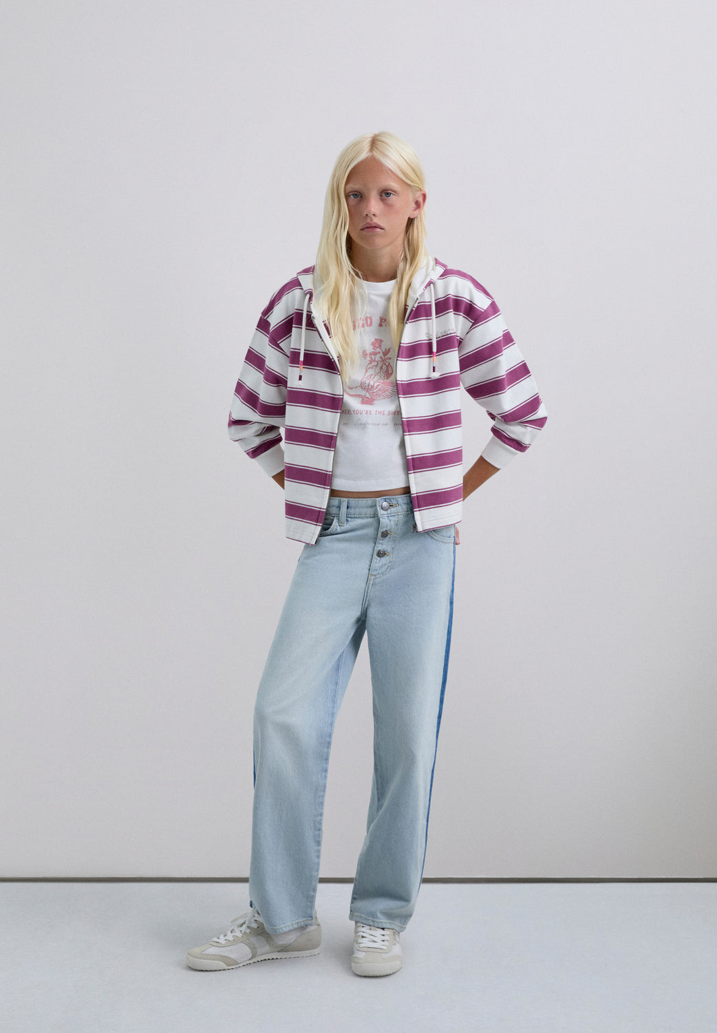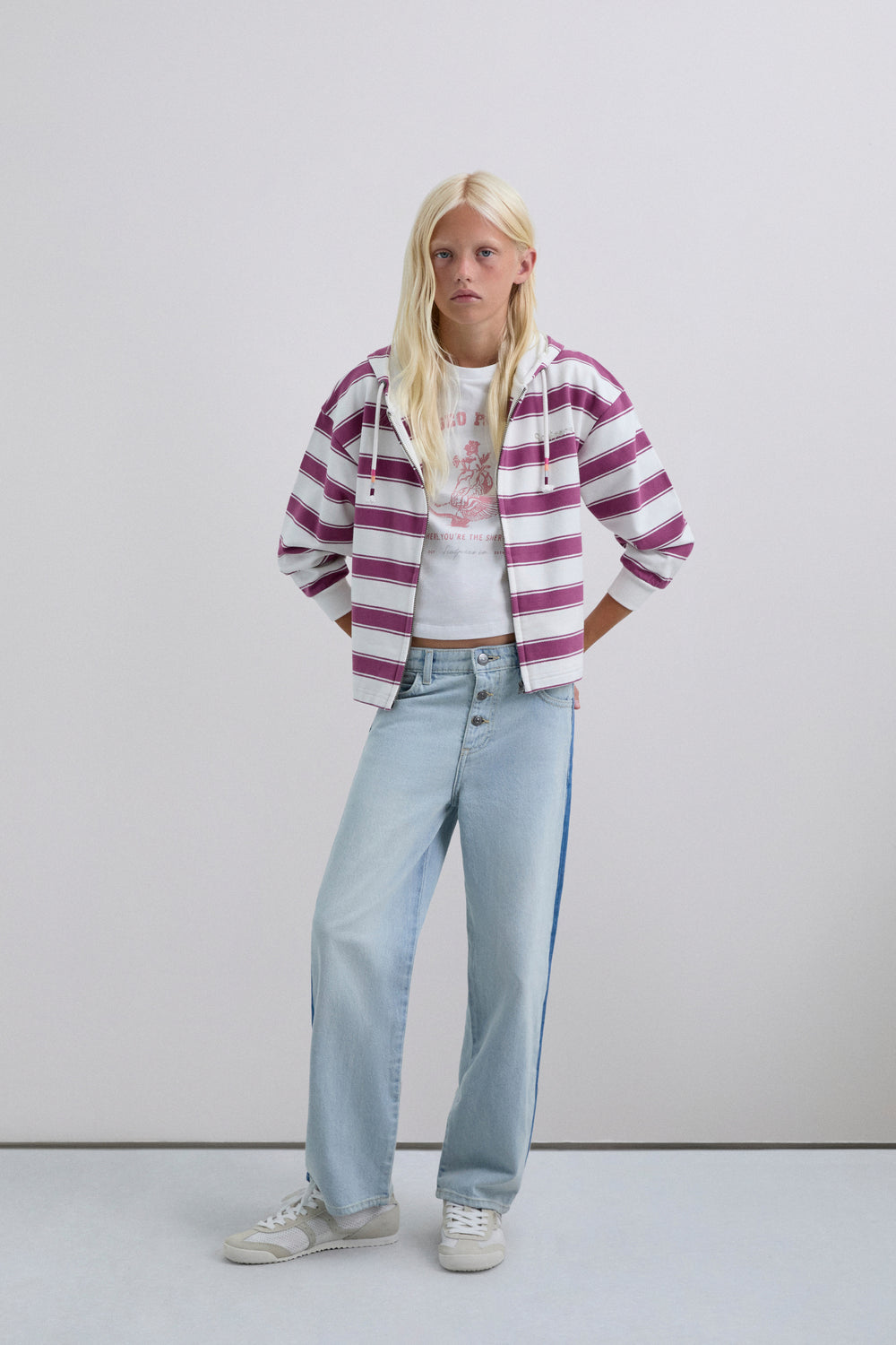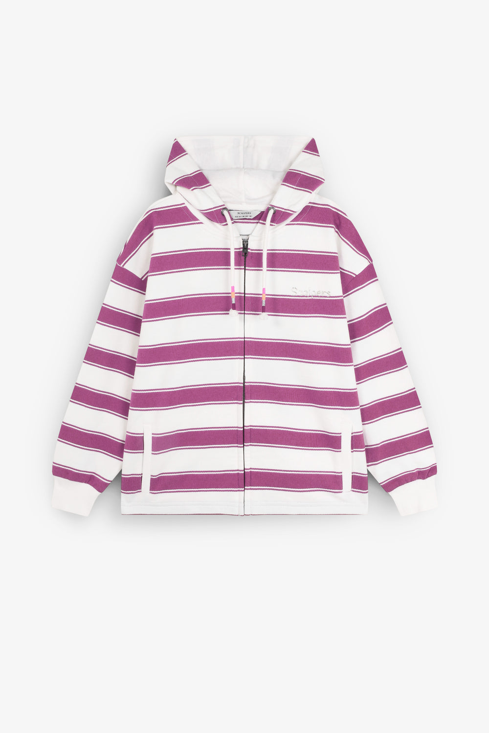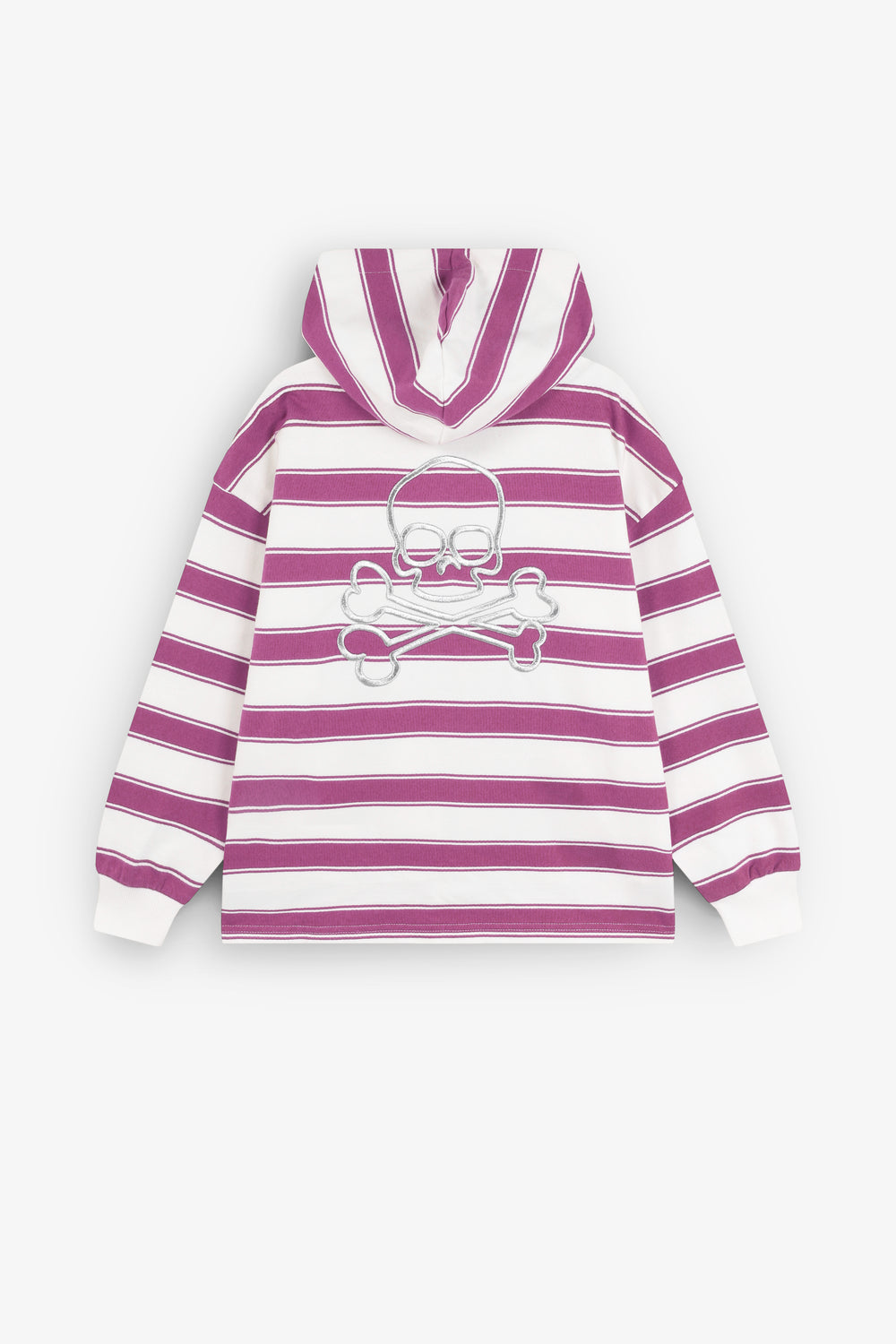 Sudadera confeccionada en 100% algodón BCI. Capucha ajustable mediante cordón. Manga larga. Cierre con cremallera. Estampado de rayas. Logo en pecho y calavera bordada en espalda.