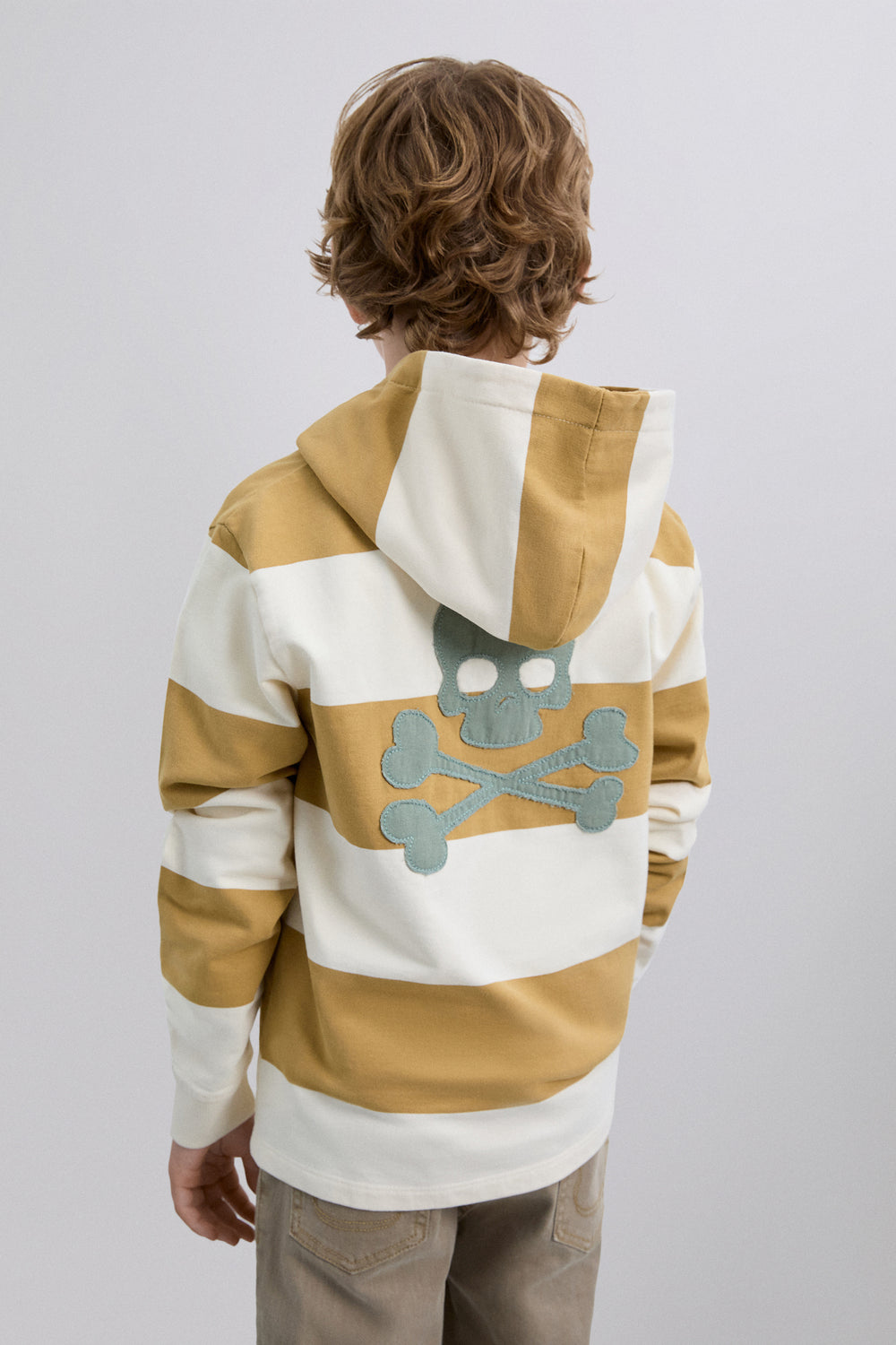 Sudadera con capucha ajustable mediante cordón confeccionada en 100% algodón BCI. Estampado de rayas. Motivo bordado en pecho y calavera en espalda. Abertura media mediante botón en frontal.