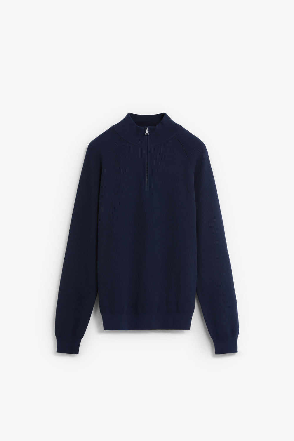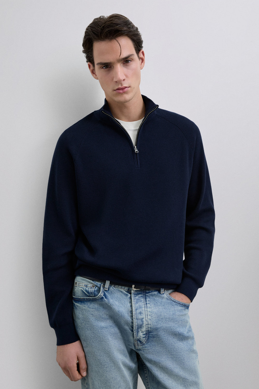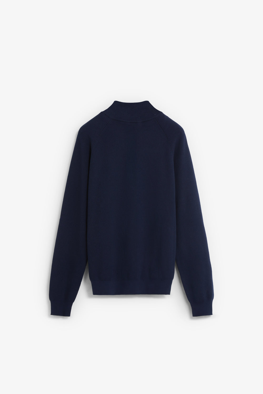 Jersey confeccionado en 100% algodón BCI. Manga larga. Cuello mock con cremallera.